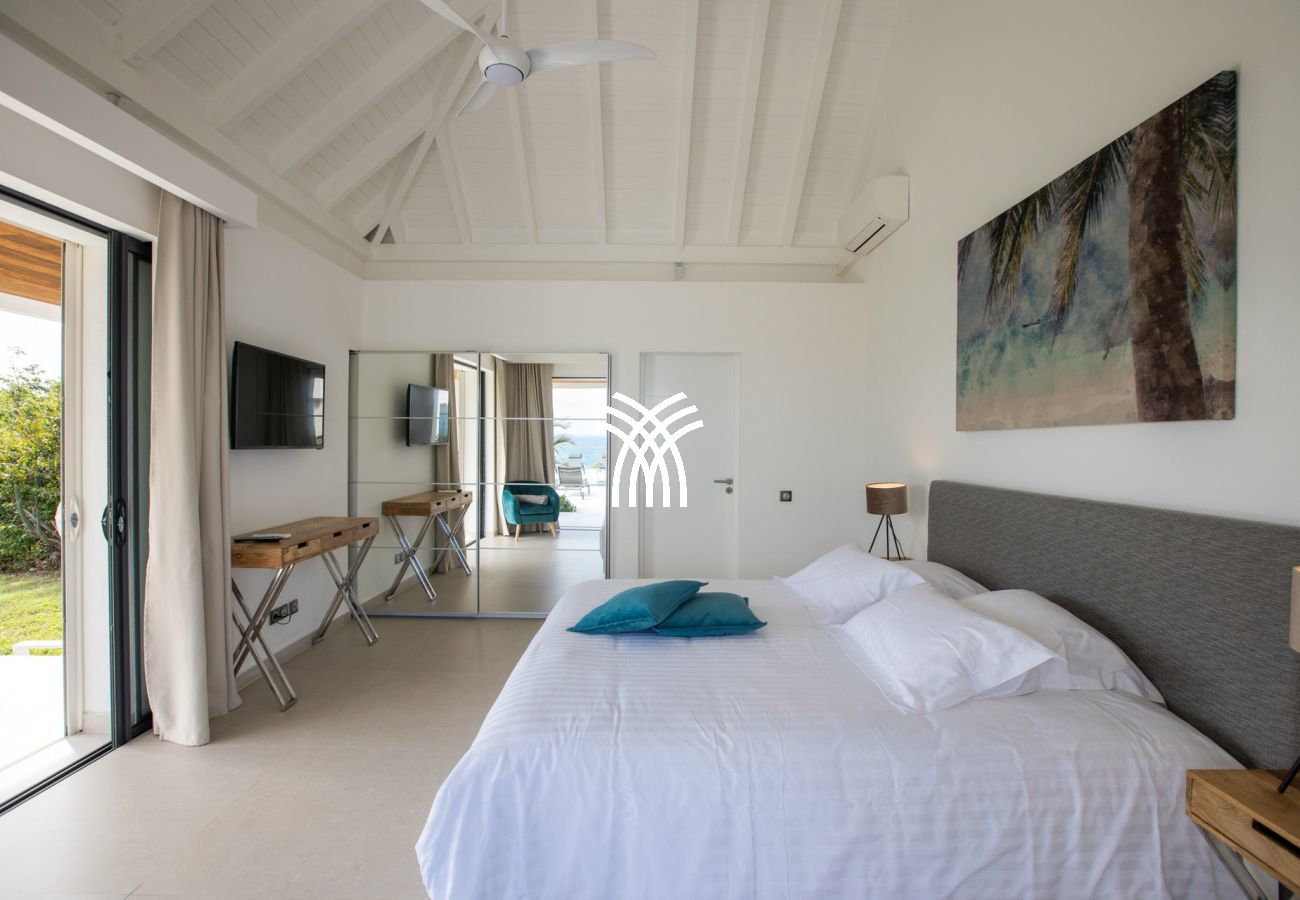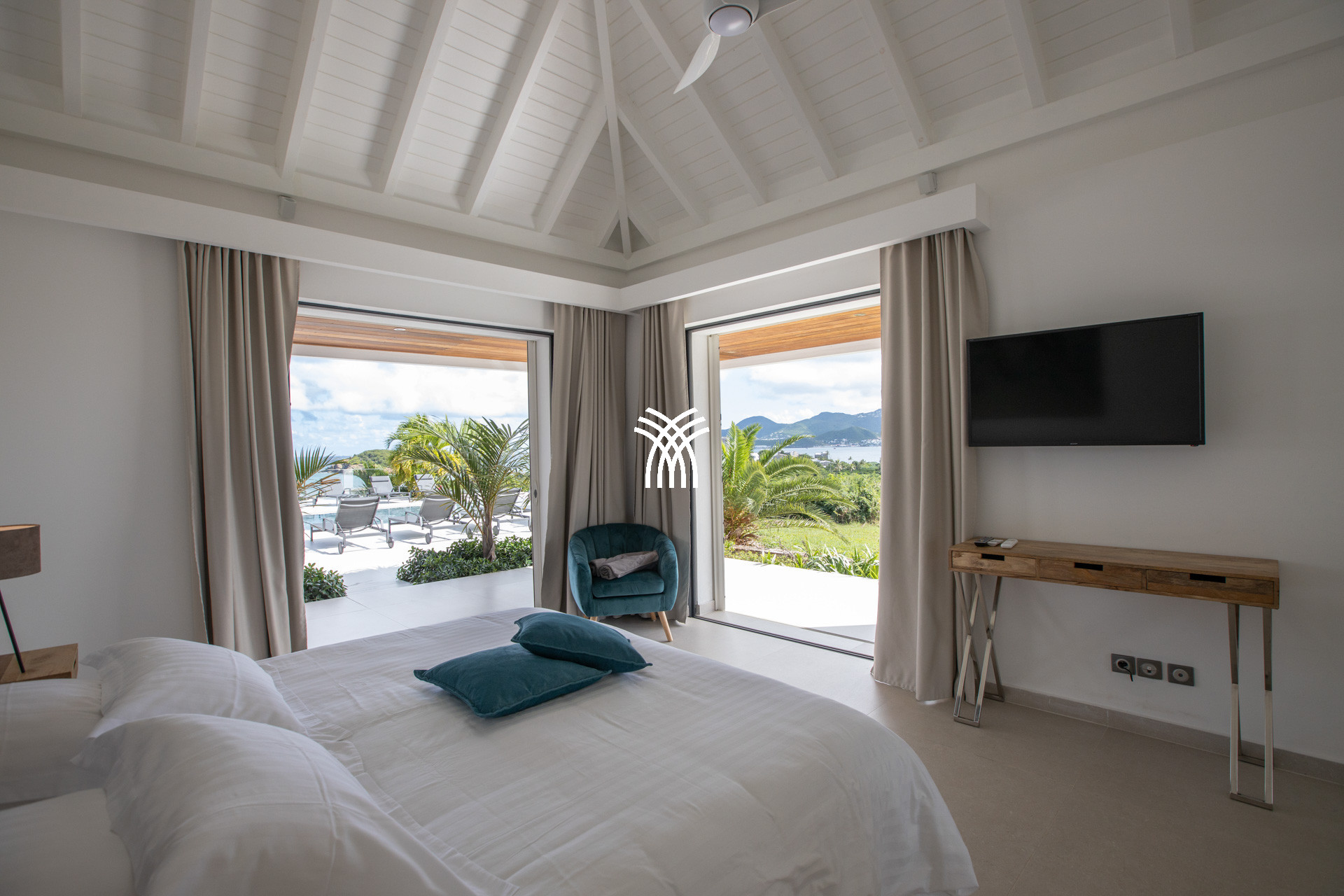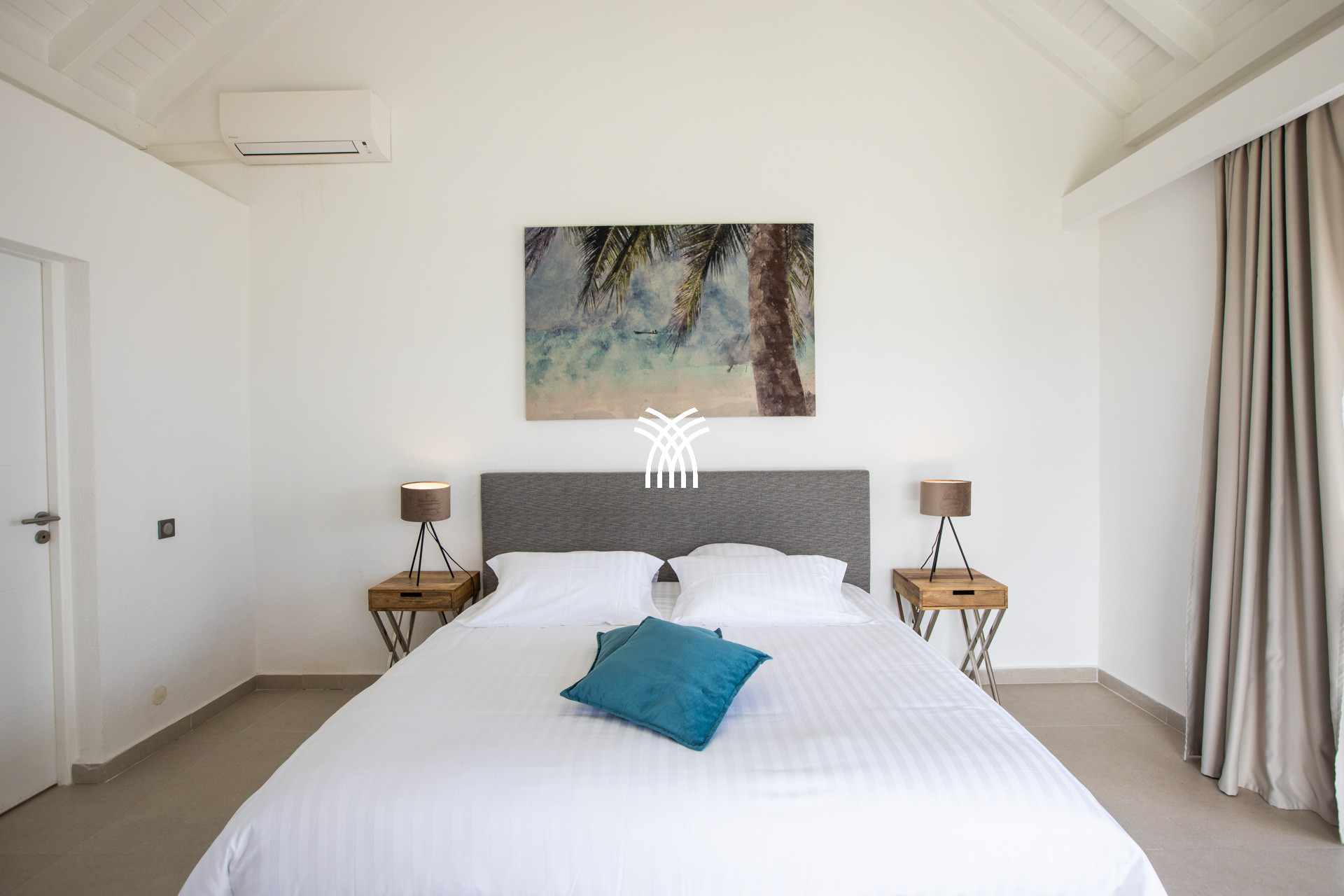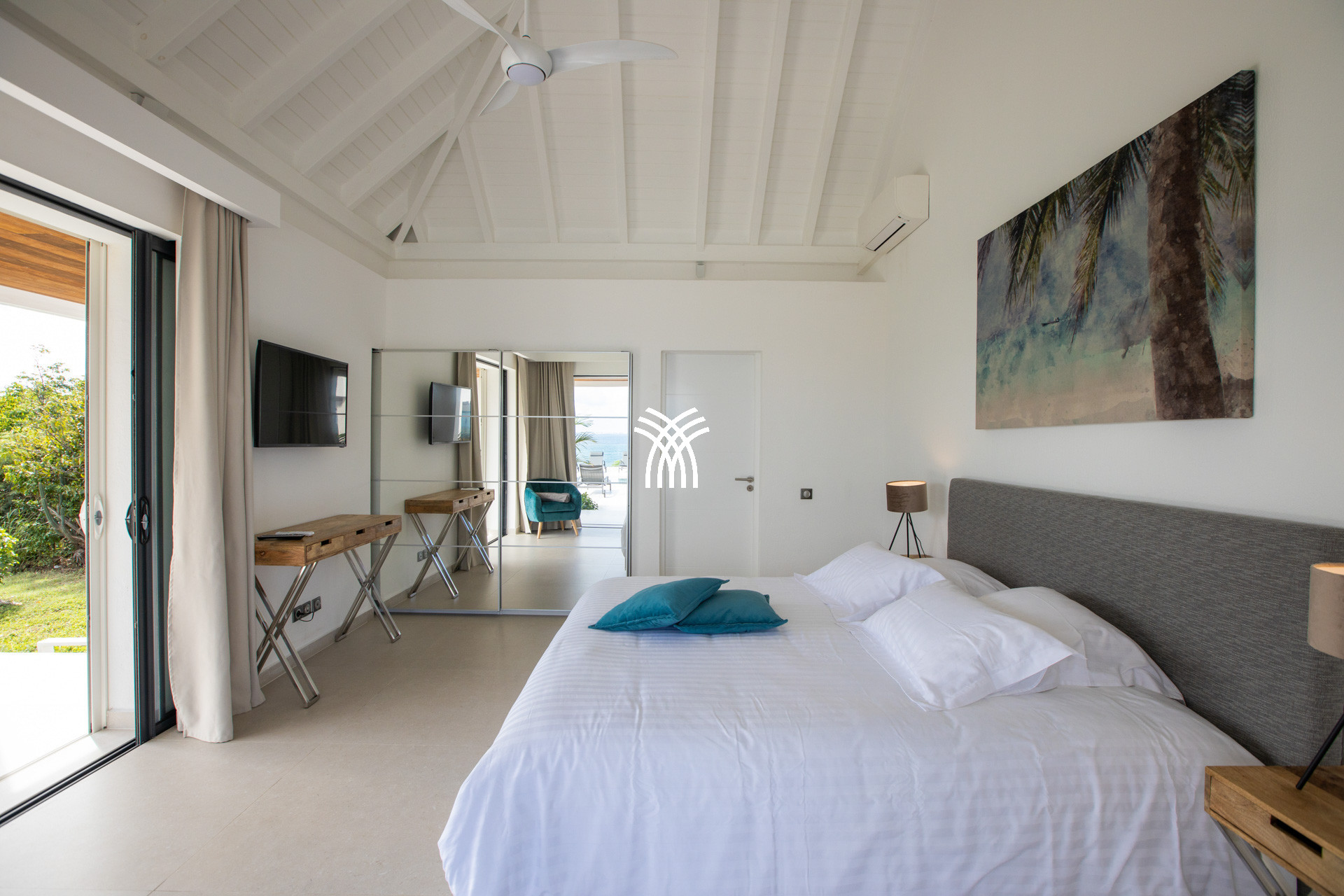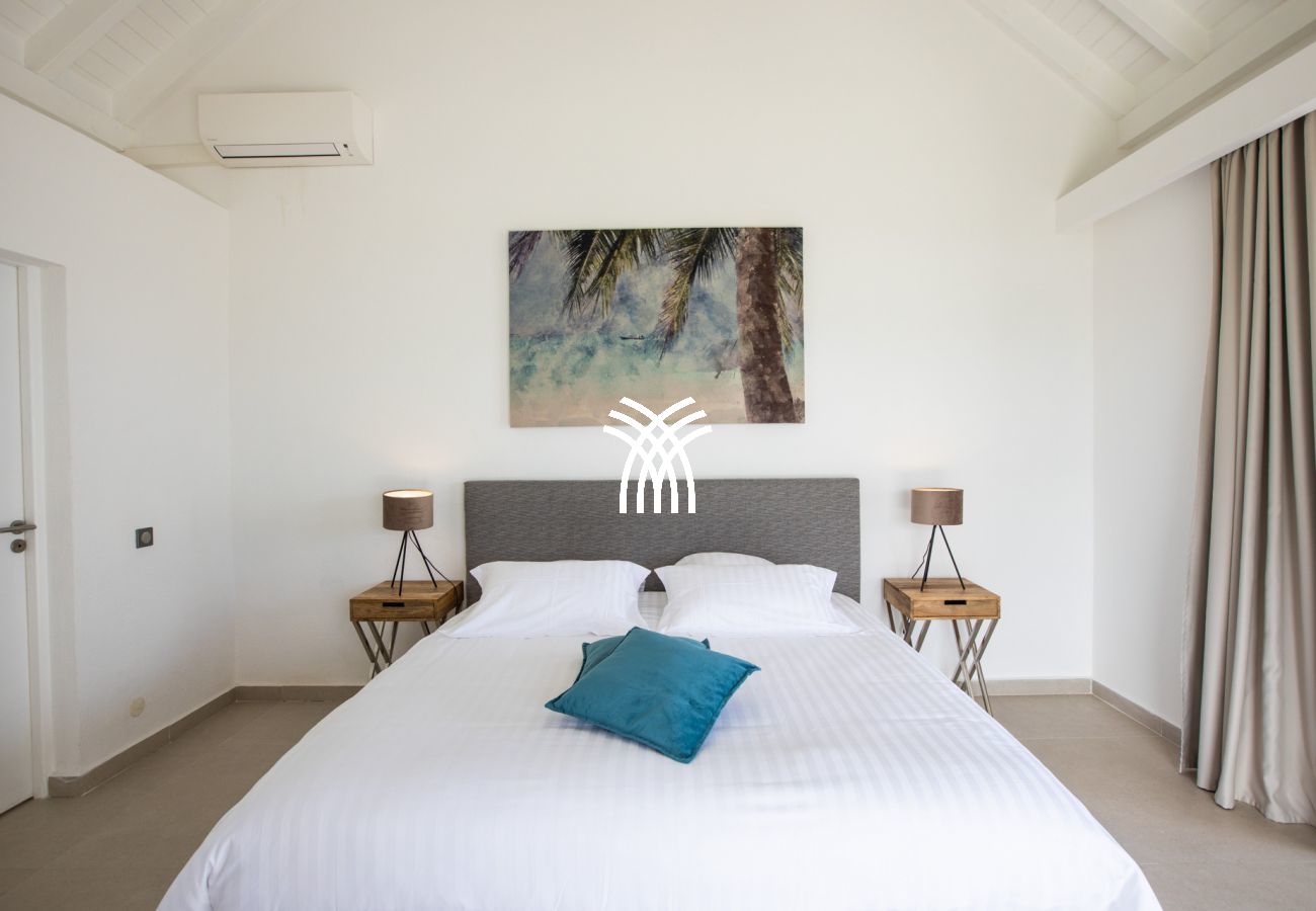 4 chambres de tailles égales ont la vue sur la mer des Caraïbes et sont au niveau de la terrasse de la piscine. La 5ème chambre et sa salle de bains attenante sont au niveau inférieur avec vue sur la mer des Caraïbes. Cette chambre comprend aussi une kitchenette.