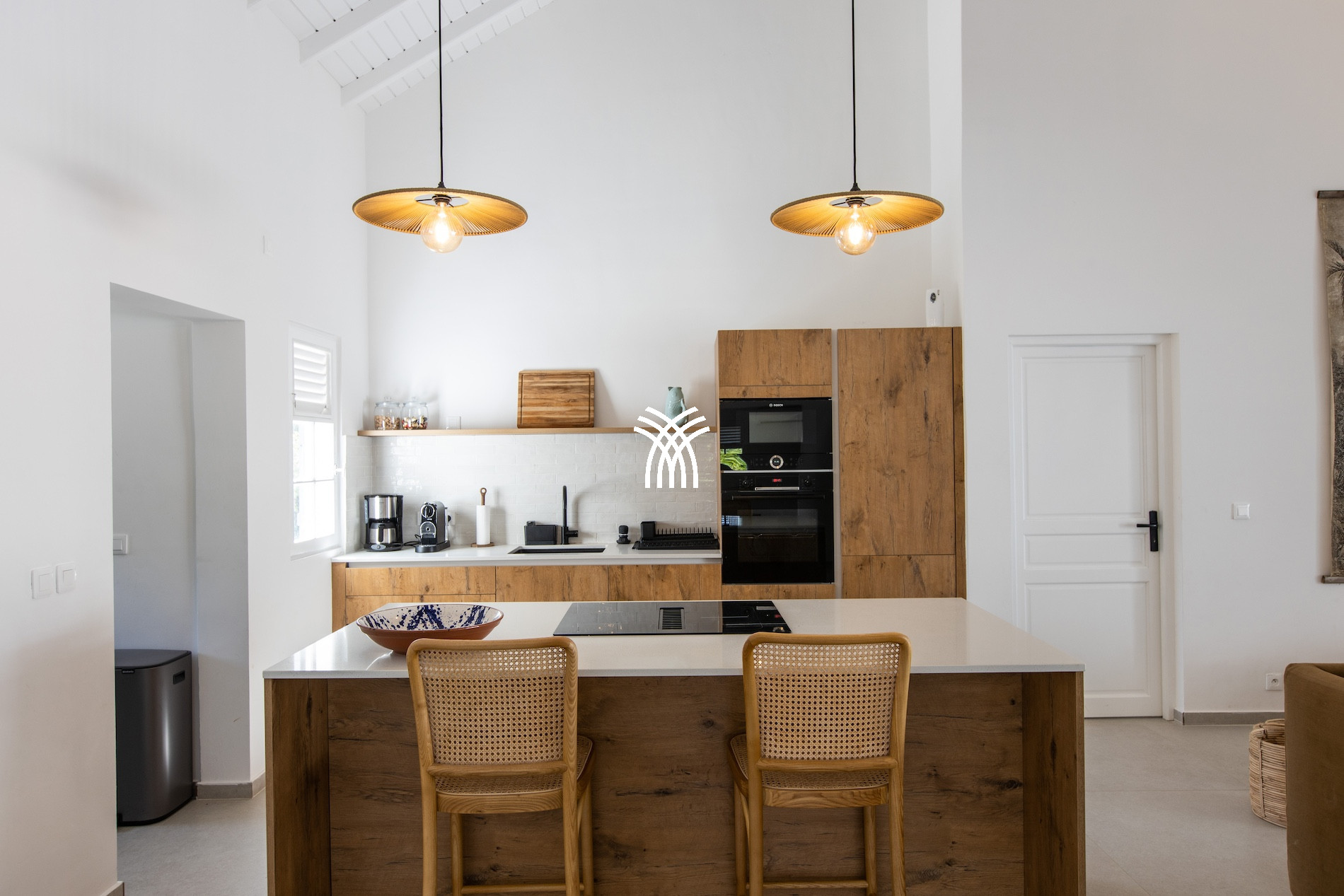 La grande terrasse extérieure est un véritable lieu de vie avec ses espaces lounge, son barbecue, et sa salle à manger extérieure. La cuisine moderne et entièrement équipée s’ouvre directement sur la terrasse, créant un espace convivial idéal pour partager des moments en famille ou entre amis.