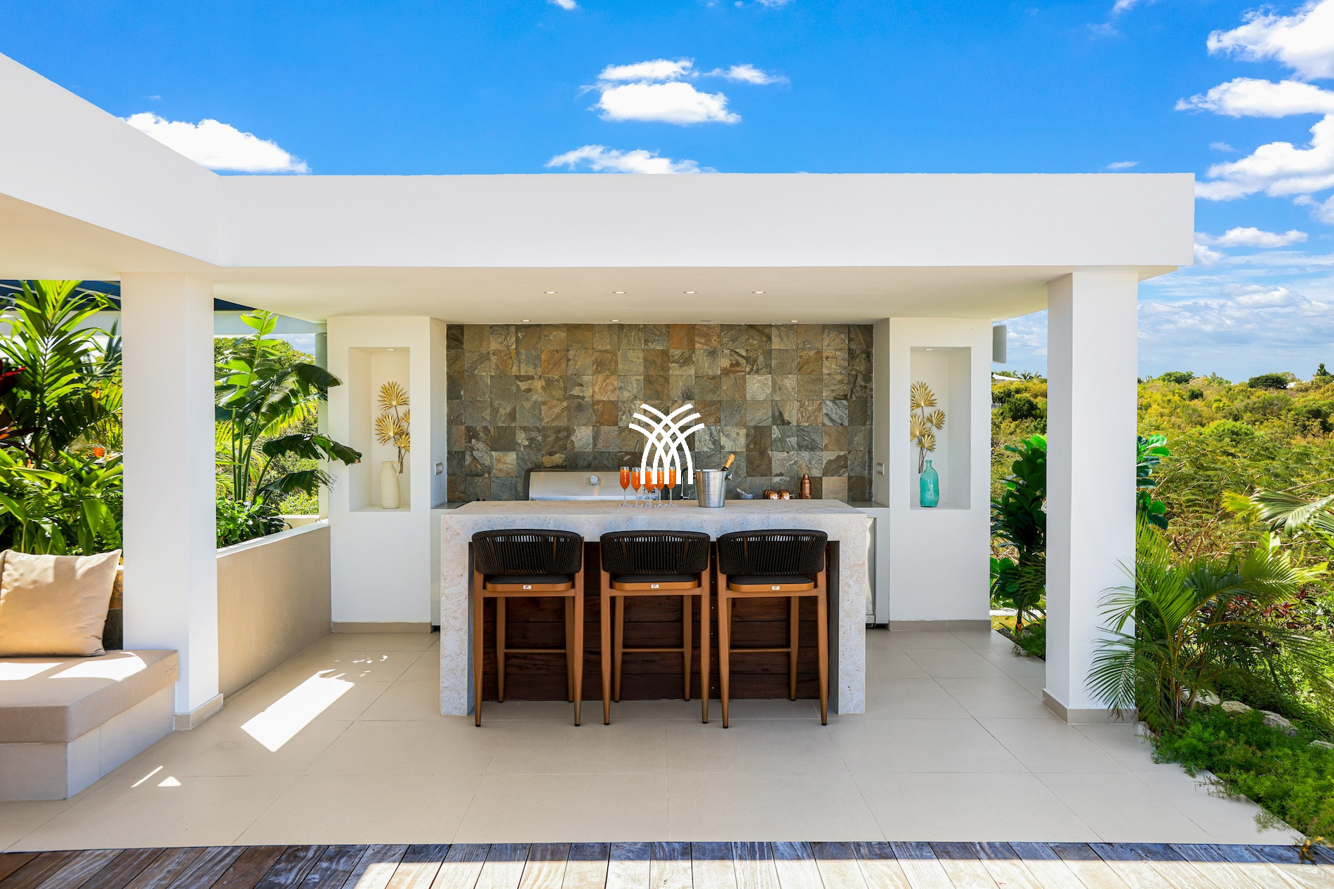 L’extérieur de cette villa de luxe à louer à Saint Martin est un véritable havre de paix. La grande terrasse aménagée avec salon extérieur d’inspiration marocaine, piscine à débordement et salle à manger en plein air permet de vivre pleinement l’art de vivre caribéen, entre détente et convivialité.