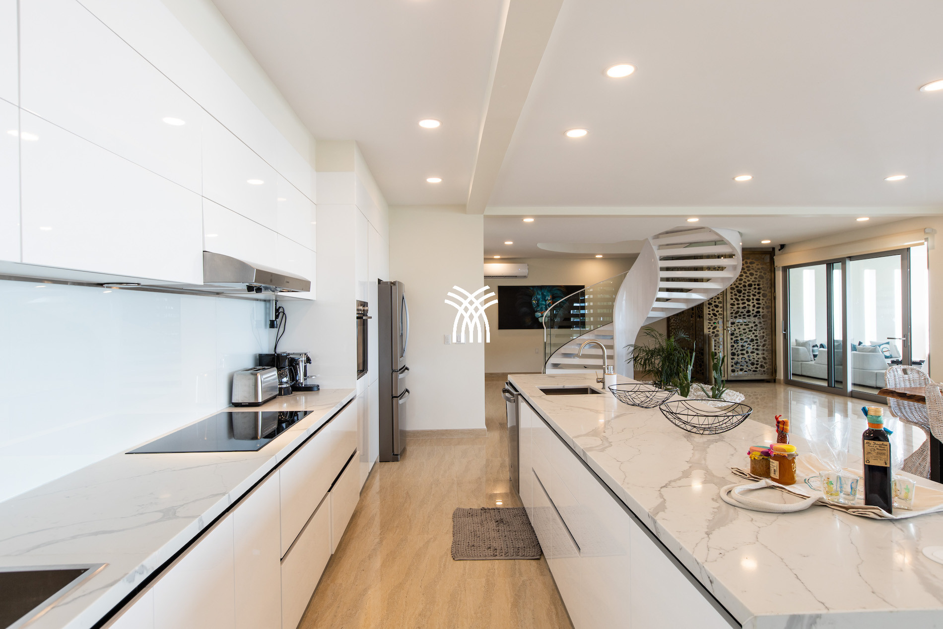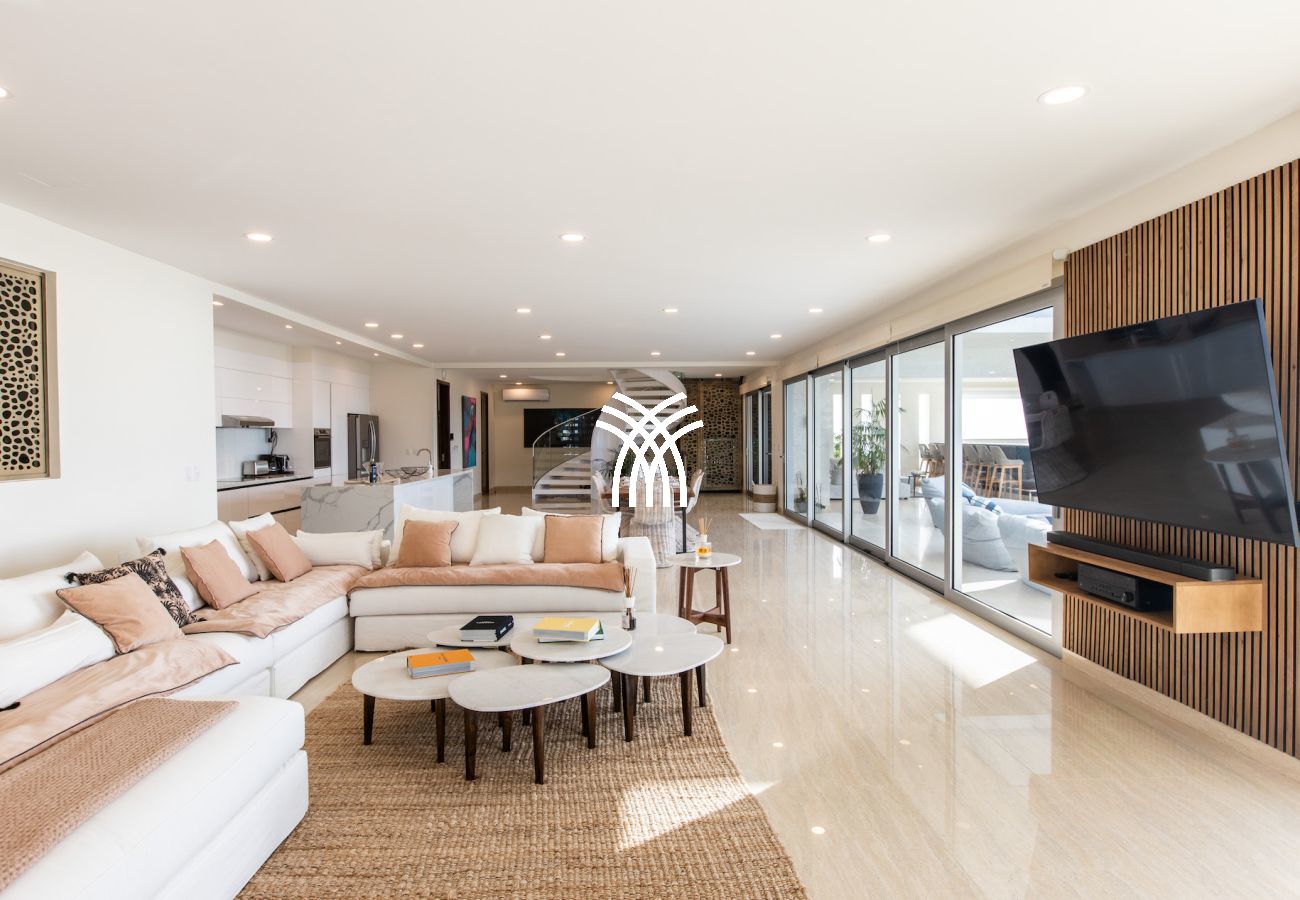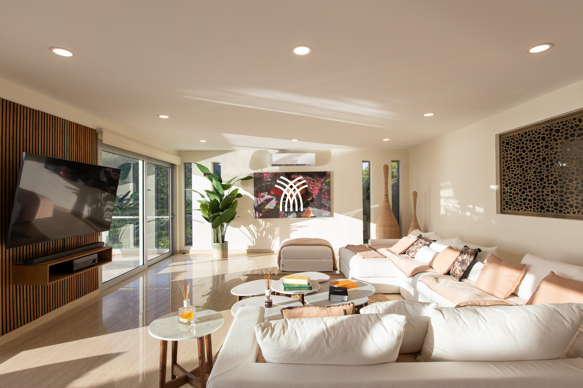 L’espace principal de vie est situé au niveau inférieur, accessible par un magnifique escalier en colimaçon ou un ascenseur depuis le hall d’entrée. Ce vaste salon lumineux et climatisé est ouvert sur une grande terrasse extérieure, une piscine à débordement avec vue mer et un confortable espace lounge.