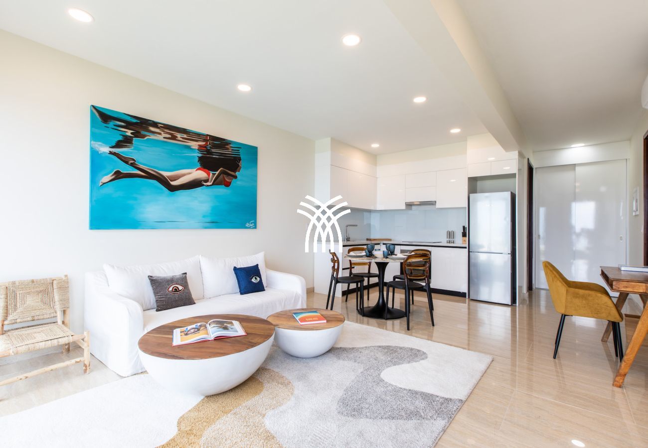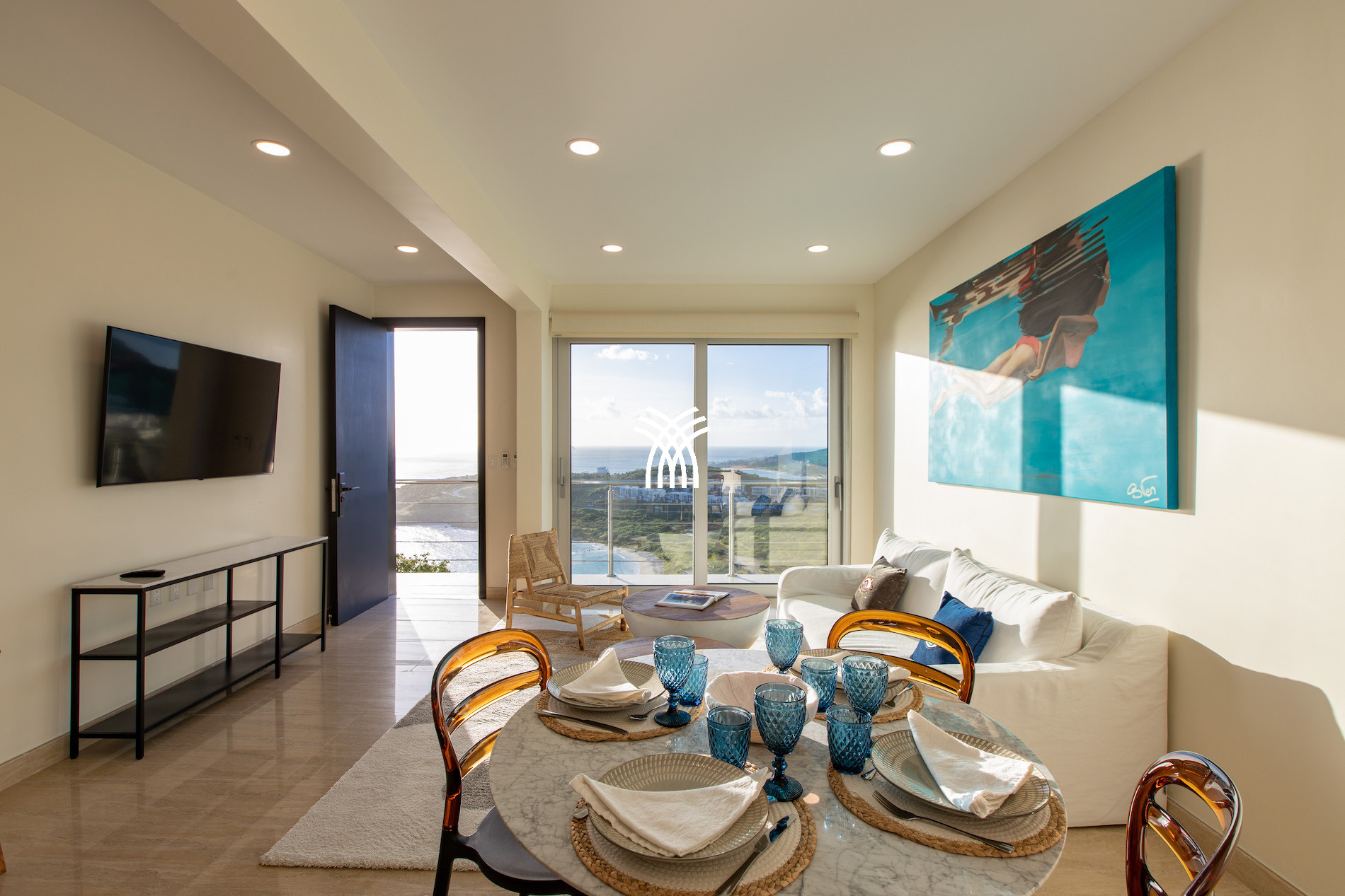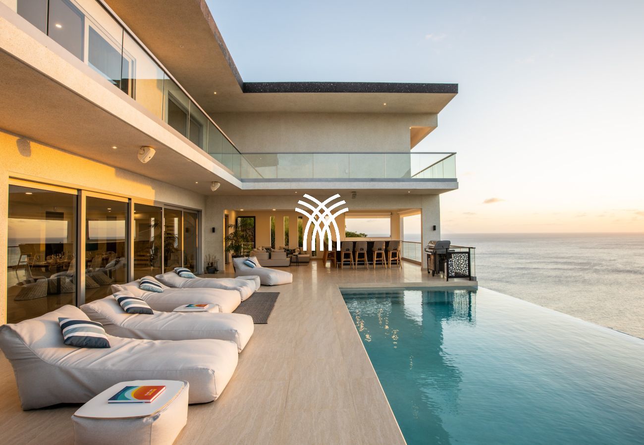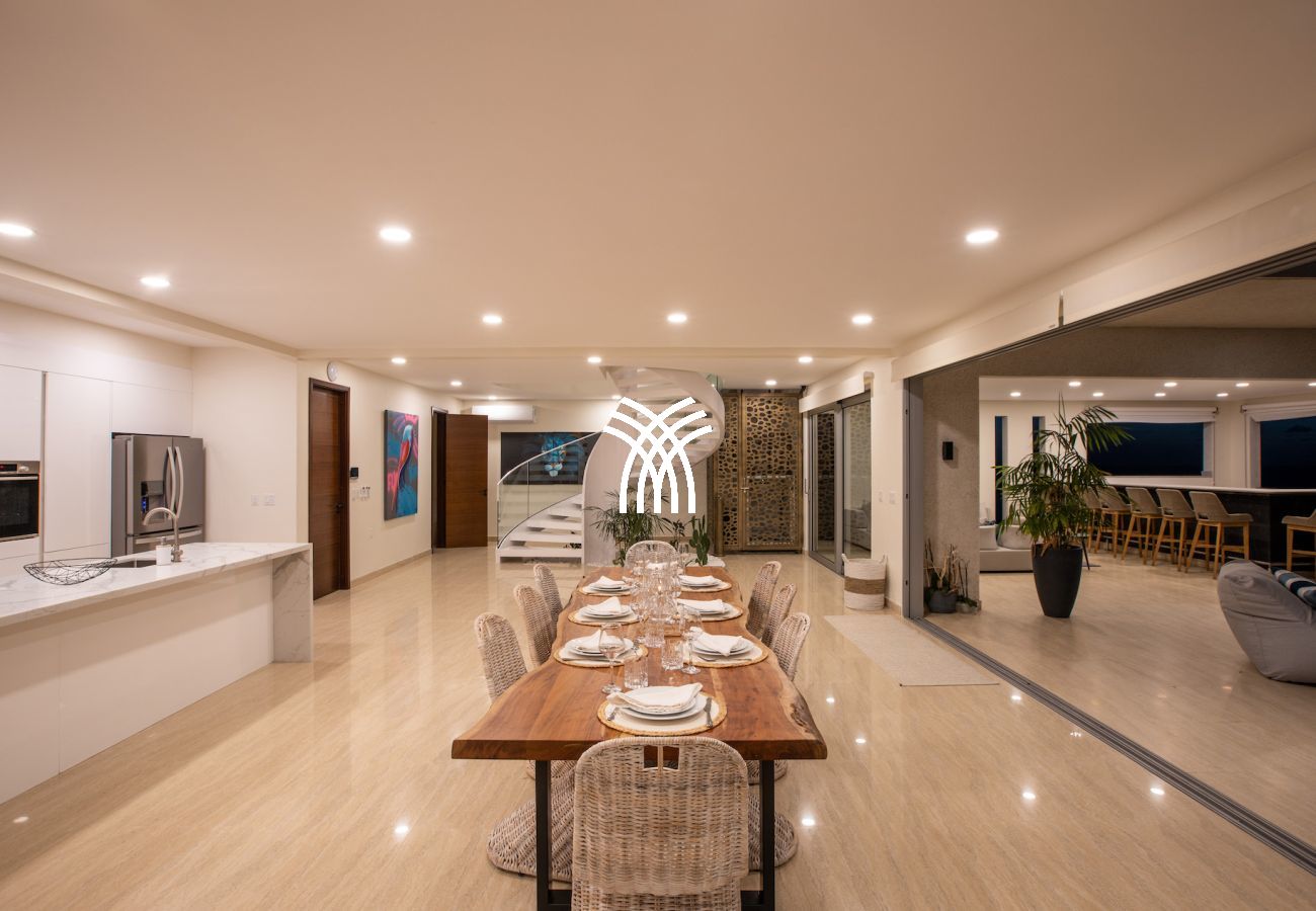L'architecture de la villa privilégie les lignes épurées et les volumes généreux, où la lumière naturelle inonde les intérieurs grâce aux immenses baies vitrées. Le salon spacieux s'ouvre sur une terrasse spectaculaire où la piscine à débordement semble se fondre dans l'horizon azuré. La cuisine ouverte, dotée d'équipements haut de gamme, invite à partager des moments conviviaux face à une mer infinie. La fluidité entre intérieur et extérieur confère une sensation de liberté absolue, accentuée par le design sophistiqué et les matériaux nobles utilisés.