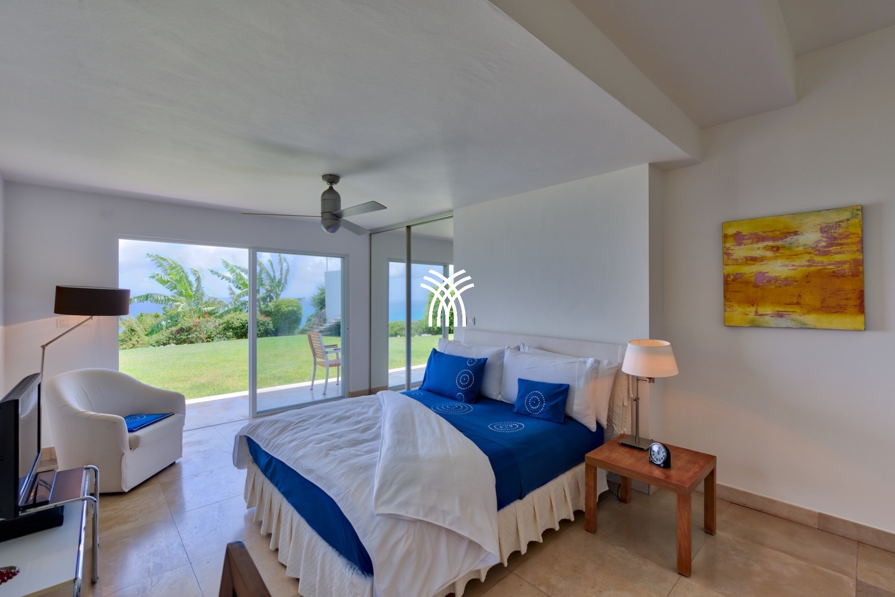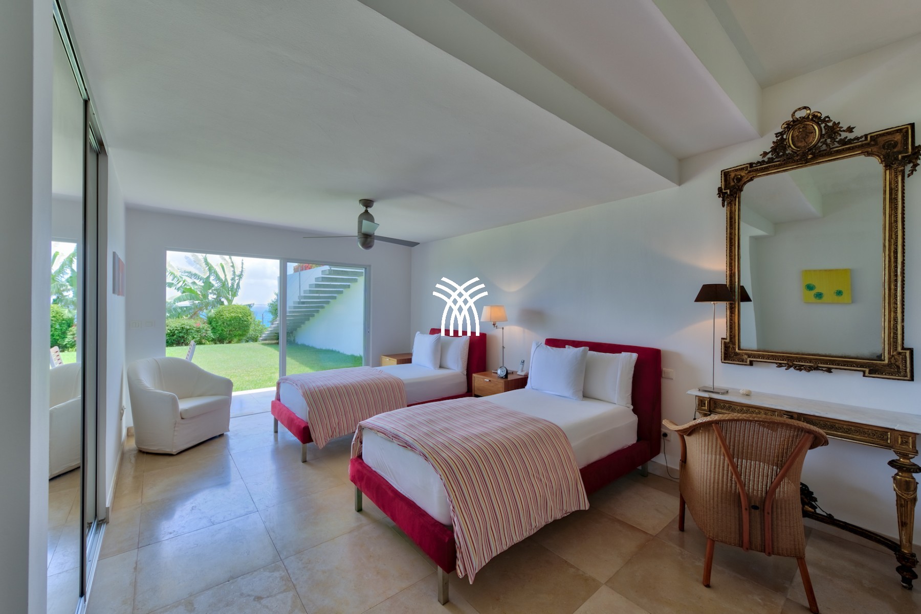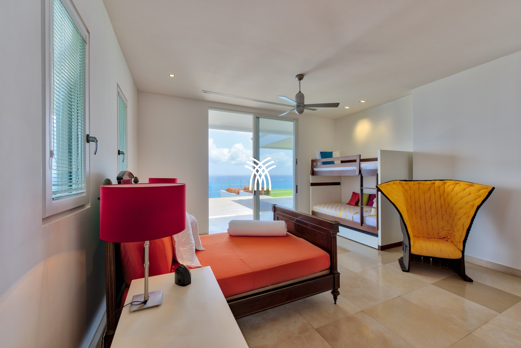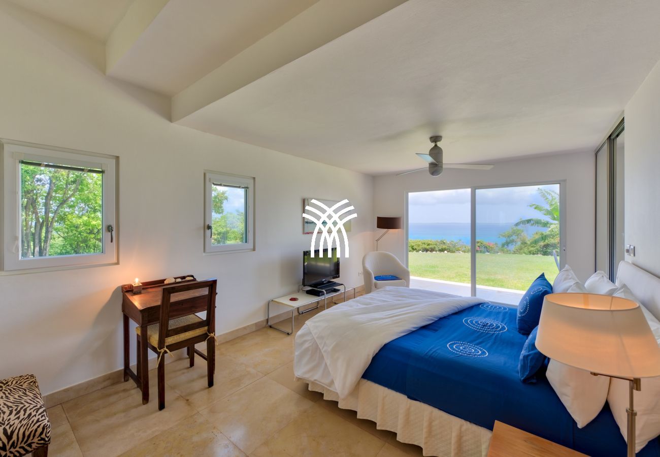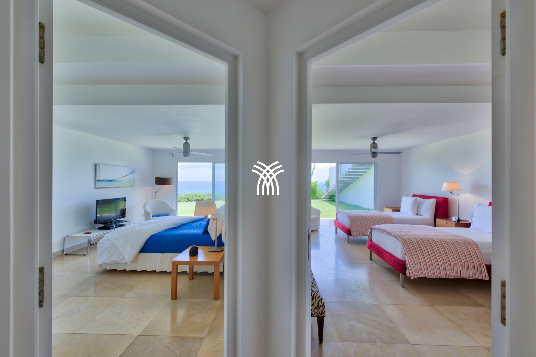 4 chambres de tailles égales ont la vue sur la mer des Caraïbes et sont au niveau de la terrasse de la piscine. La 5ème chambre et sa salle de bains attenante sont au niveau inférieur avec vue sur la mer des Caraïbes. Cette chambre comprend aussi une kitchenette.