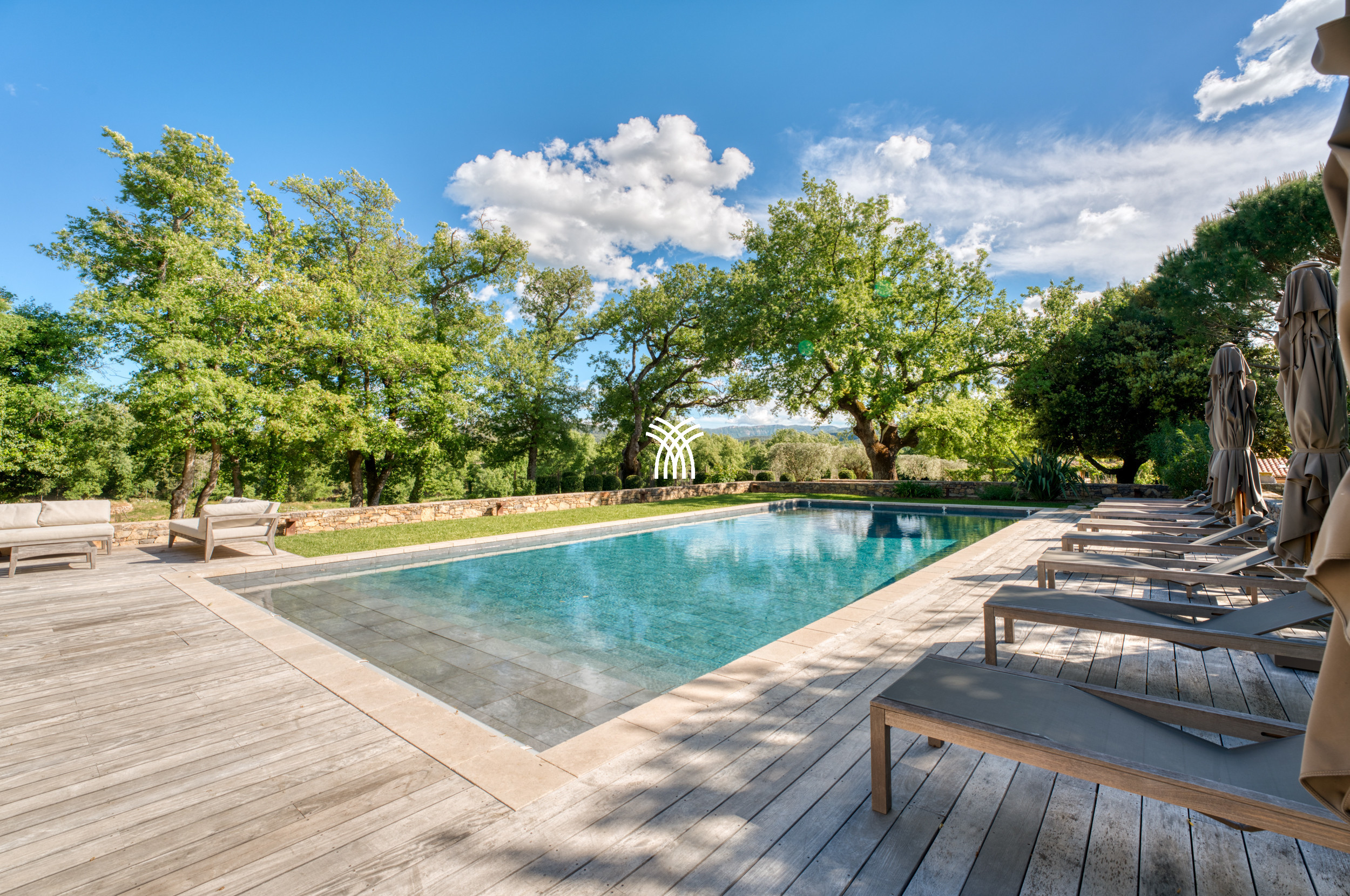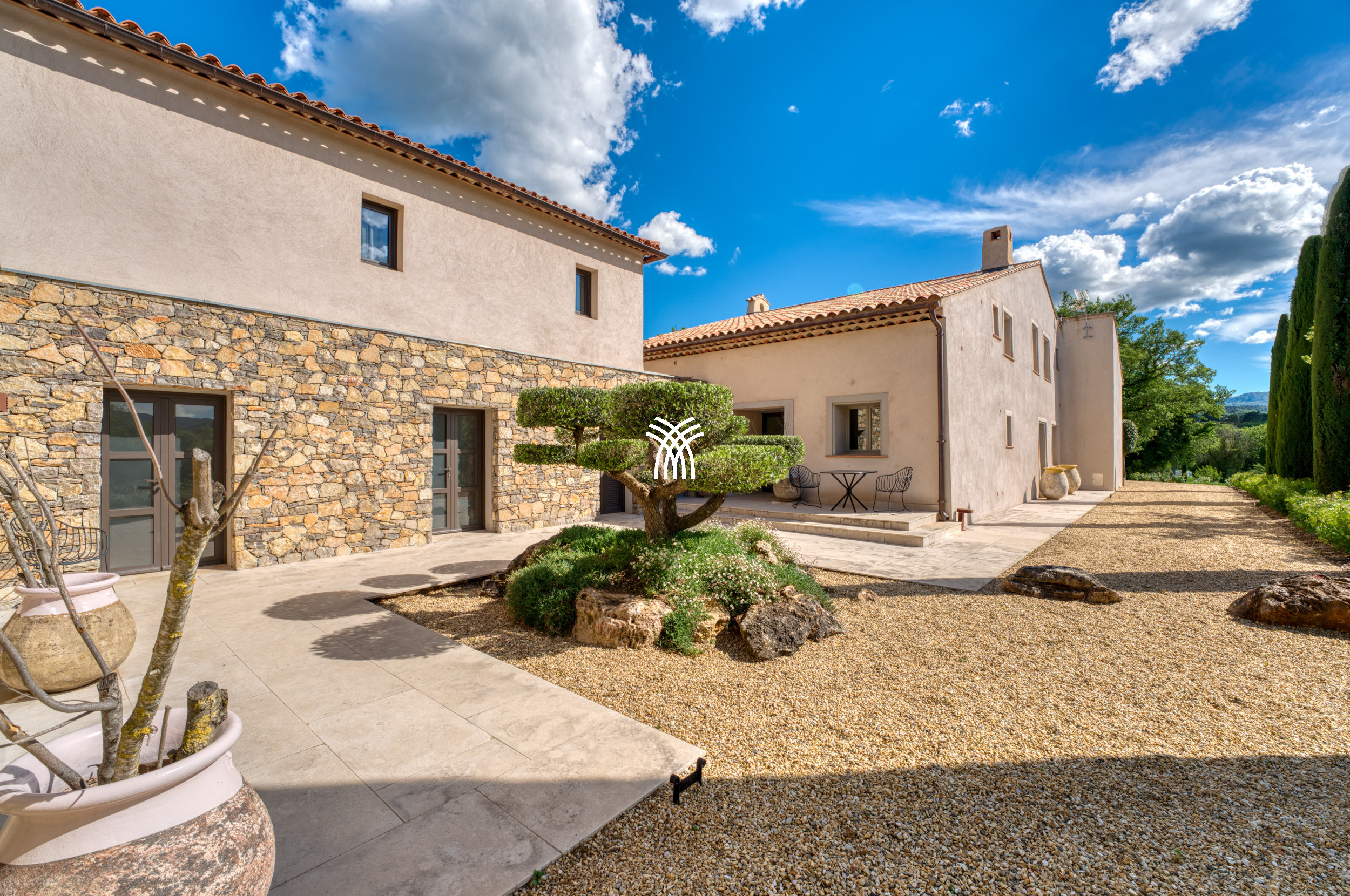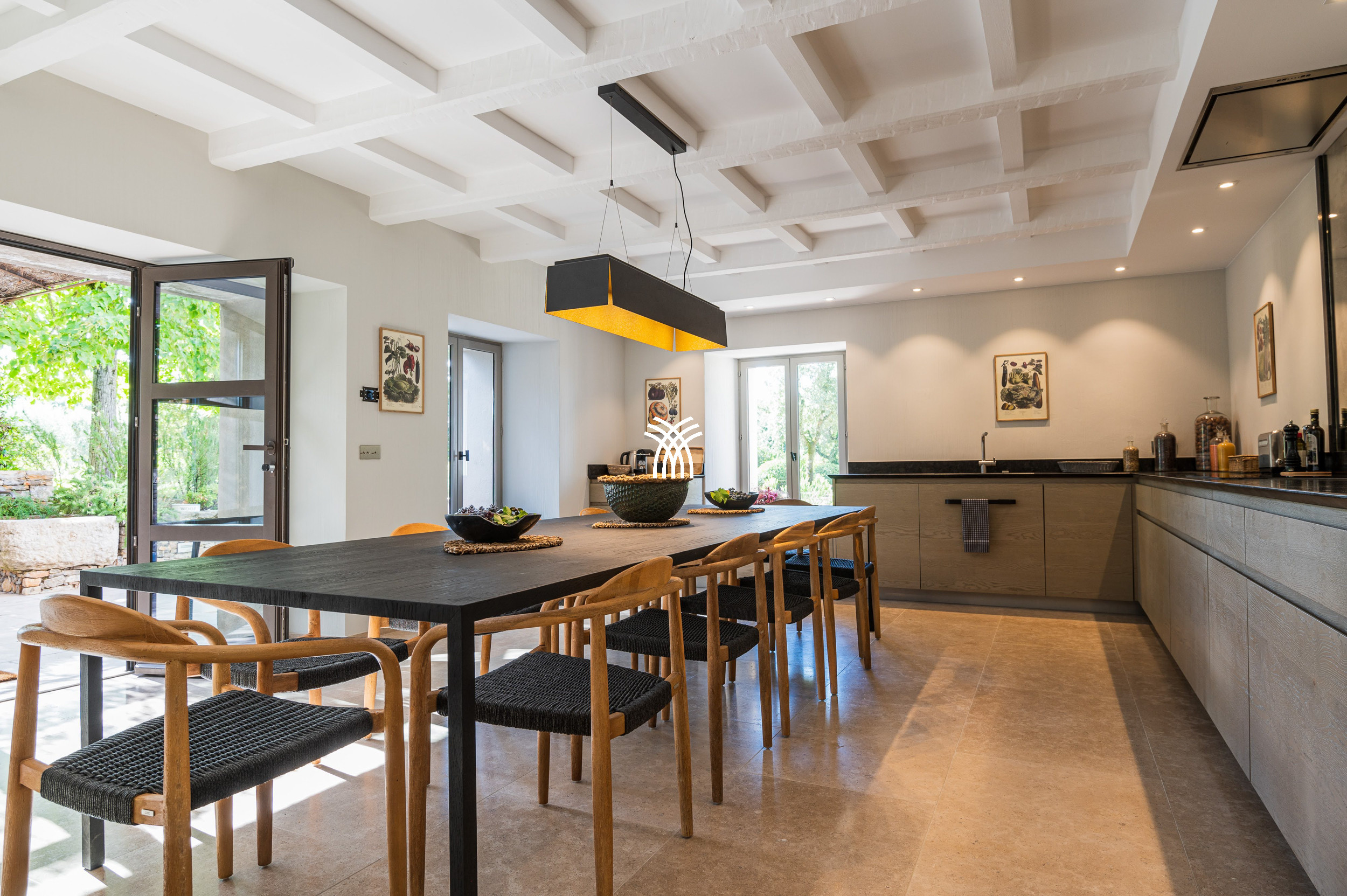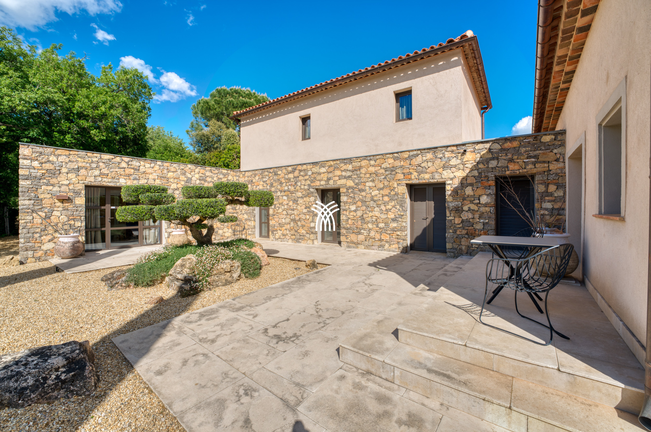 Mêlant sophistication moderne et charme provençal intemporel, la décoration combine avec grâce le bois, le métal et la pierre, s'intégrant parfaitement à la végétation luxuriante qui entoure la propriété. Dans ce havre idyllique, la convivialité définit chaque moment, que ce soit à l'ombre d'un chêne séculaire majestueux ou en profitant de la chaleur d'intérieurs soigneusement conçus. Une cuisine généreuse, des terrasses spacieuses et des fauteuils accueillants créent le cadre parfait pour préparer et savourer la cuisine locale, se détendre lors des soirées d'été fraîches ou simplement se reconnecter à la tranquillité d'un environnement préservé.