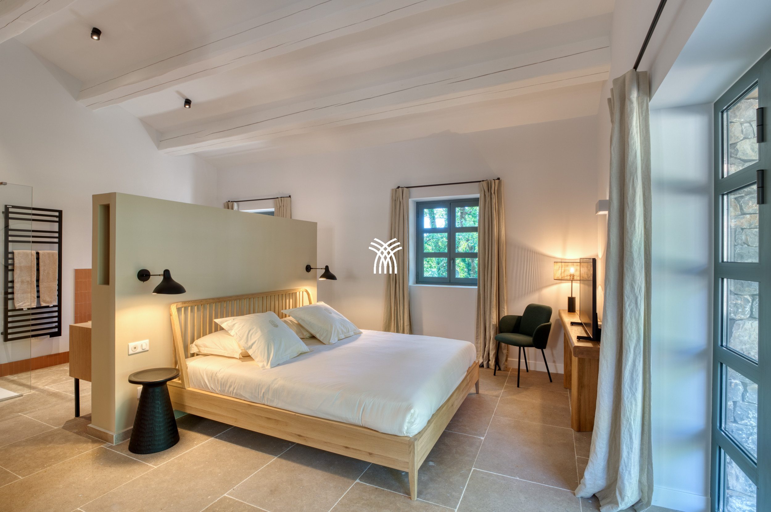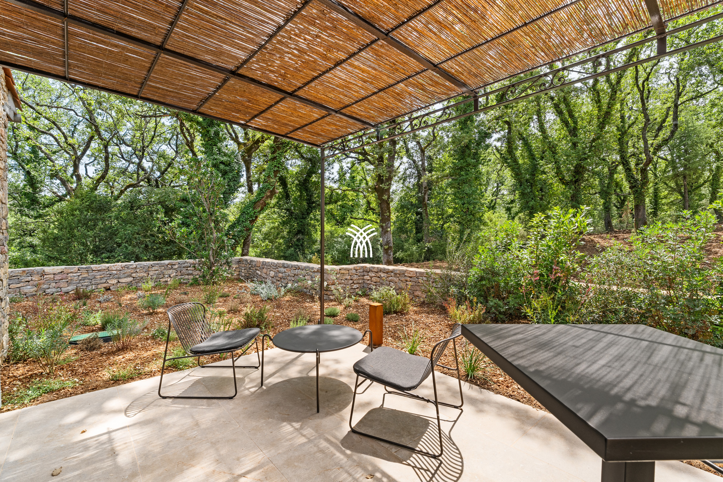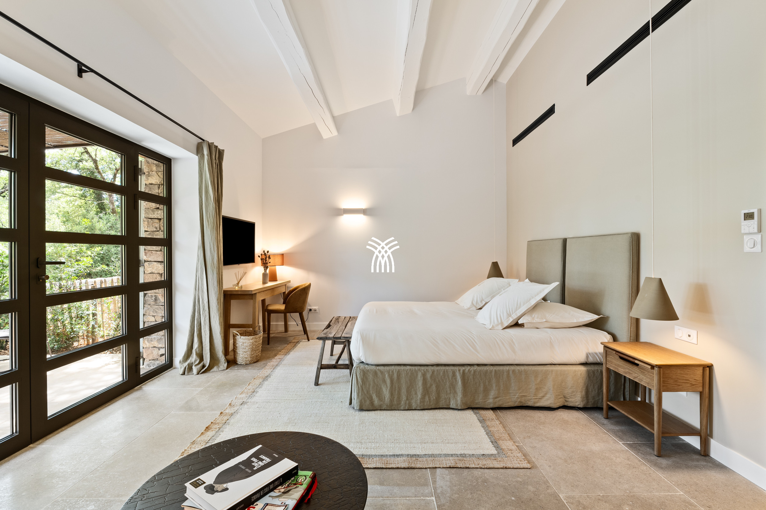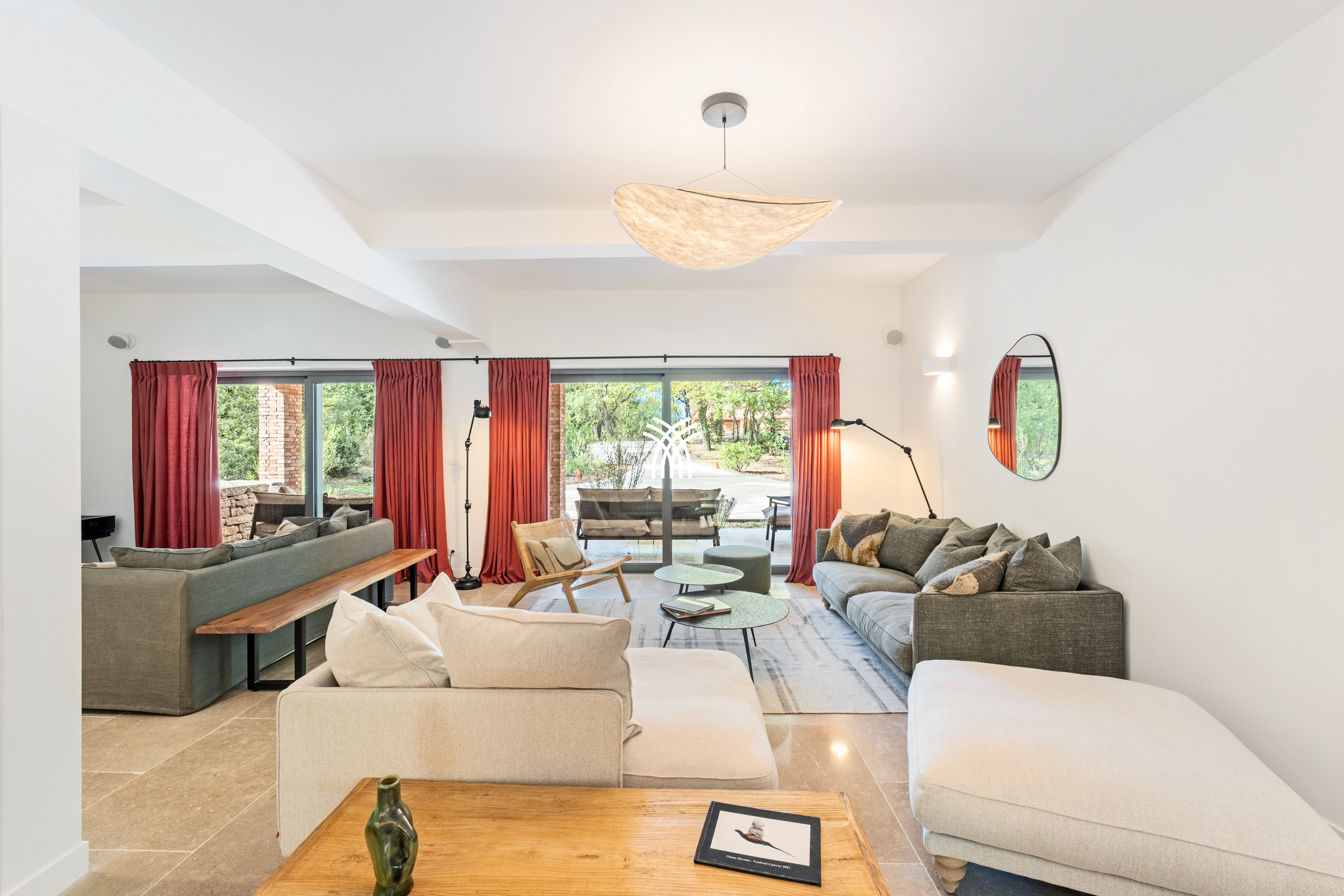 Mêlant sophistication moderne et charme provençal intemporel, la décoration combine avec grâce le bois, le métal et la pierre, s'intégrant parfaitement à la végétation luxuriante qui entoure la propriété. Dans ce havre idyllique, la convivialité définit chaque moment, que ce soit à l'ombre d'un chêne séculaire majestueux ou en profitant de la chaleur d'intérieurs soigneusement conçus. Une cuisine généreuse, des terrasses spacieuses et des fauteuils accueillants créent le cadre parfait pour préparer et savourer la cuisine locale, se détendre lors des soirées d'été fraîches ou simplement se reconnecter à la tranquillité d'un environnement préservé.
