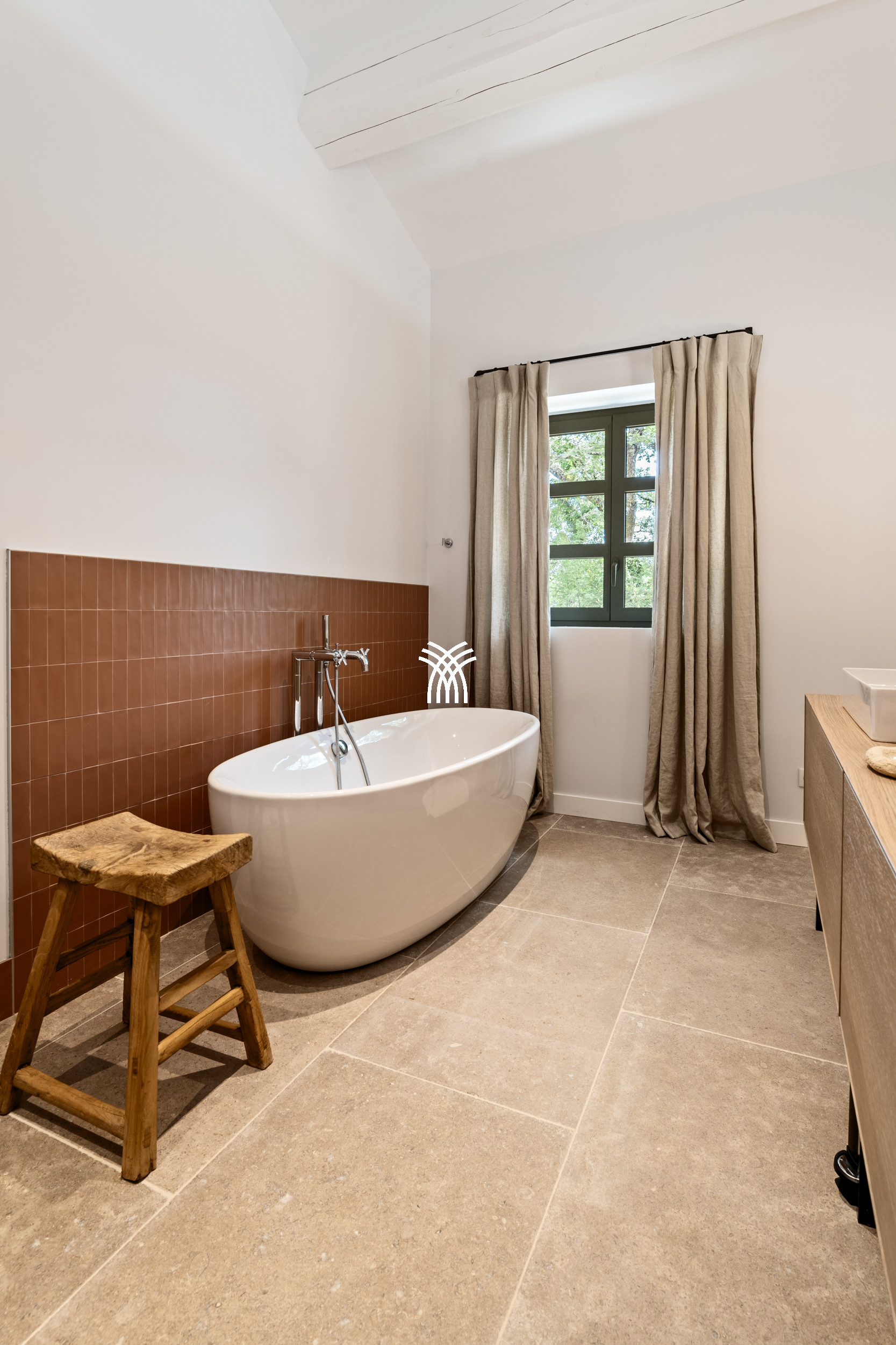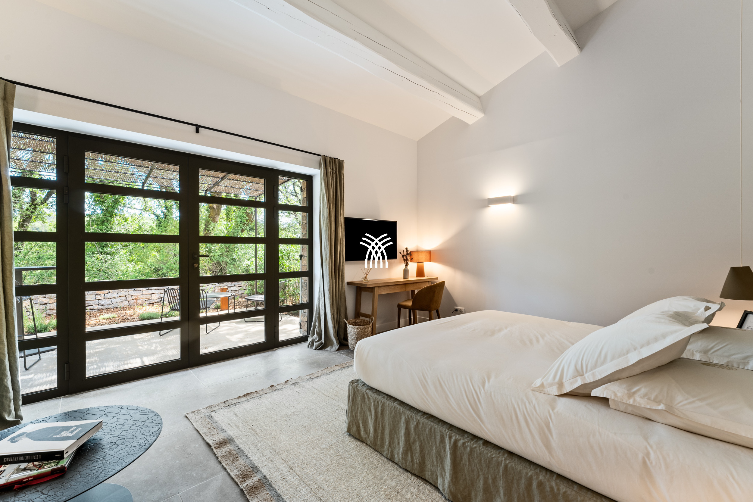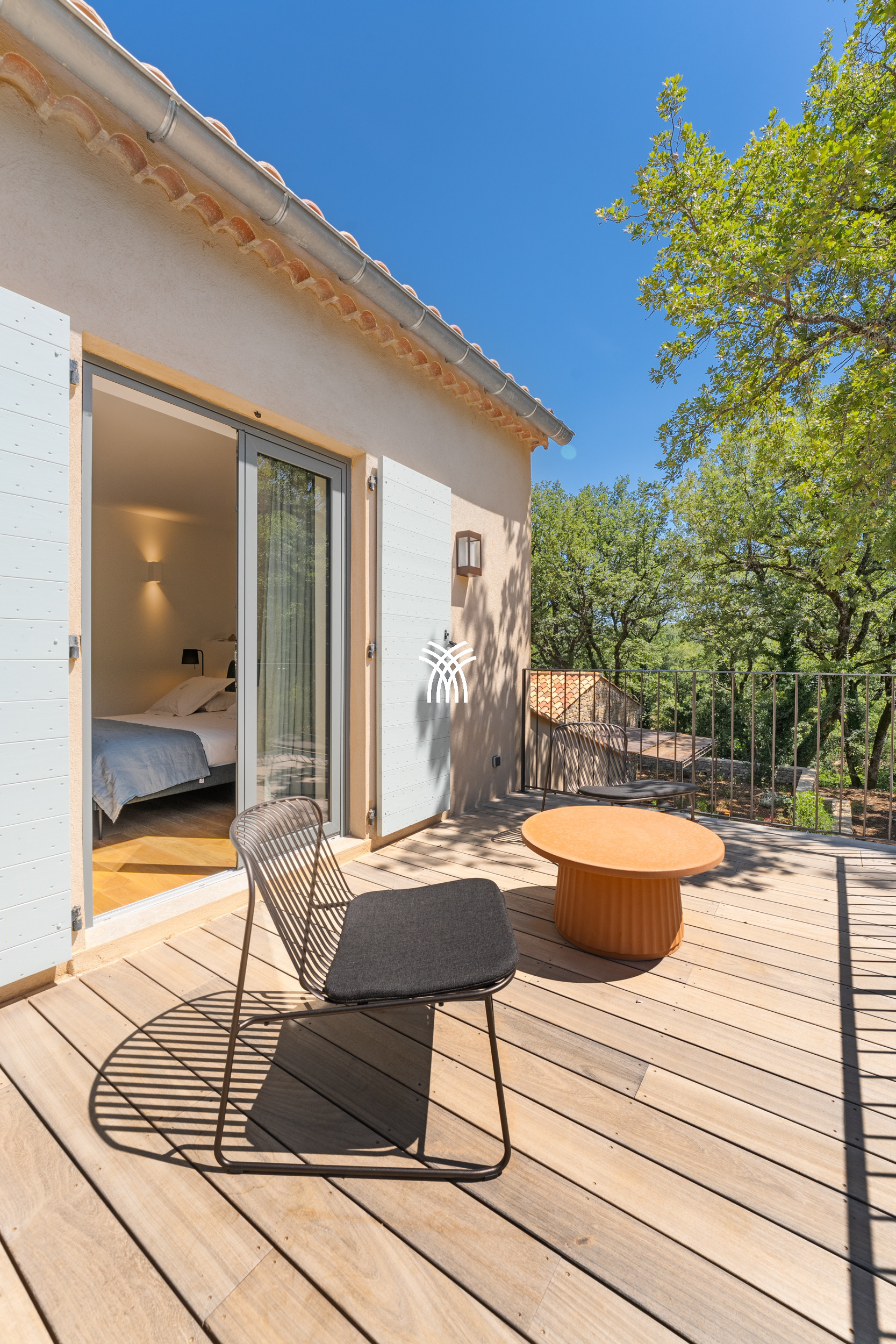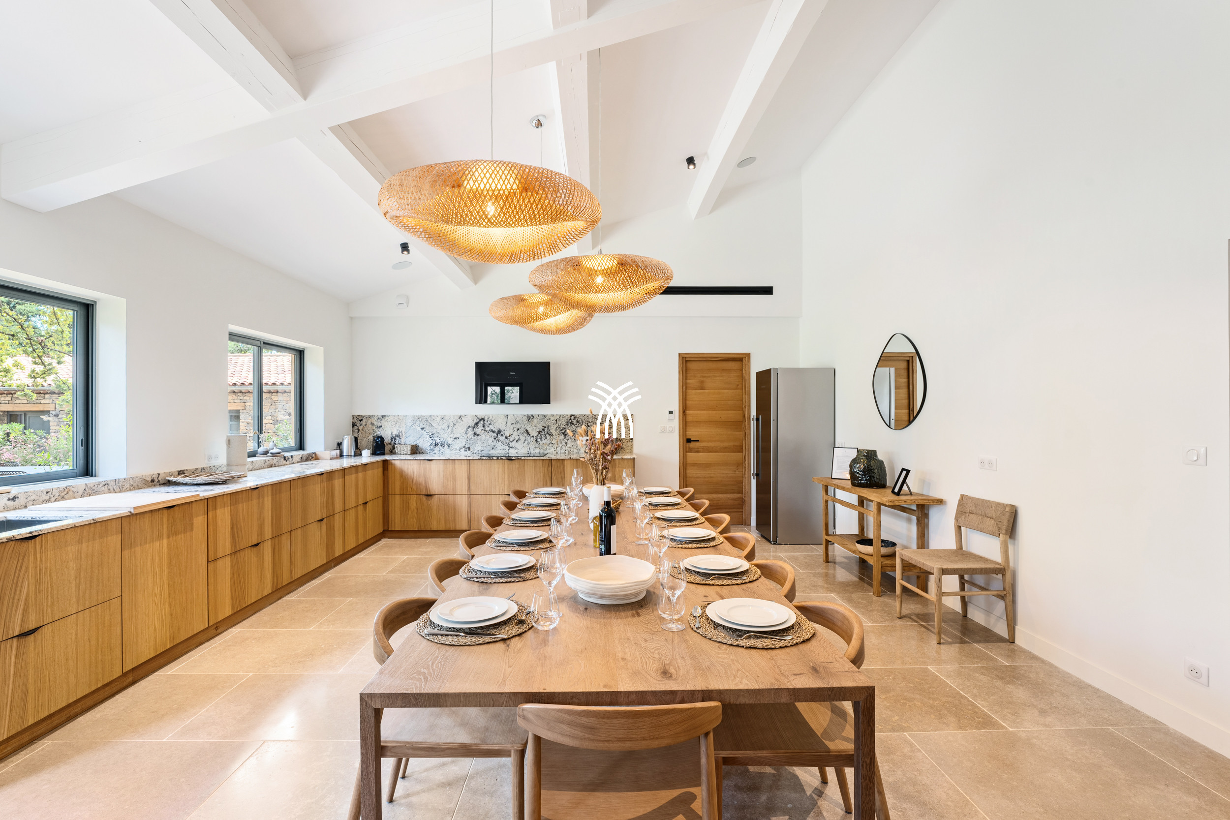 Mêlant sophistication moderne et charme provençal intemporel, la décoration combine avec grâce le bois, le métal et la pierre, s'intégrant parfaitement à la végétation luxuriante qui entoure la propriété. Dans ce havre idyllique, la convivialité définit chaque moment, que ce soit à l'ombre d'un chêne séculaire majestueux ou en profitant de la chaleur d'intérieurs soigneusement conçus. Une cuisine généreuse, des terrasses spacieuses et des fauteuils accueillants créent le cadre parfait pour préparer et savourer la cuisine locale, se détendre lors des soirées d'été fraîches ou simplement se reconnecter à la tranquillité d'un environnement préservé.