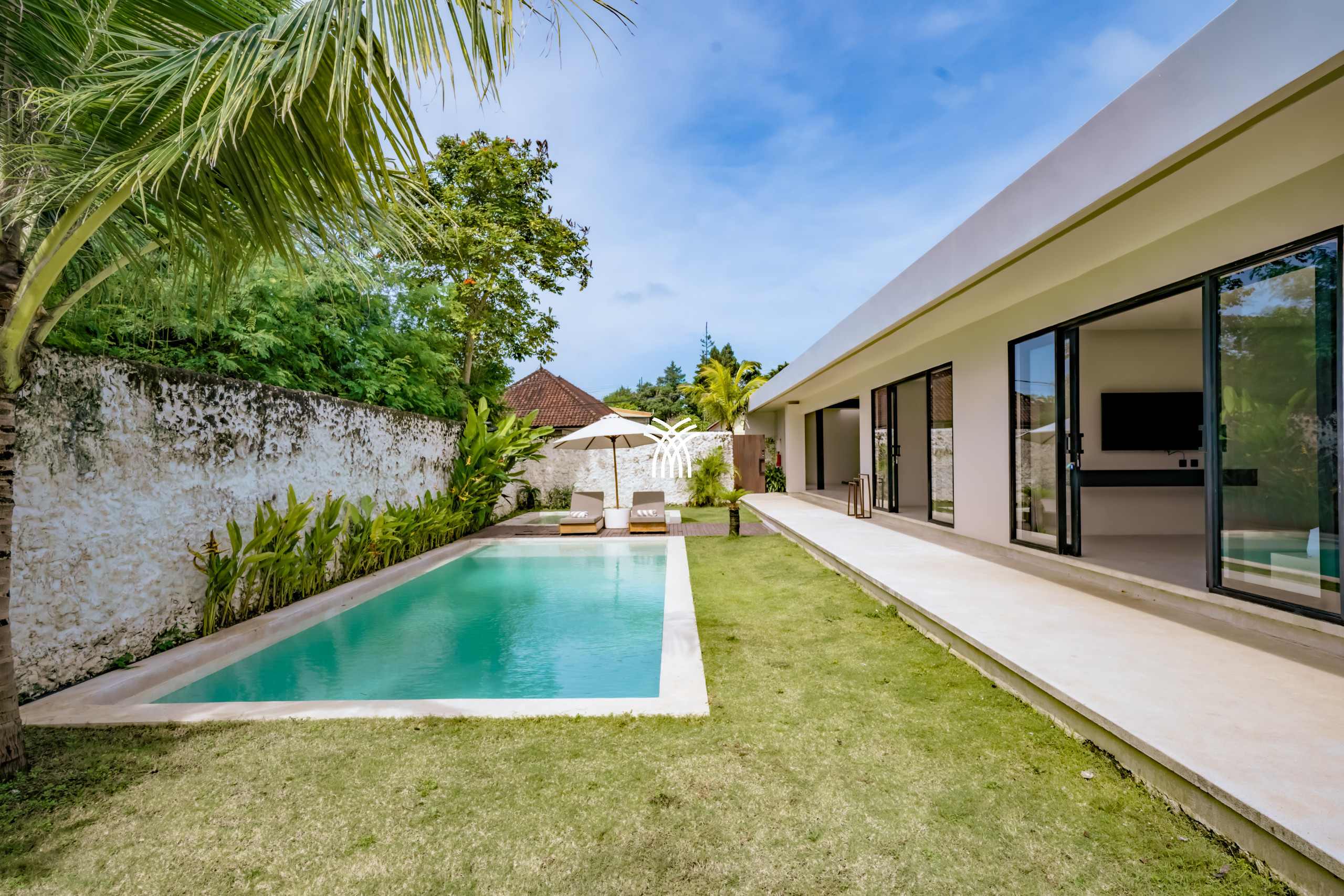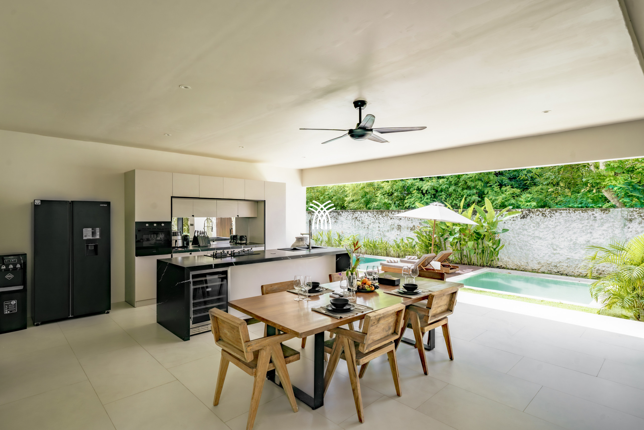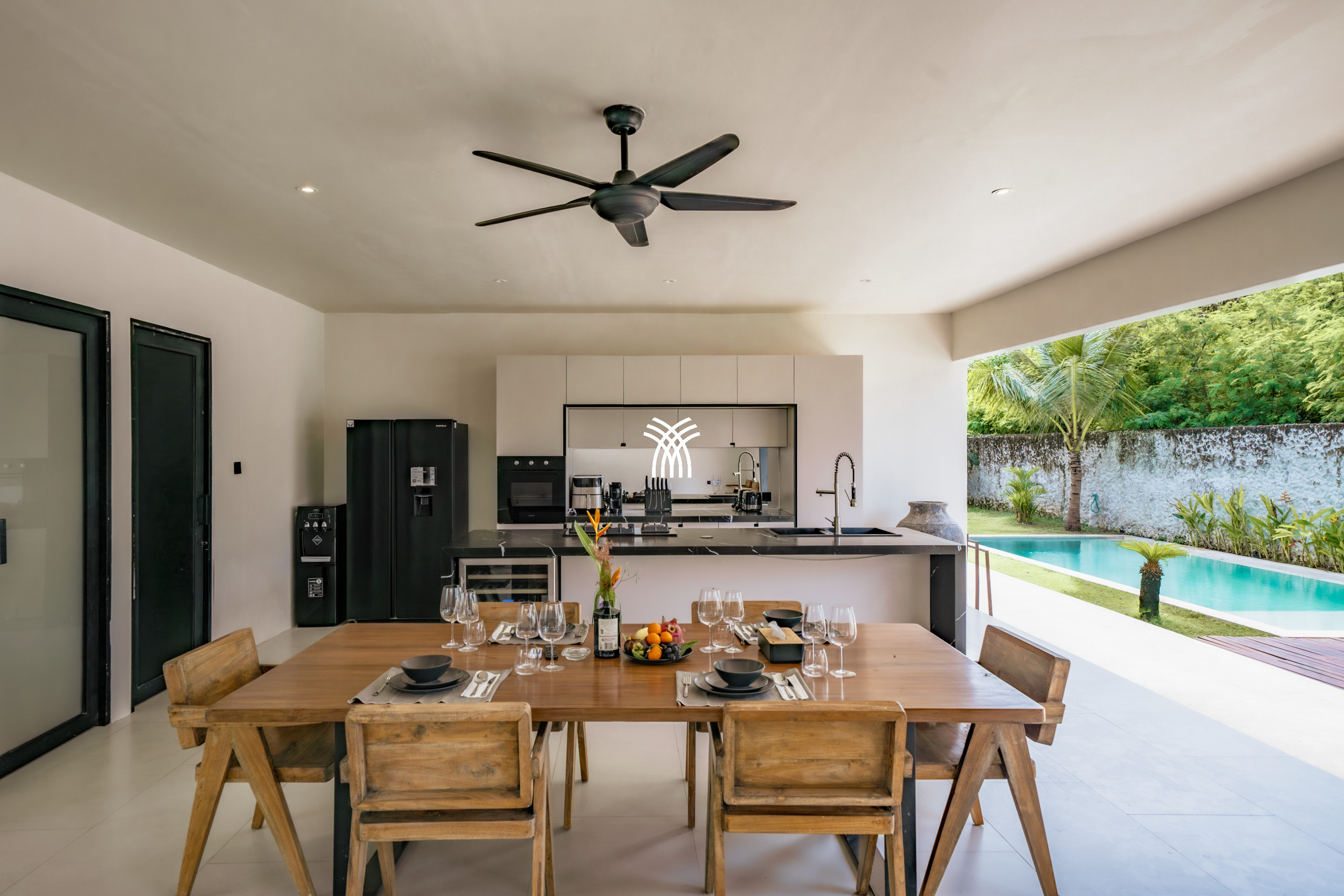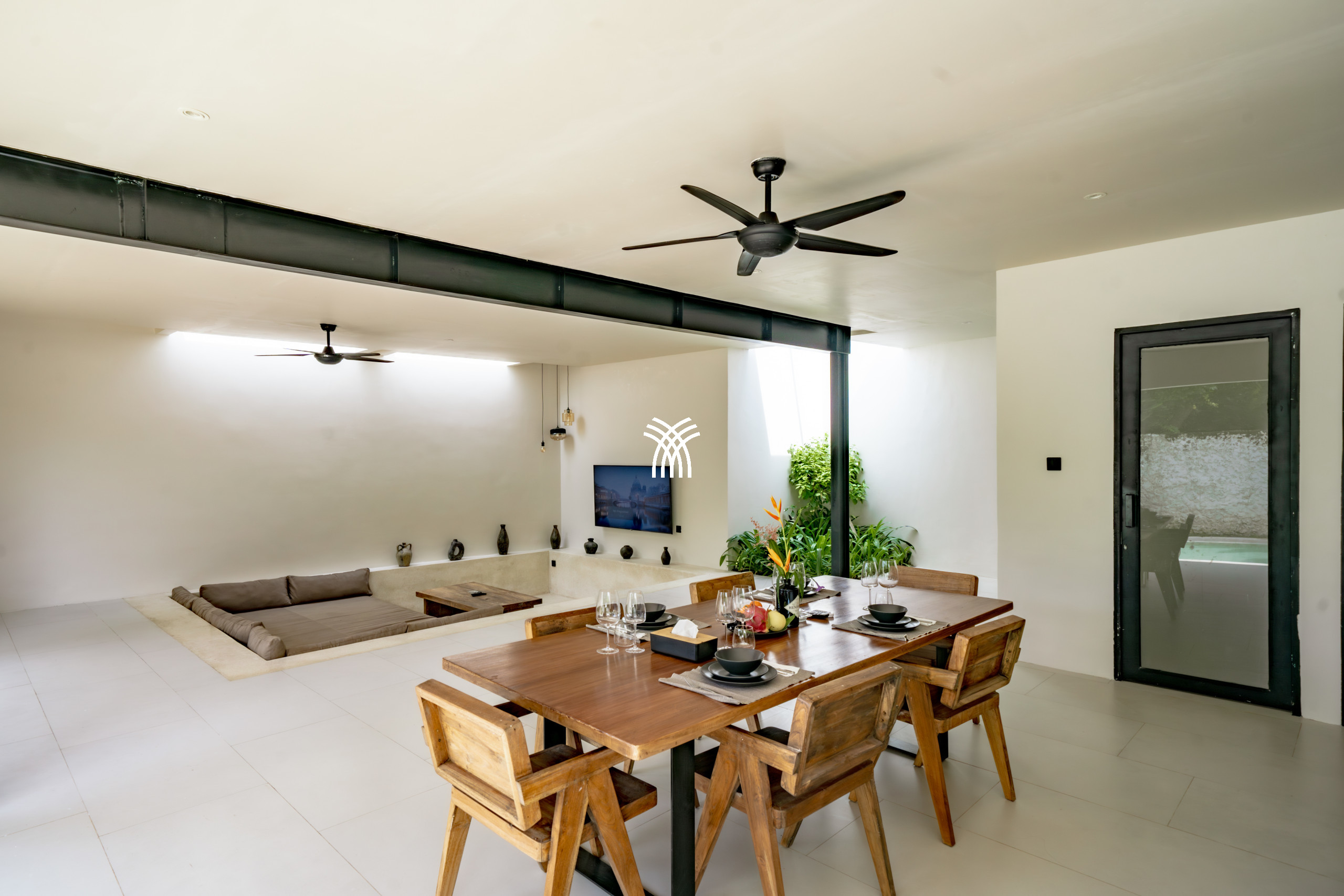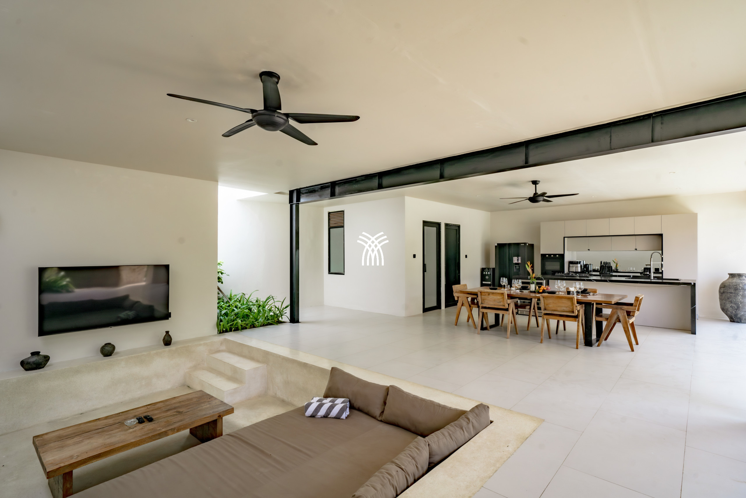 Conçue pour le confort et un mode de vie sans effort, la villa dispose de trois chambres spacieuses avec des lits king-size, des draps moelleux et la climatisation, complétées par des salles de bains élégantes avec des équipements modernes, des douches à effet pluie et de l'eau chaude. Une grande piscine privée et une piscine dédiée aux enfants sont encadrées par une verdure tropicale luxuriante, créant un cadre idyllique pour une détente ensoleillée et des moments rafraîchissants sous le ciel chaud de Bali. L'espace de vie ouvert, rehaussé par de grandes parois vitrées, invite la lumière naturelle à circuler harmonieusement dans l'espace, tandis que la cuisine moderne entièrement équipée et la salle à manger offrent le cadre parfait pour des repas partagés et des rassemblements mémorables.