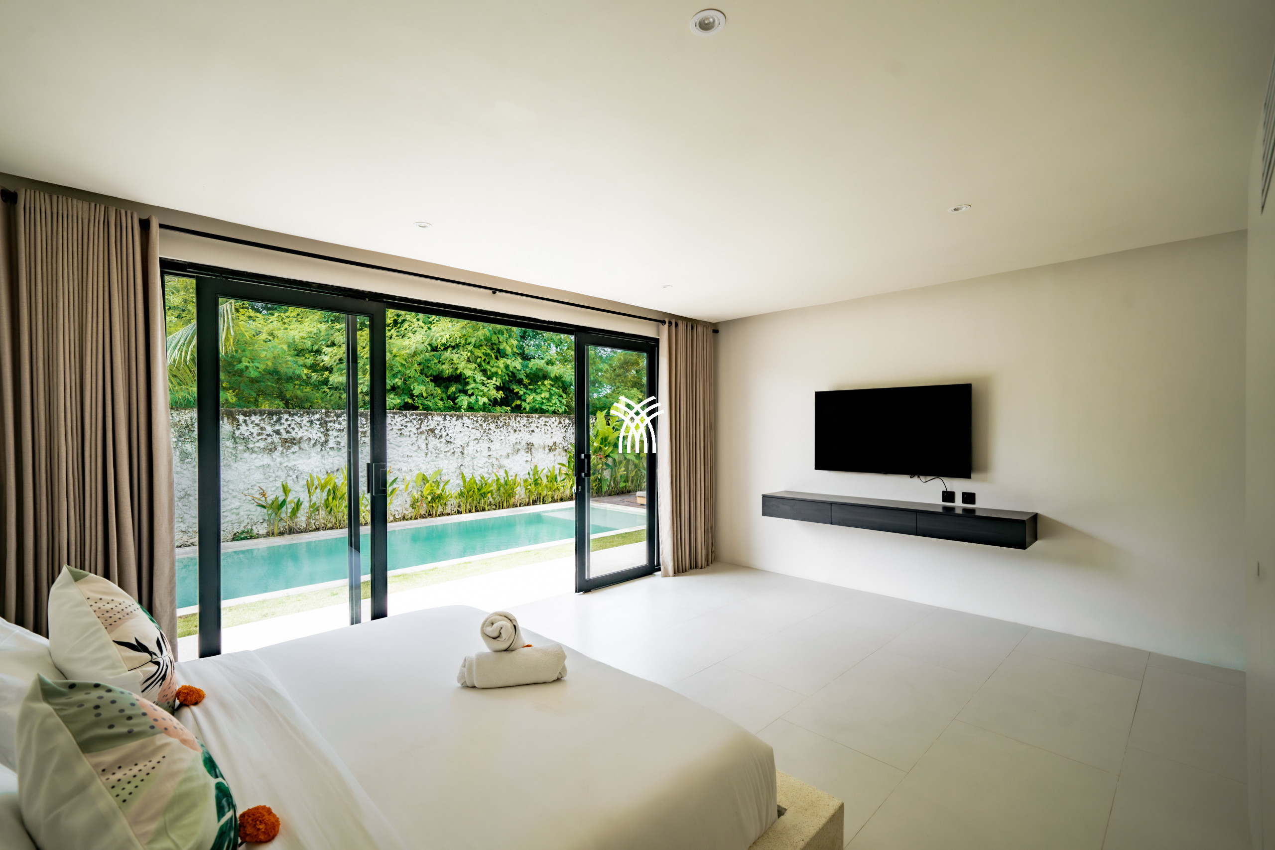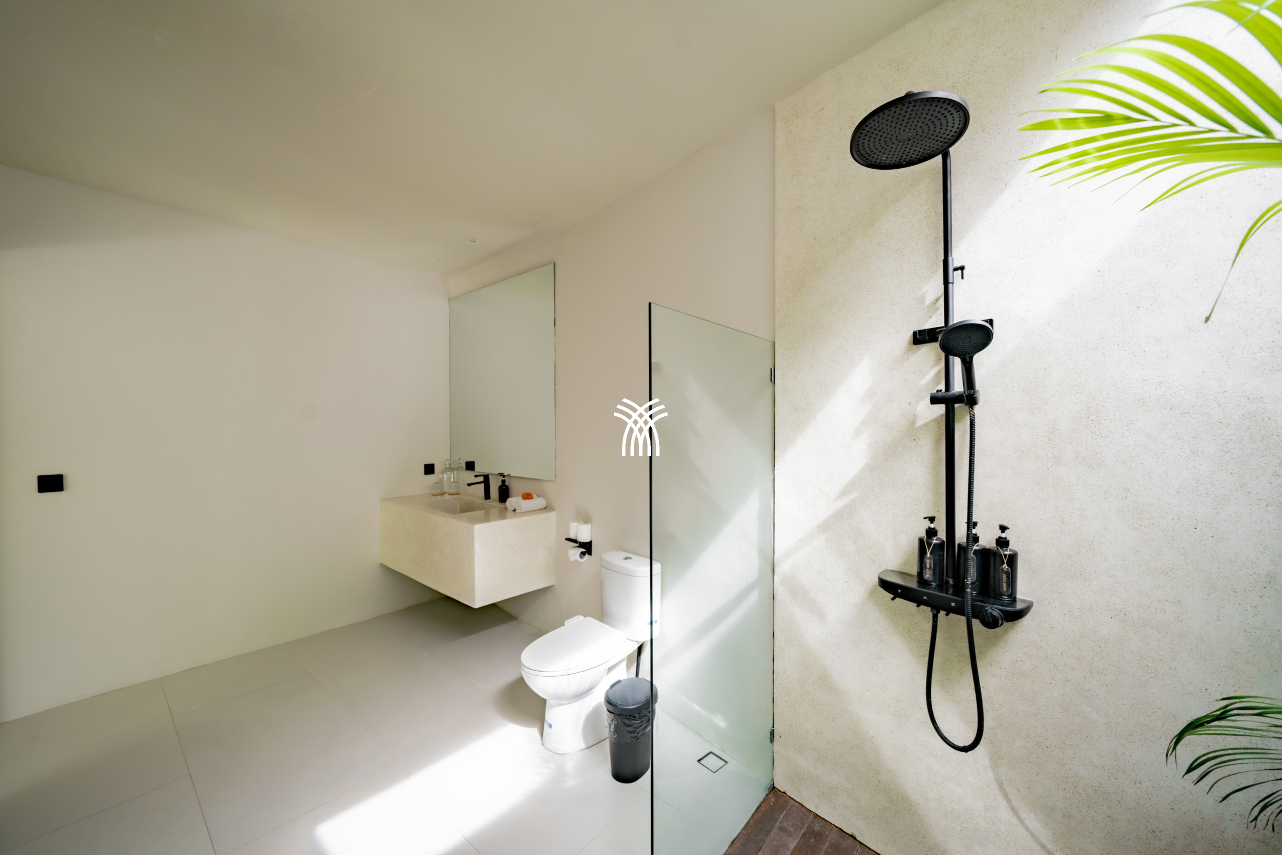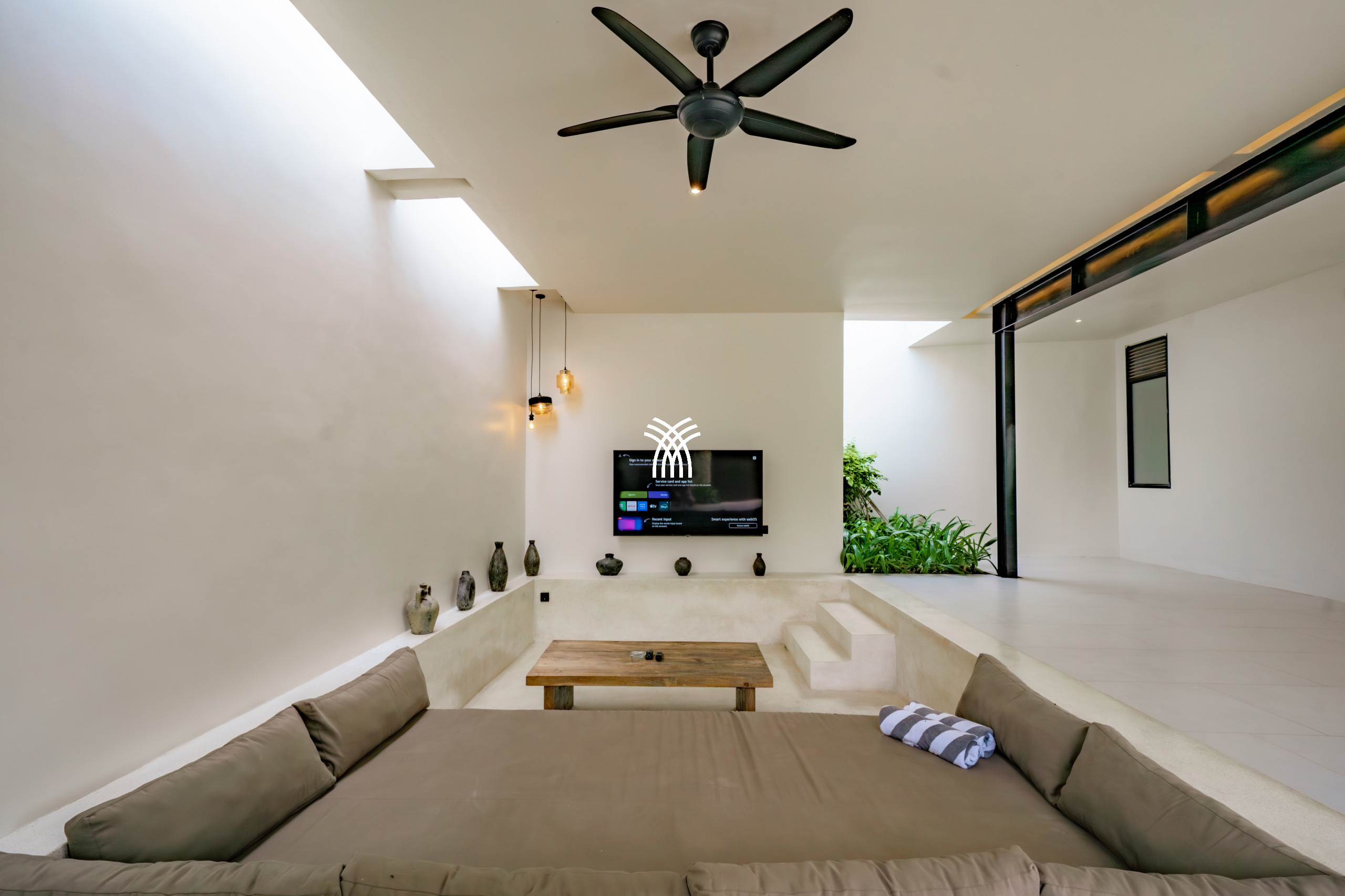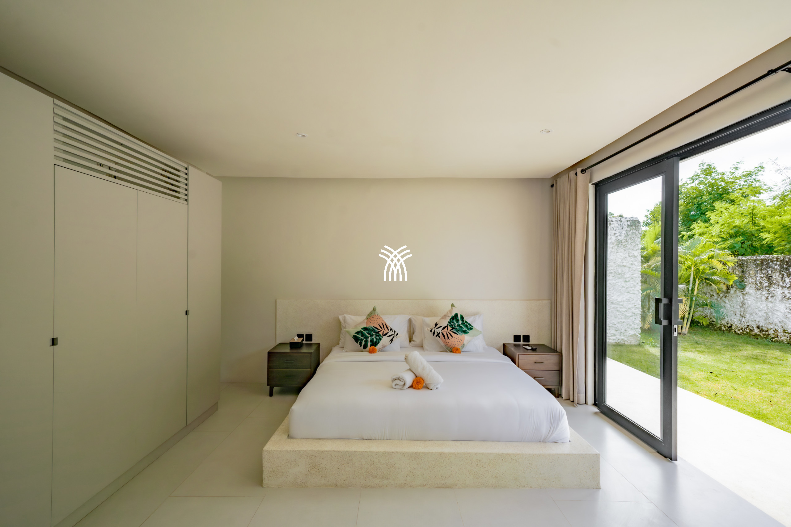 Conçue pour le confort et un mode de vie sans effort, la villa dispose de trois chambres spacieuses avec des lits king-size, des draps moelleux et la climatisation, complétées par des salles de bains élégantes avec des équipements modernes, des douches à effet pluie et de l'eau chaude. Une grande piscine privée et une piscine dédiée aux enfants sont encadrées par une verdure tropicale luxuriante, créant un cadre idyllique pour une détente ensoleillée et des moments rafraîchissants sous le ciel chaud de Bali. L'espace de vie ouvert, rehaussé par de grandes parois vitrées, invite la lumière naturelle à circuler harmonieusement dans l'espace, tandis que la cuisine moderne entièrement équipée et la salle à manger offrent le cadre parfait pour des repas partagés et des rassemblements mémorables.