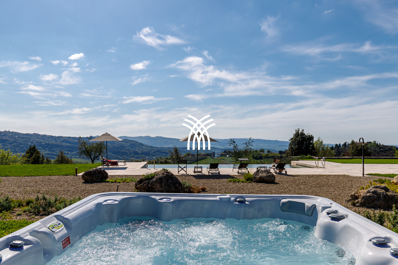 Sortez pour profiter de la piscine à débordement chauffée avec une vue panoramique, entourée de chaises longues et de parasols mobiles. Un jacuzzi extérieur réglé à 37°C invite à une détente totale, tandis qu'un brasero et un barbecue au bord de la piscine promettent des soirées inoubliables sous le ciel italien. Pour les loisirs, les invités peuvent profiter du ping-pong et du bowling sur gazon, créant l'équilibre parfait entre détente et luxe.