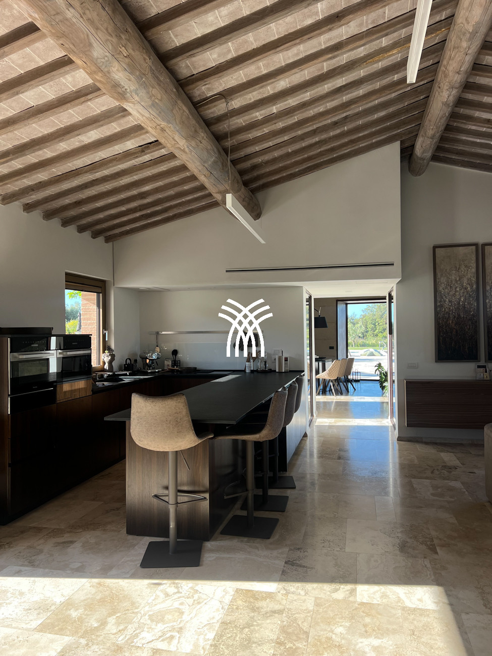 Les intérieurs de la villa sont une vitrine du savoir-faire italien et du design éco-responsable. Des matériaux naturels et des produits de nettoyage biodégradables sont utilisés dans toute la maison, créant un environnement de vie raffiné et responsable. Les panneaux solaires chauffent l'eau, tandis que les pompes à chaleur régulent la température de la piscine selon les saisons. Le système de climatisation par le sol garantit un confort tout au long de l'année, et un jardin aromatique attire les papillons et les abeilles tout en fournissant des herbes fraîches pour vos repas.