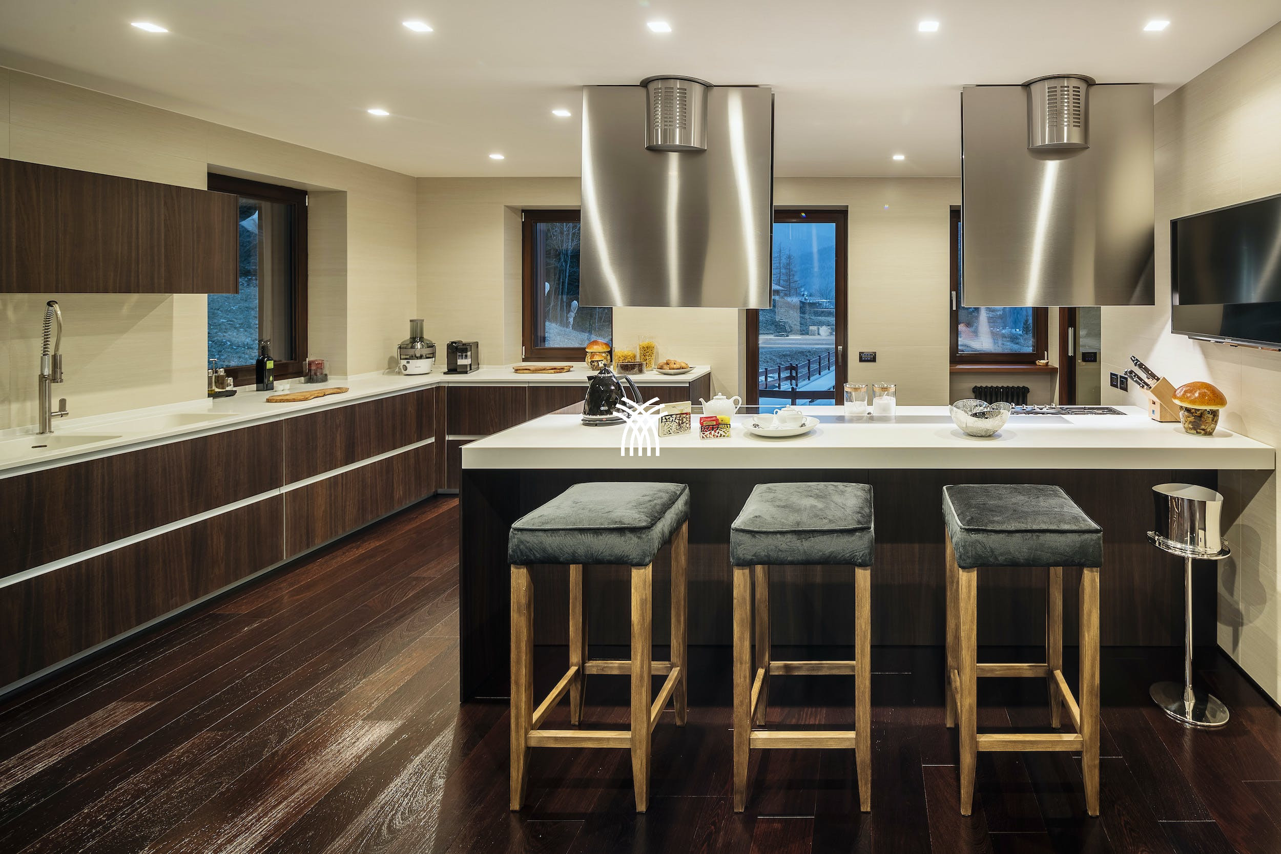The main living area at Chalet Genepi blends comfort and sophistication with a stylish wet bar, plush sofas, and a cozy fireplace, seamlessly connected to a refined dining area and an ultra-modern kitchen with a central island, equipped with premium professional appliances.