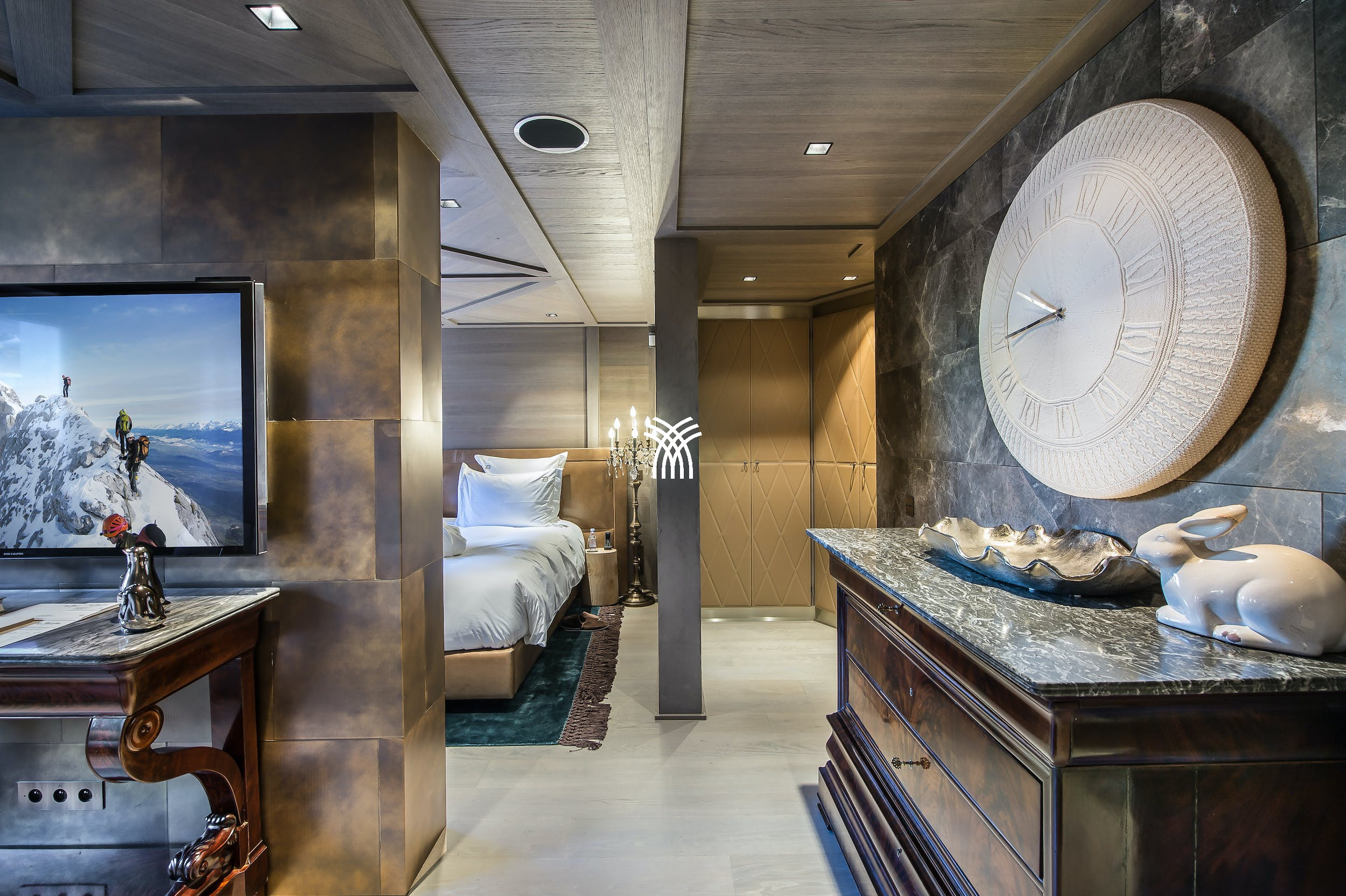 Chalet Diamant accommodates up to ten guests in absolute luxury. The master suite and four additional double bedrooms each offer stunning mountain views and beautifully designed en-suite bathrooms, providing restful sanctuaries where comfort and elegance come together.