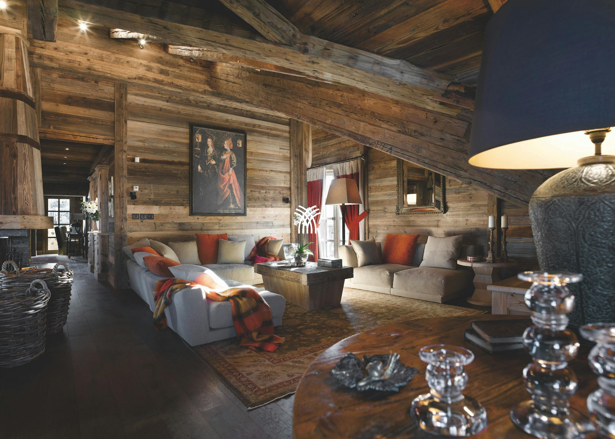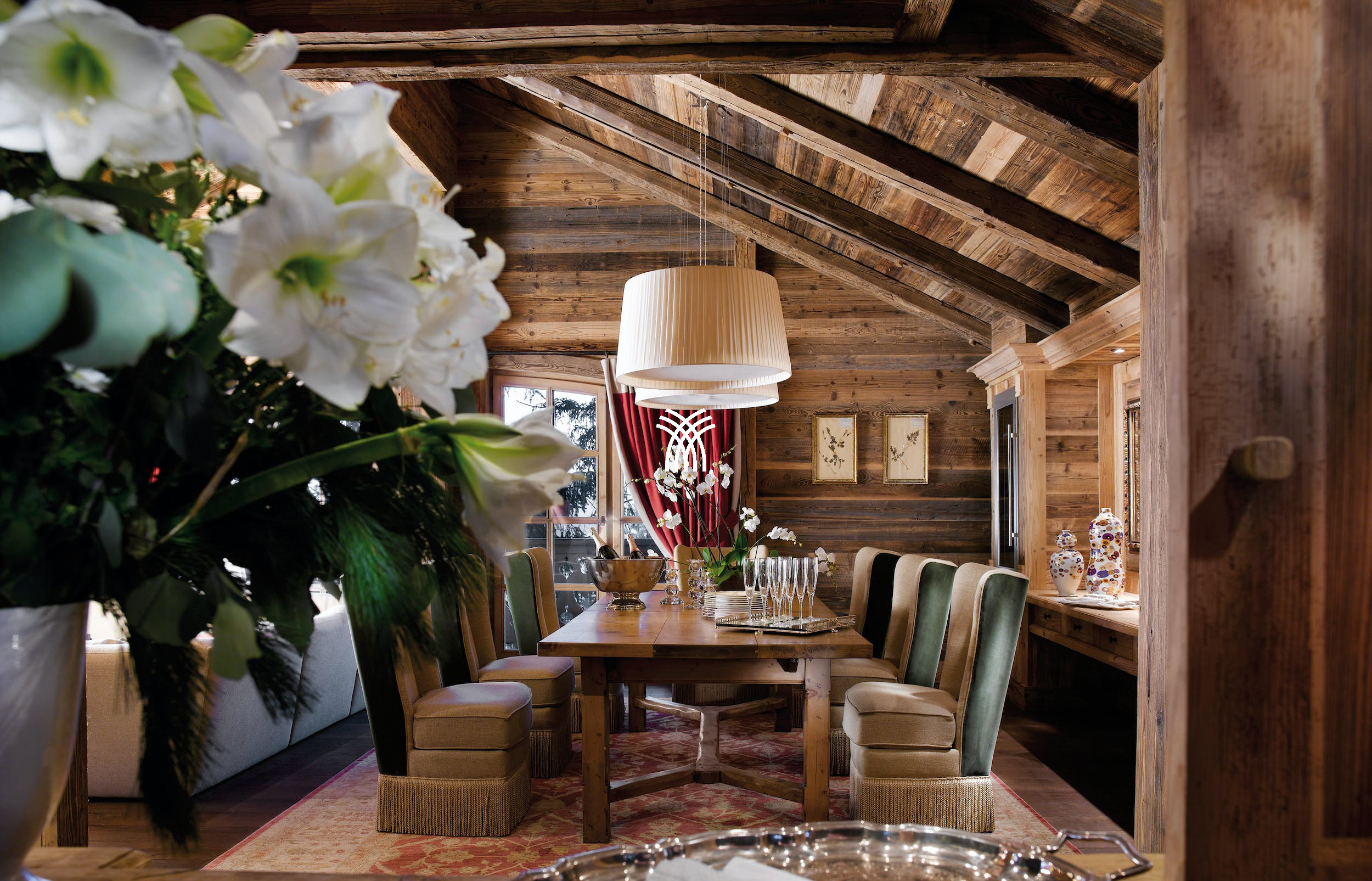 The main living area is the heart of the chalet, where a romantic wood-burning fireplace creates a warm and welcoming focal point. Plush sofa seating surrounds the fire, offering a cosy and sociable space to relax with family and friends. Upstairs, the elegant dining room with seating for fifteen opens onto a terrace that showcases stunning mountain vistas.