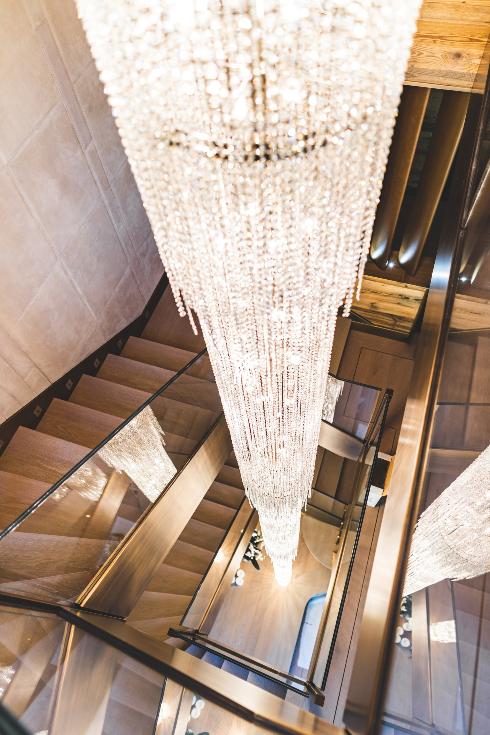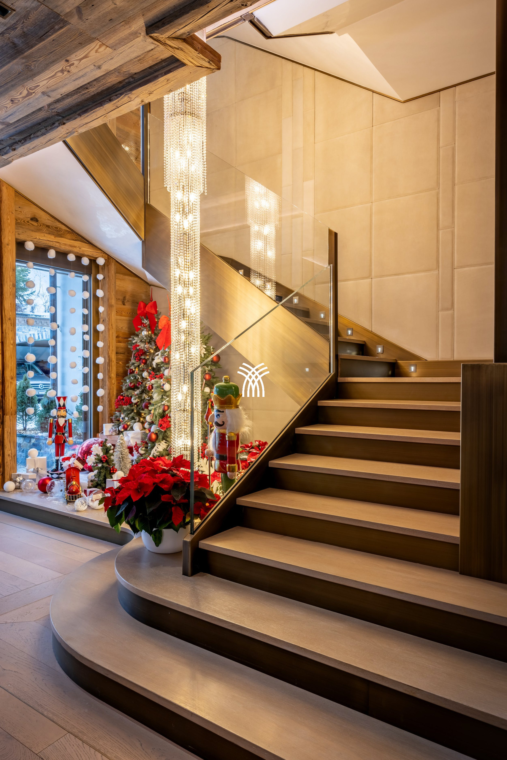 This luxury chalet for rent in Crans-Montana stands out for its fully privatisable structure, consisting of two connected chalets, capable of accommodating up to 38 guests. The 14 luminous suites, dressed in noble wood and featuring panoramic views, elegantly blend mountain spirit with contemporary design. The interior decoration, conceived as a muted cocoon, highlights the surrounding nature and local craftsmanship while integrating the latest technologies.