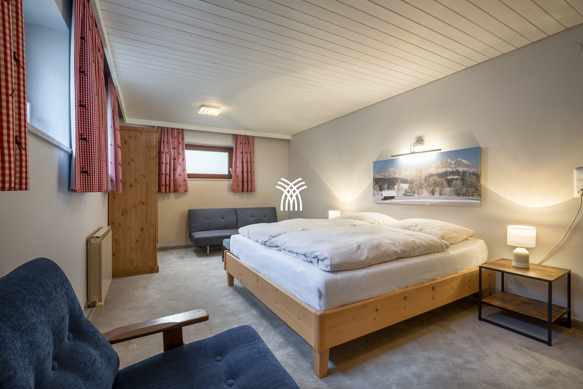 With its 600 m² of interior space and its vast flat garden of 2000 m², the Kirchberg Chalet welcomes up to fourteen travellers in generous and refined spaces. The bedrooms, spread across several levels, each offer their own bathroom, creating a cocoon of intimacy and comfort for each guest. The living areas, bathed in light thanks to their open architecture and mountain views, invite sharing long moments around the fire, in the immense lounge with a fireplace, a modern television and a large family table. The main kitchen, installed in 2024, is fully equipped and designed for gastronomic stays, while additional kitchenettes harmoniously complement the chalet's spaces.