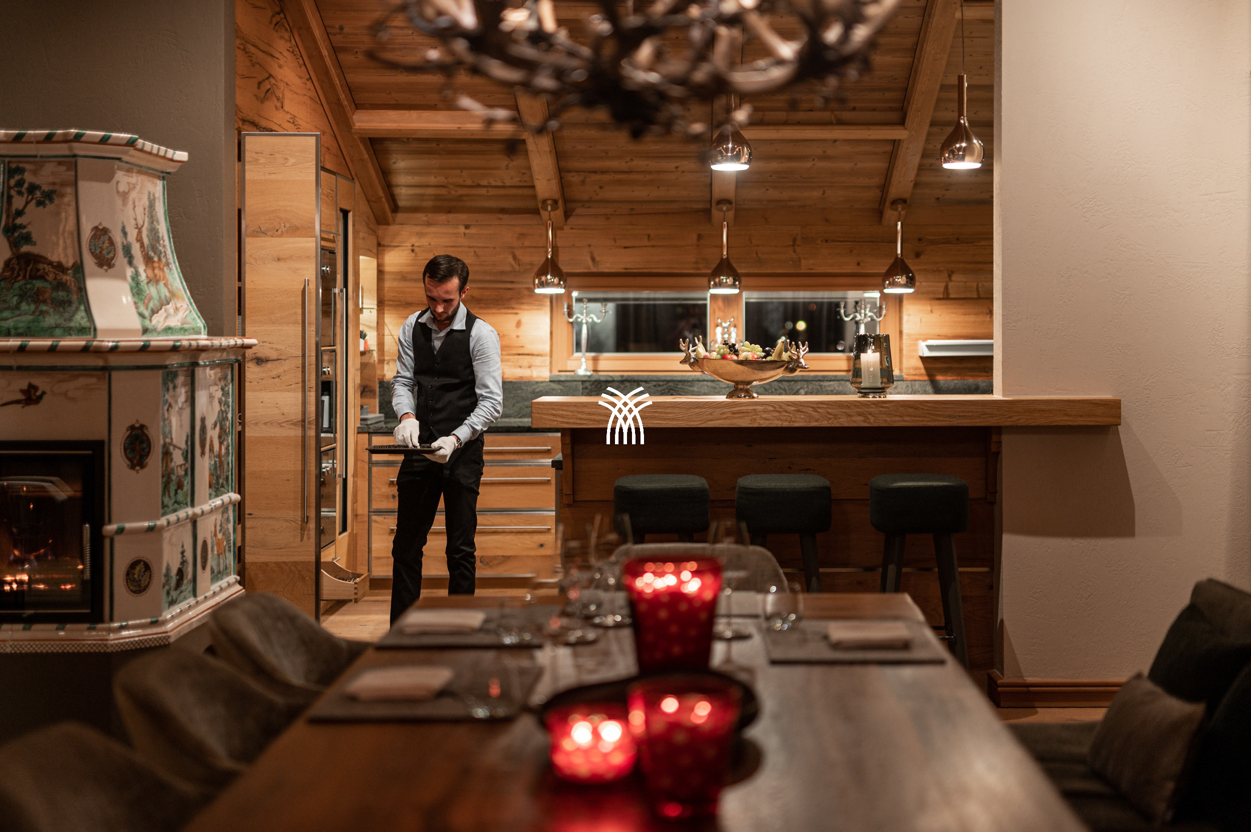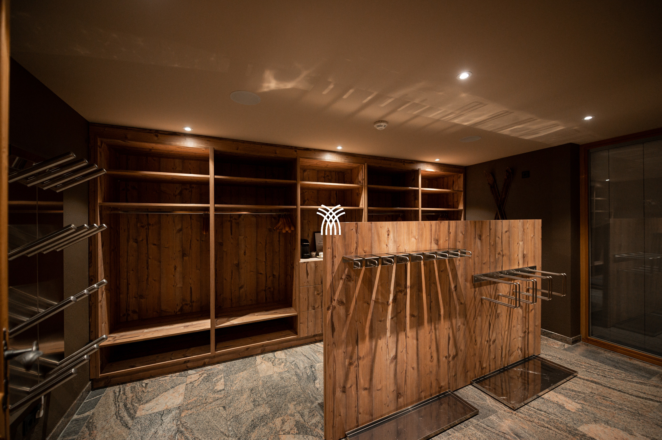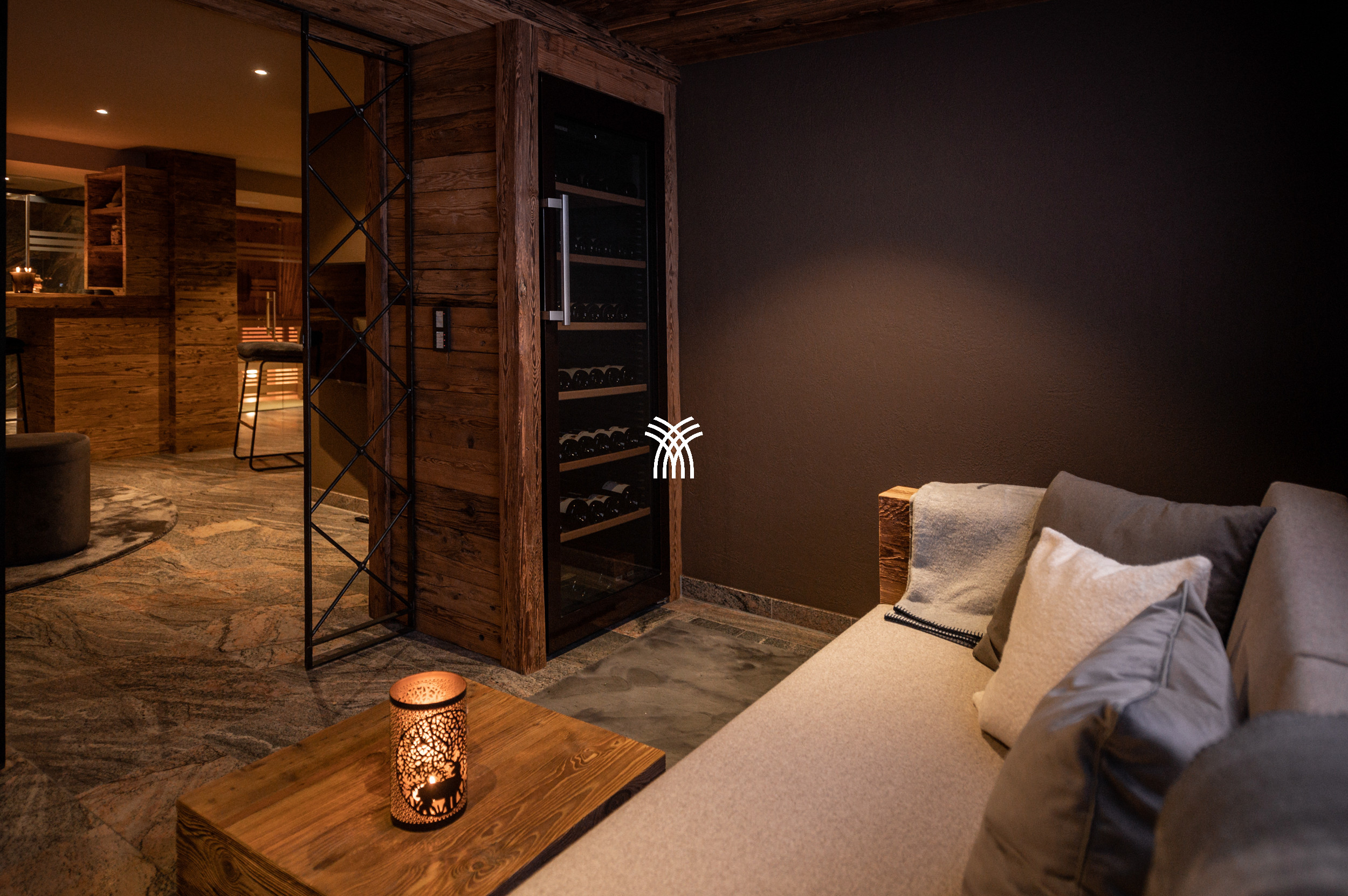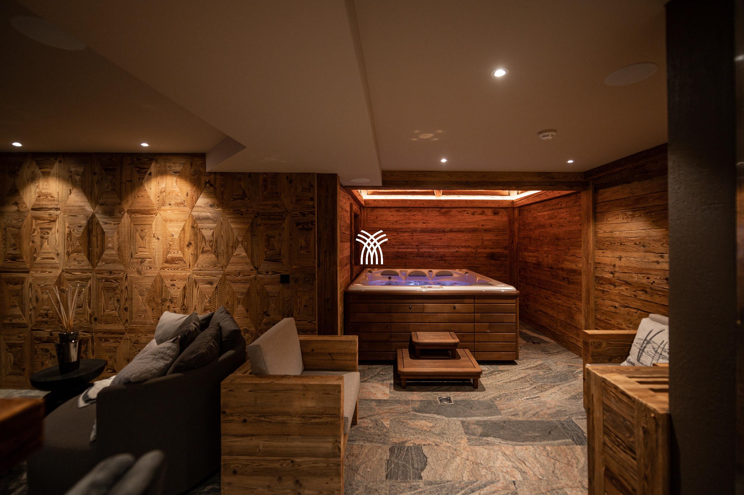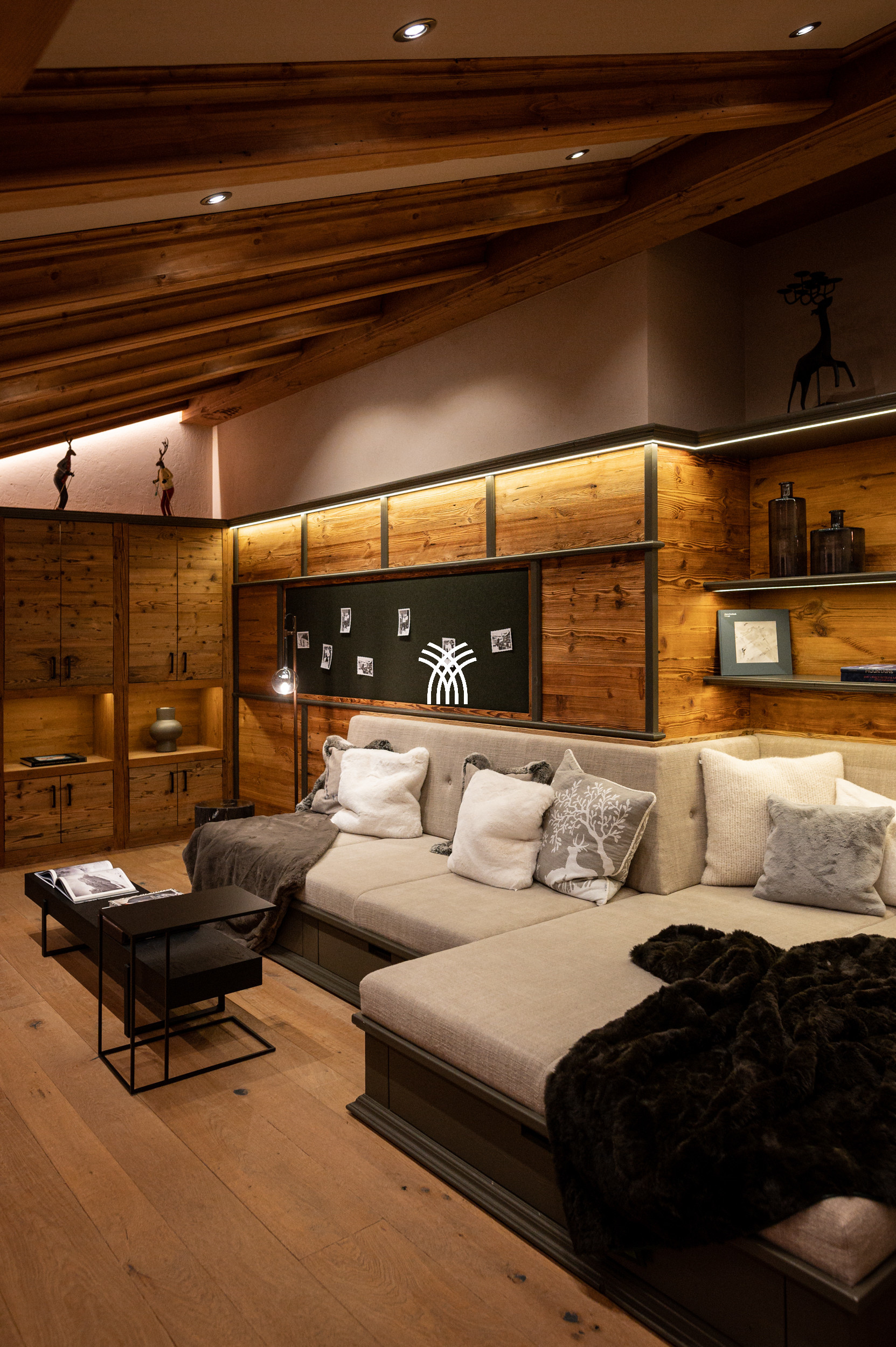 For entertainment, the chalet reveals a playful and luxurious side with its private party room, complete with a bar, darts, table soccer, pinball, multimedia system, and even a private cinema, ensuring unforgettable moments for every guest. Covered parking adds to the convenience, while the overall design reflects a unique symbiosis of tradition and contemporary influences, making Arla a truly distinctive alpine residence.