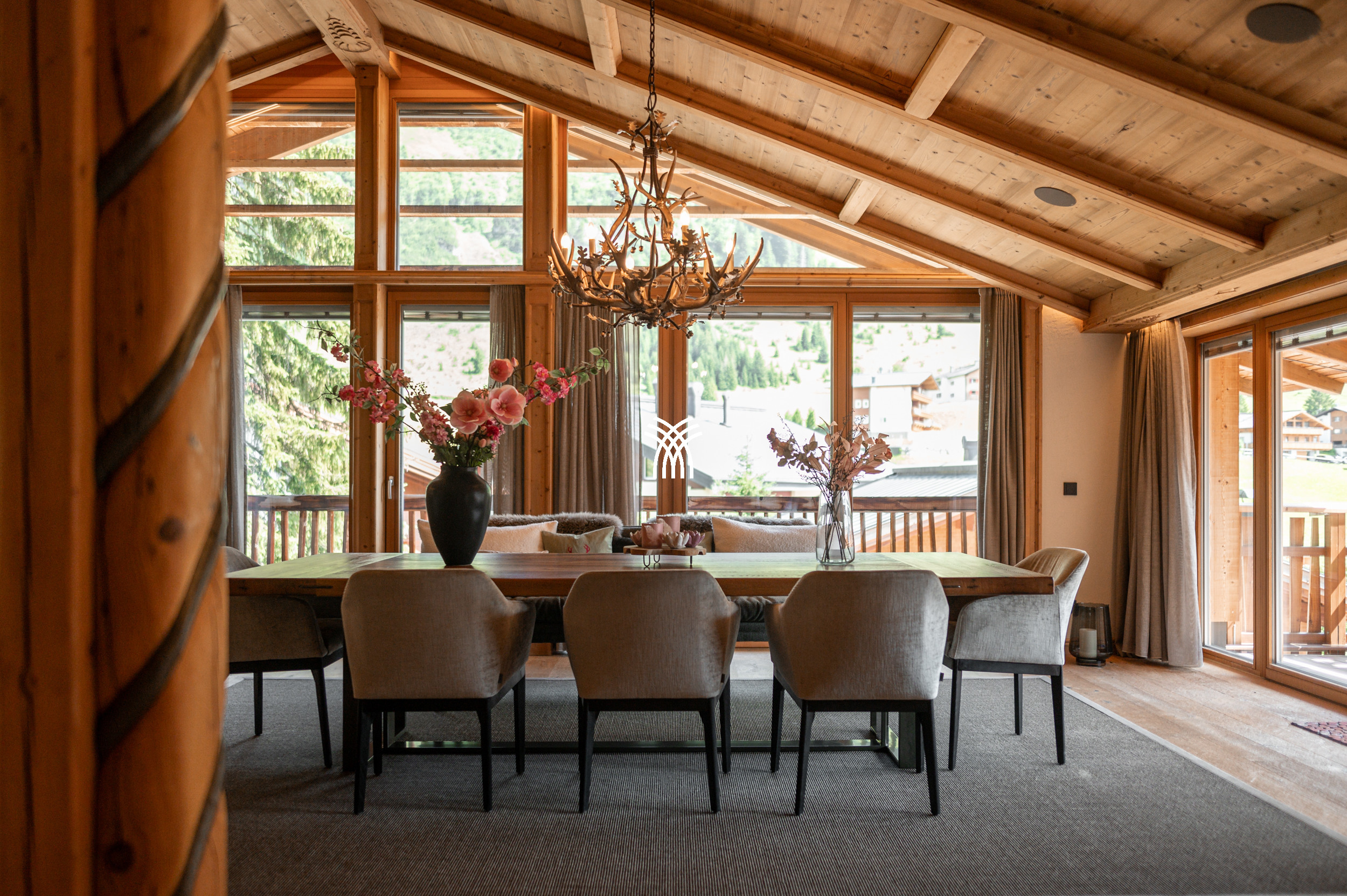 At the heart of the chalet, a grand living and dining area unfolds with effortless grace. A crackling open fireplace sets the tone for cozy evenings, while the spacious dining area and inviting sofa lounge create the perfect setting for gathering after a day on the slopes. From the comfort of your seat, take in uninterrupted views of the iconic Omeshorn and Rüfikopf mountains, a breathtaking backdrop that defines the essence of Lech.