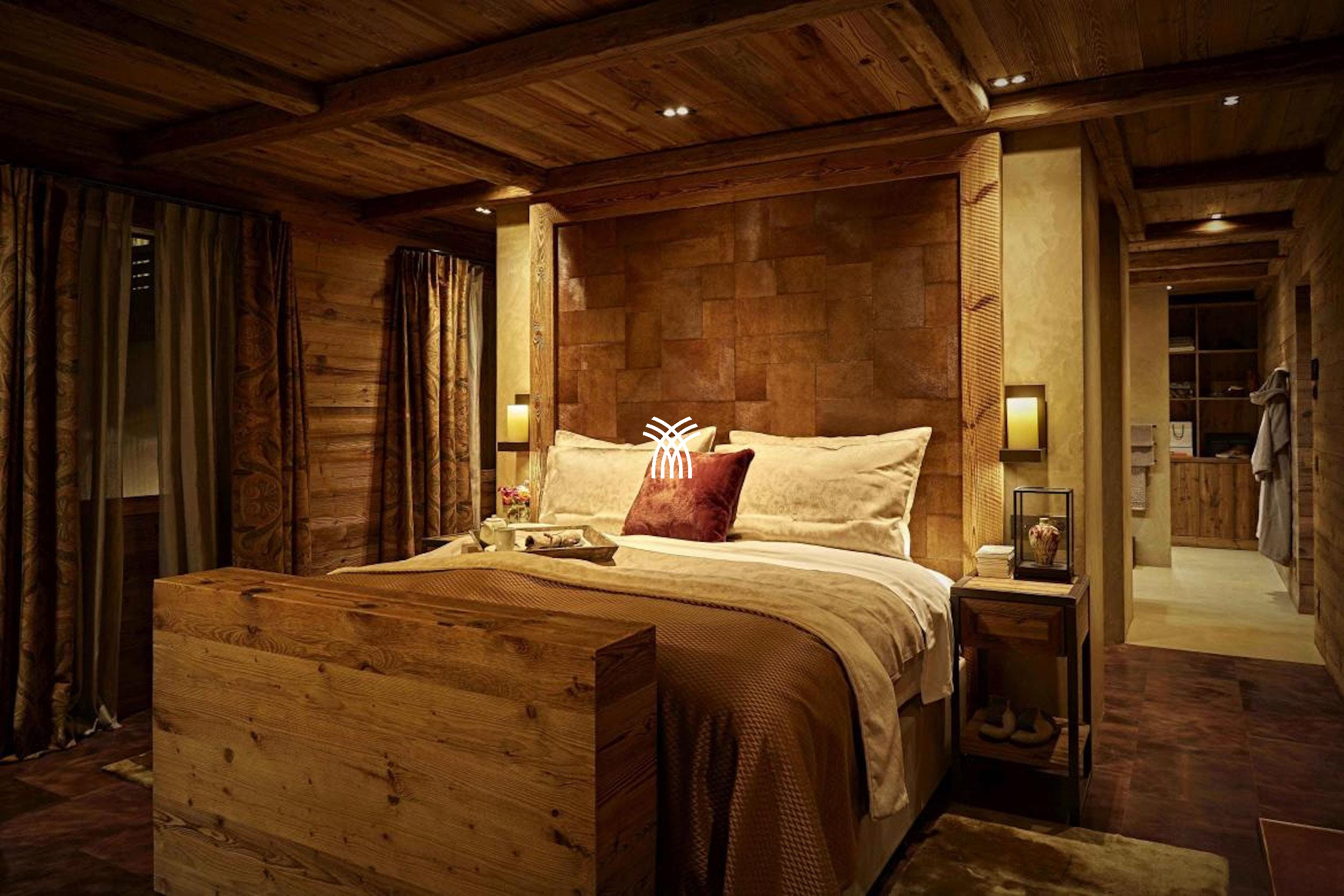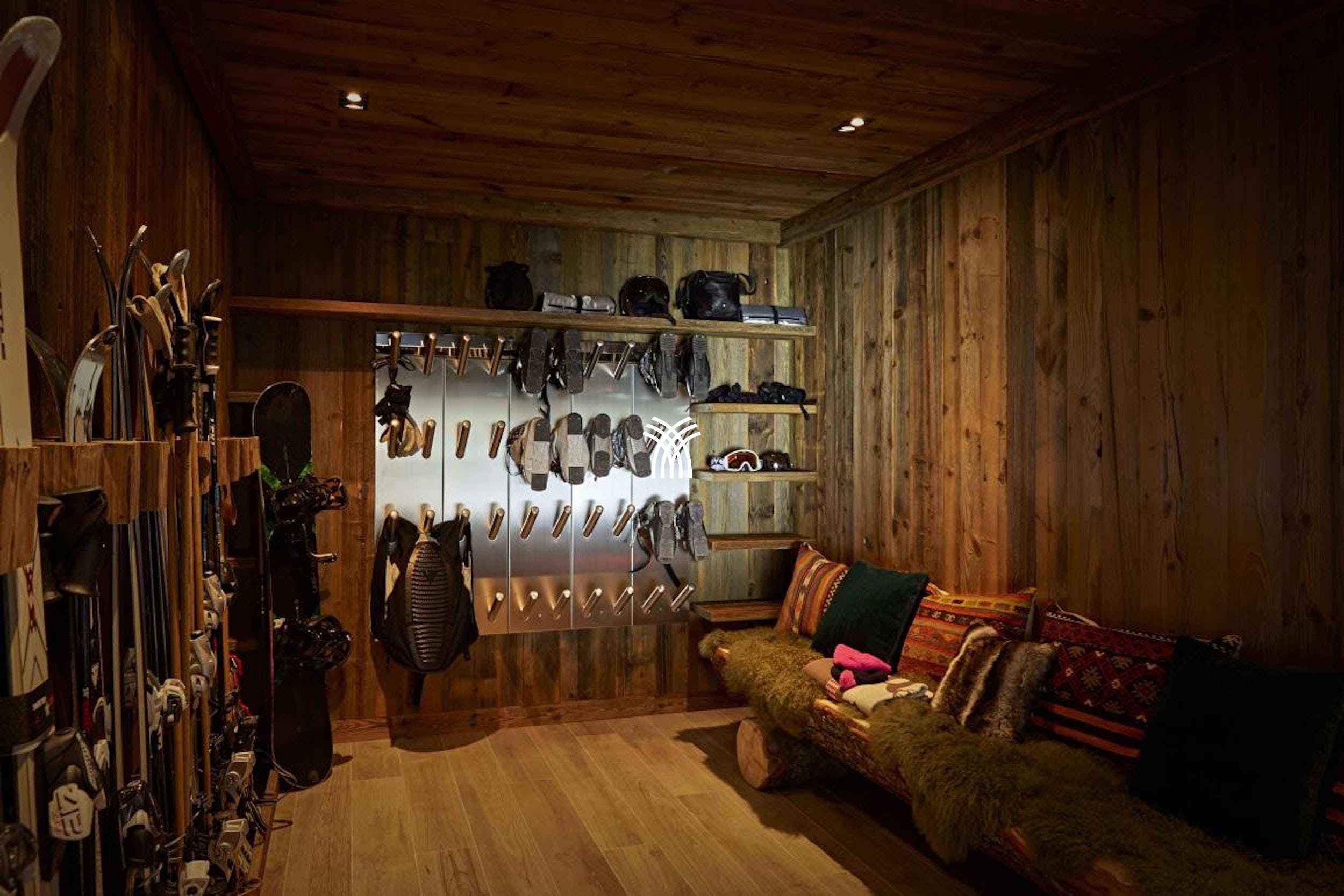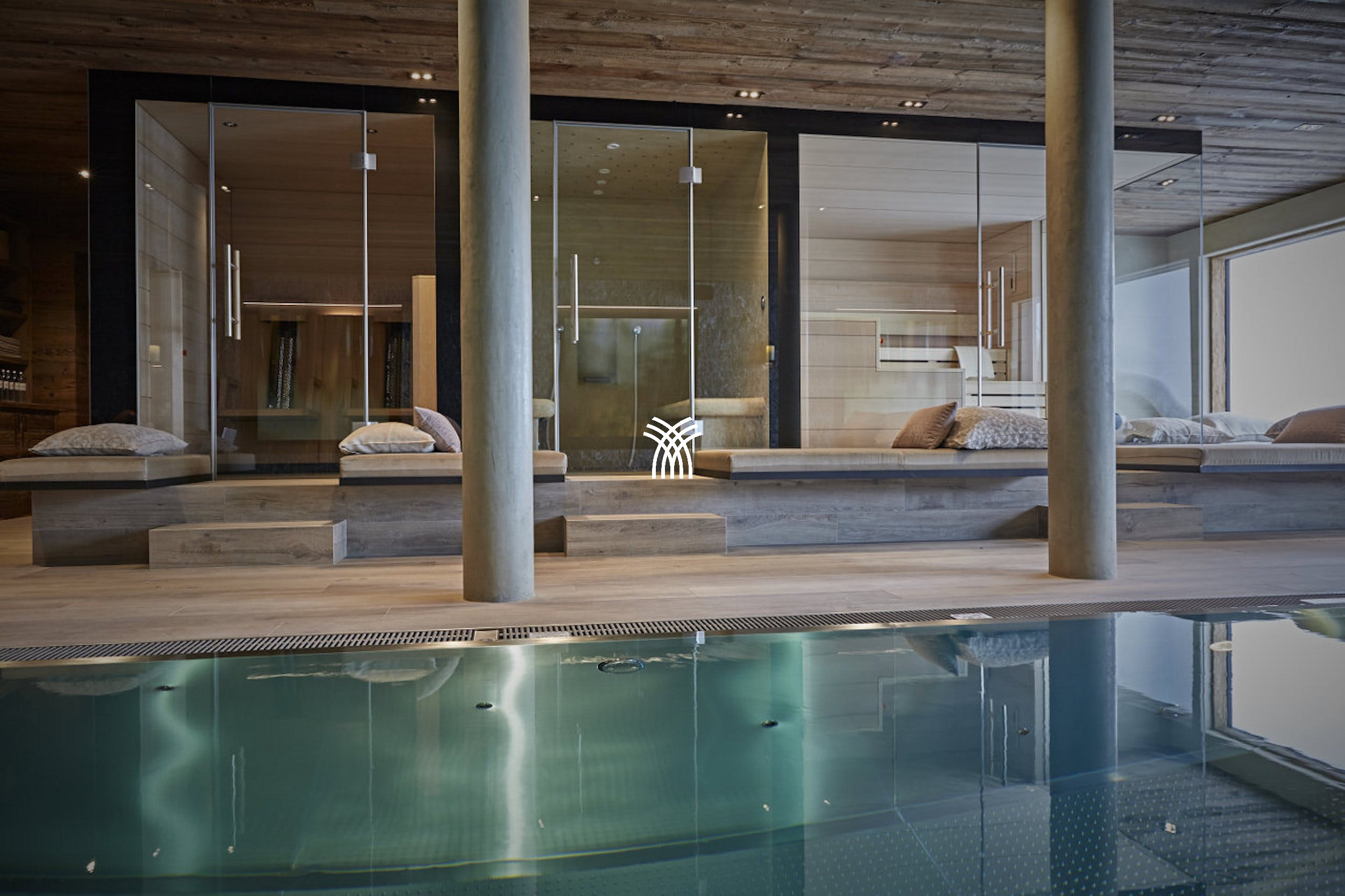 The chalet’s wellness area is a sanctuary of relaxation, with pale wood and natural stone creating a soothing ambiance. Indulge in the indoor pool, hot tub, saunas, and private treatment room, or retreat to the games room, complete with a second bar, football table, and a curated collection of vinyl records. The cosy bar and wine cellar add to the warm, inviting atmosphere.