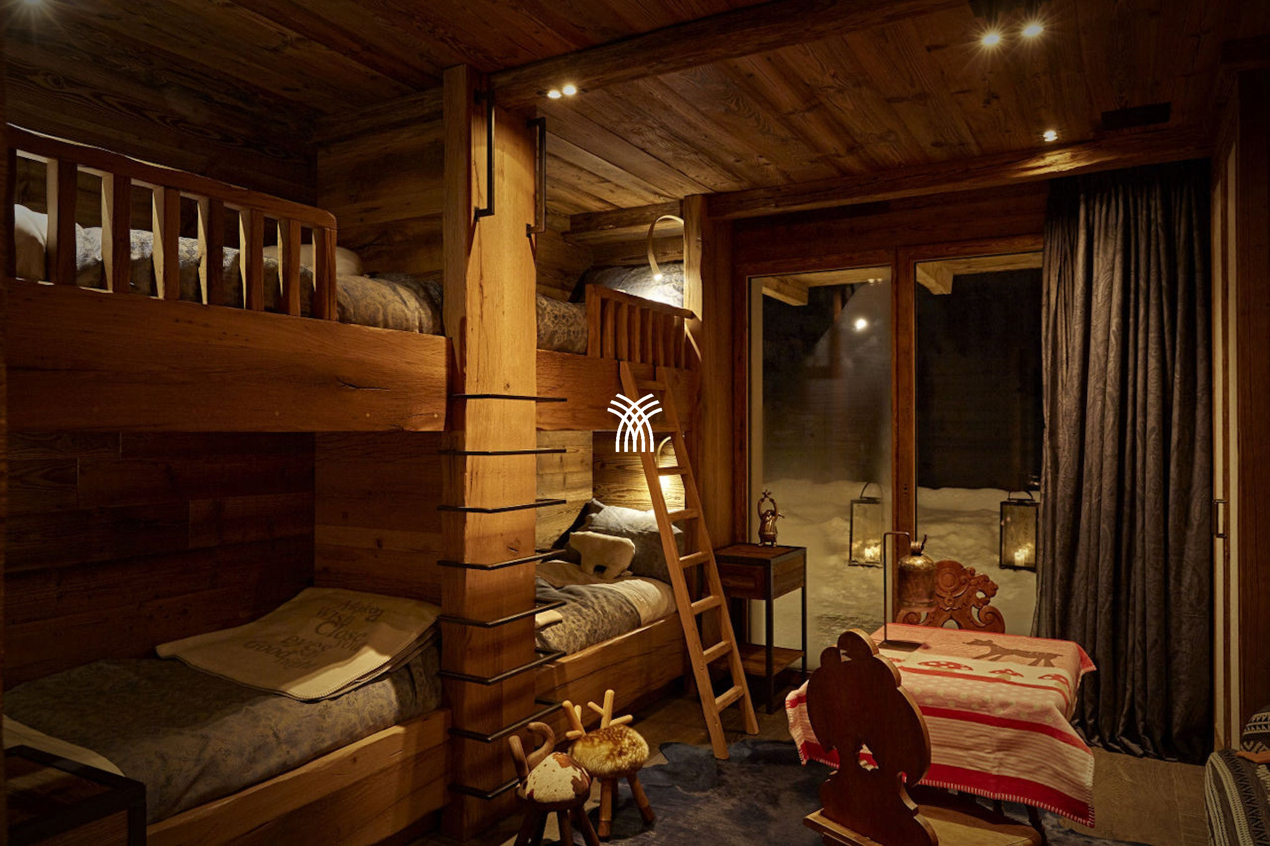 Each of the four double bedrooms features an elegant en-suite bathroom, while a dedicated children’s bunk room with its own shower room ensures comfort for younger guests. All bedrooms are decorated in calming neutral tones, accented with rich velvets and rustic timbers to evoke the charm of alpine living.