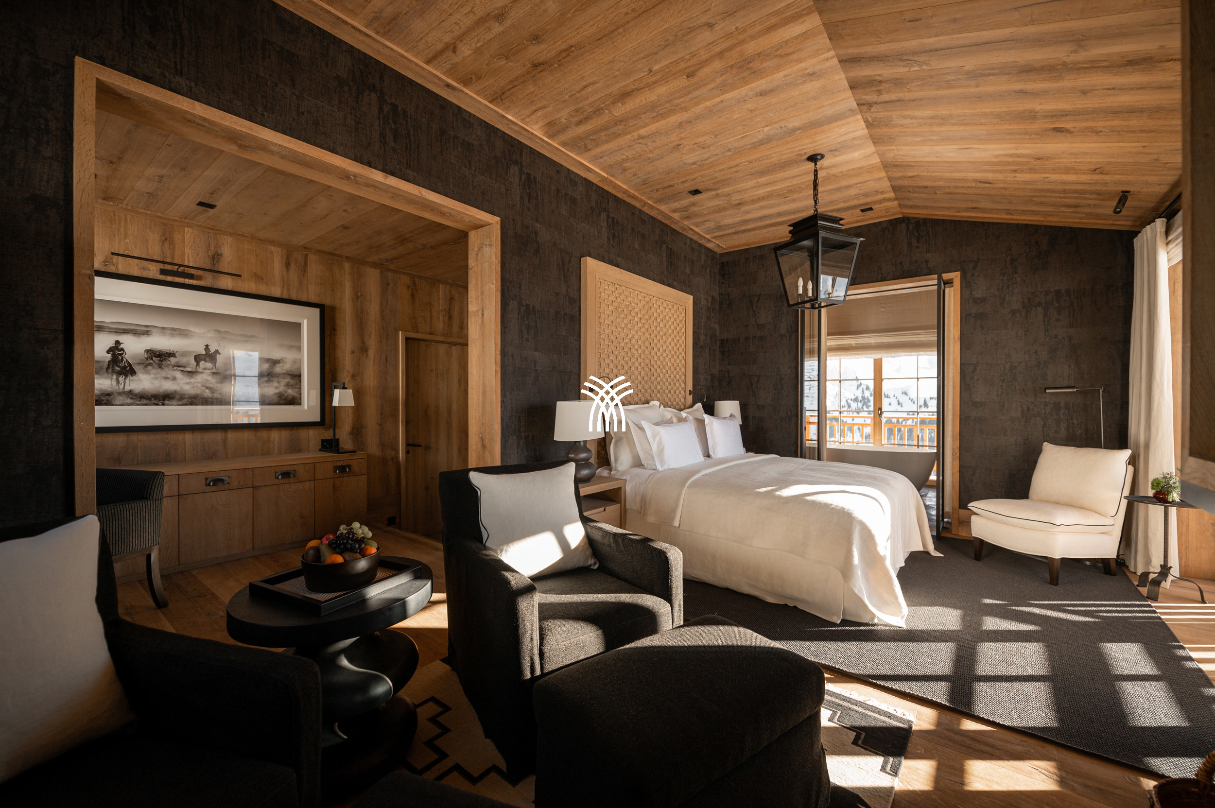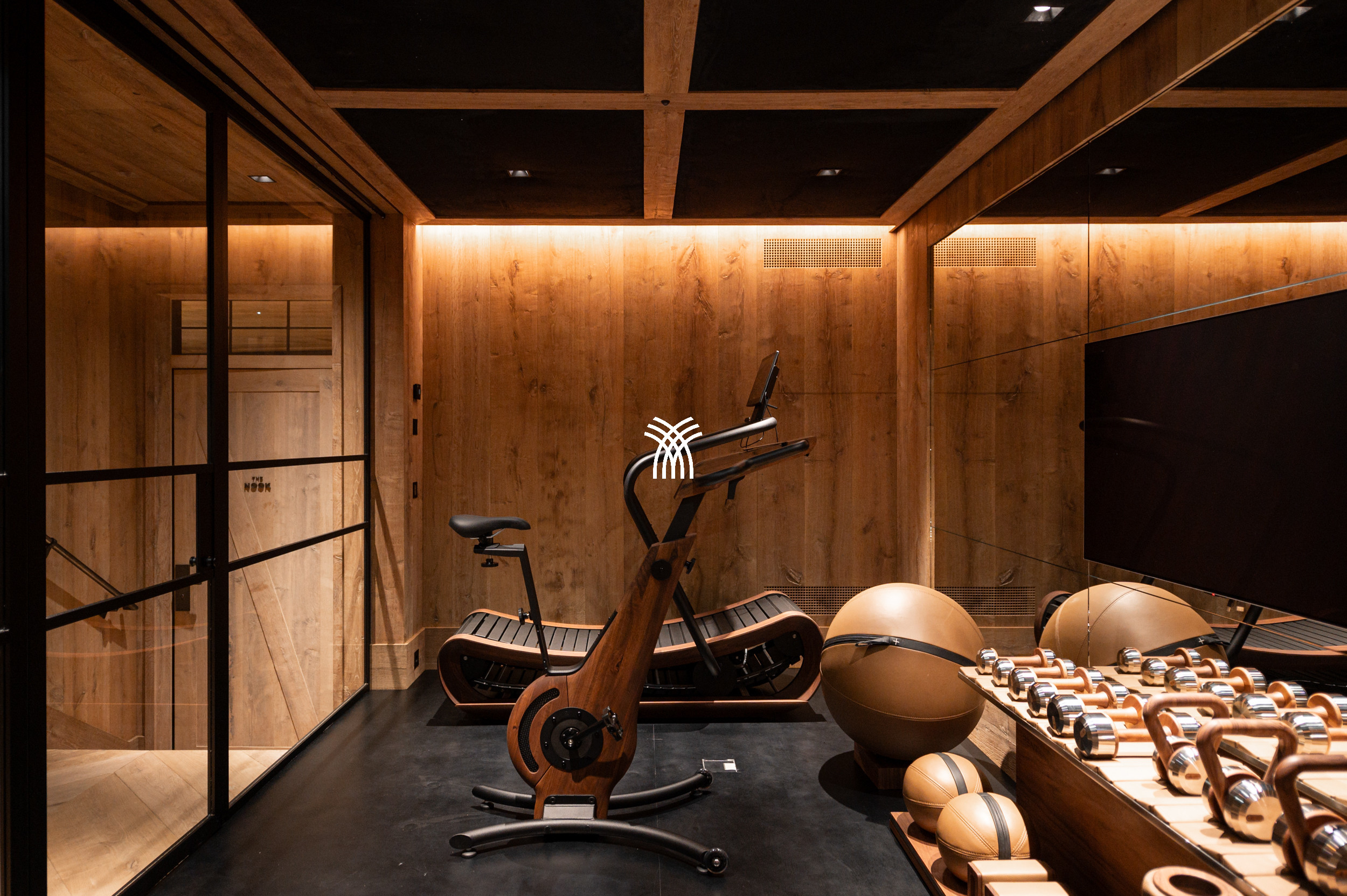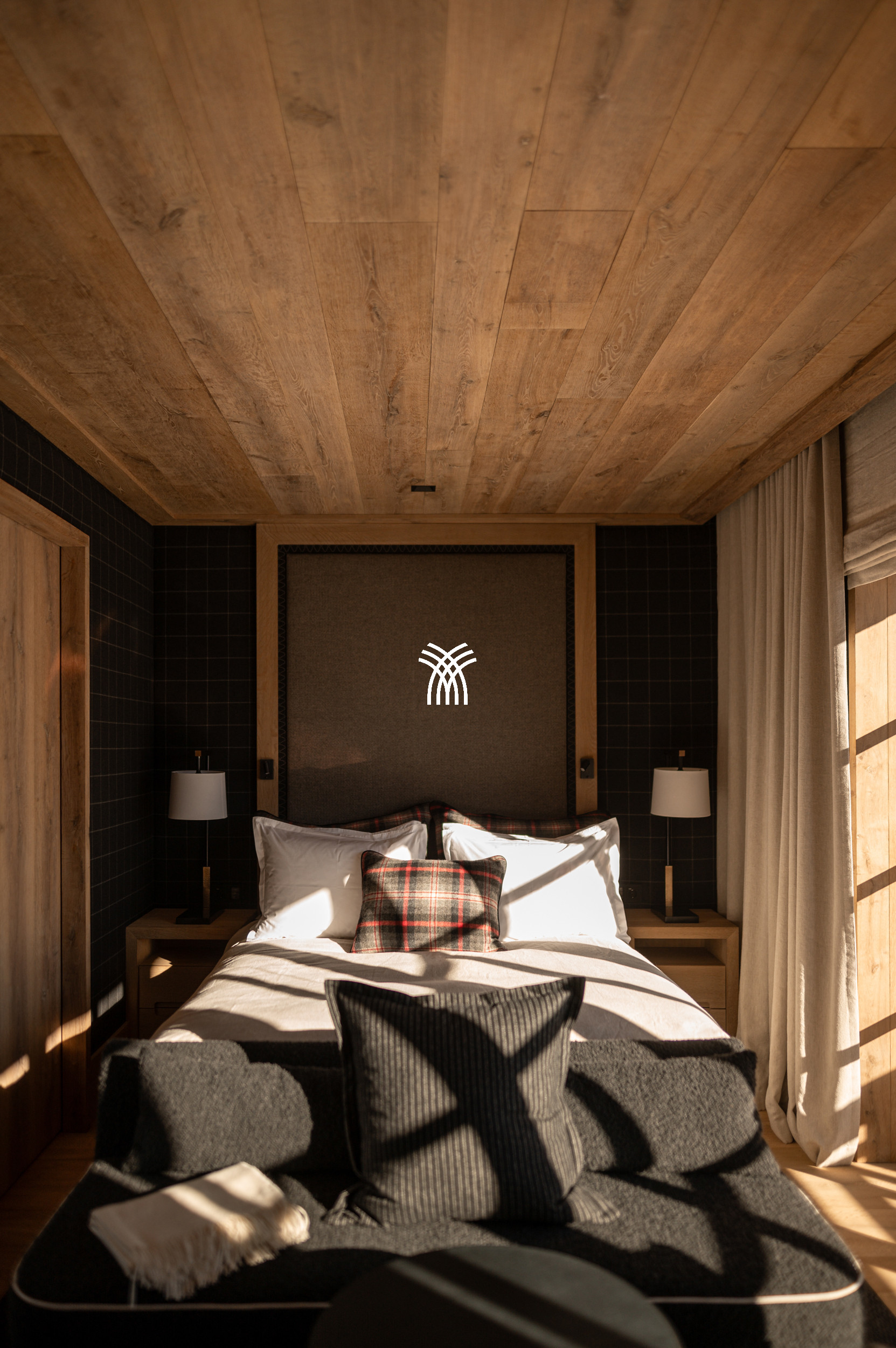 Inside, pale timbered walls, muted tones, and subtle rustic touches create a warm, inviting atmosphere that feels both luxurious and homely. The state-of-the-art spa is a highlight, featuring a serene indoor pool, sauna, and treatment room, while the rooftop hot tub offers breathtaking views of the surrounding peaks.