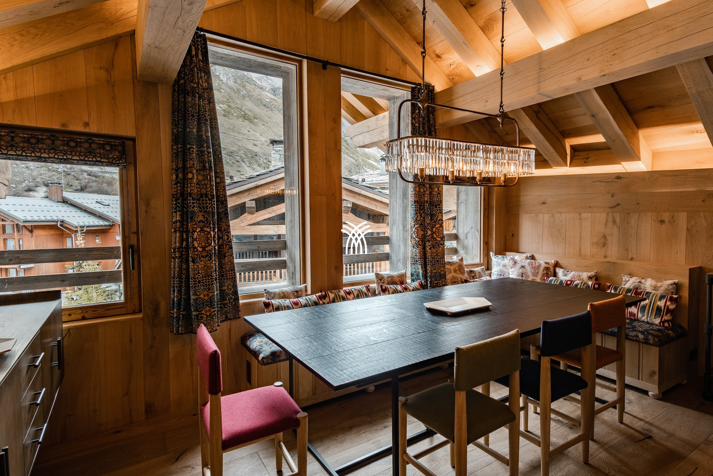 The second floor reveals a spacious and light-filled living area centred around a welcoming open fire. From the comfort of this serene space, floor-to-ceiling windows and a furnished terrace frame magnificent views of the surrounding peaks. The elegant dining room, seating up to nine guests, offers the perfect setting for gourmet meals prepared in the fully equipped kitchen. A dedicated desk area provides space for remote working or quiet reflection.