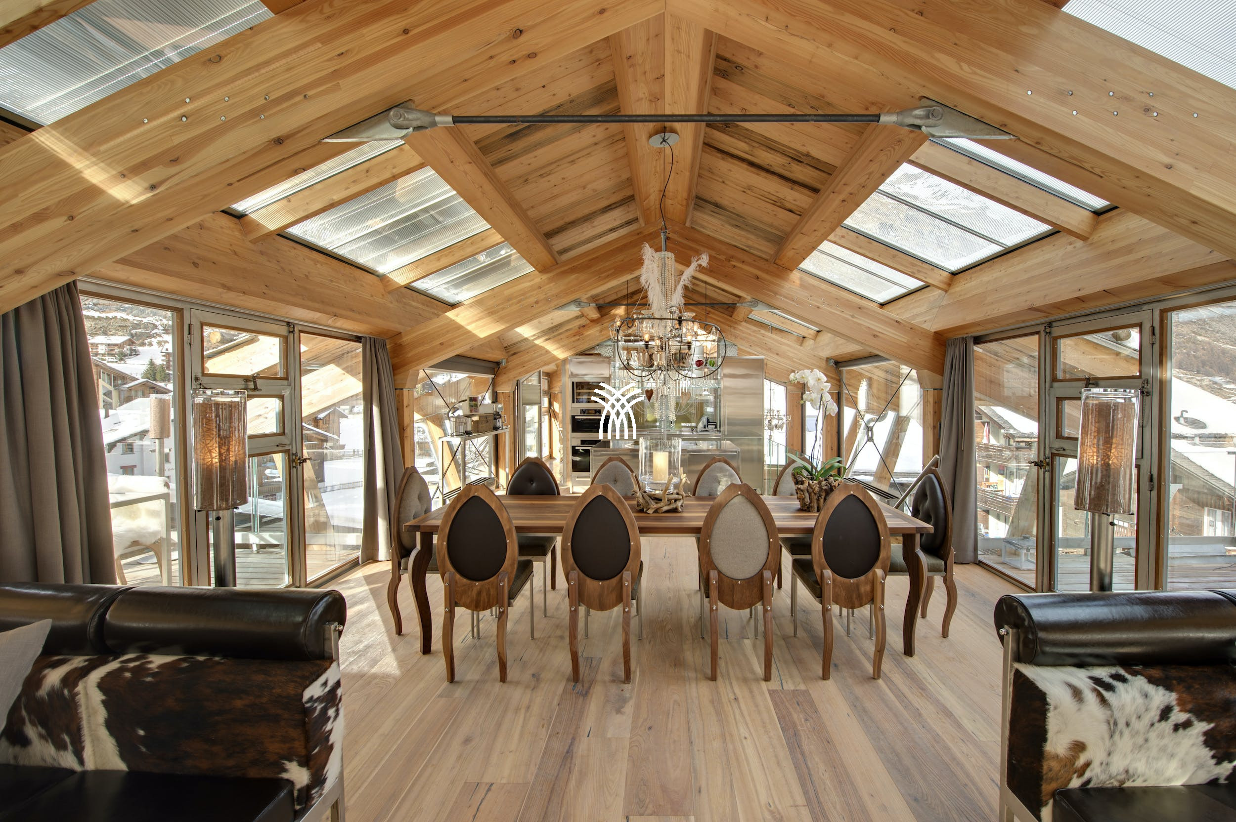The expansive open-plan living spaces feature soaring floor-to-ceiling windows, a glass roof that invites the mountain sky indoors, a plush wrap-around sofa, an inviting open fireplace, and uninterrupted views of the enchanting village of Zermatt and the iconic Matterhorn. Step onto the generous wrap-around balcony to immerse yourself in a panoramic masterpiece, basking in sunshine throughout the year while gazing over three distinct ski areas and the ever-changing beauty of the Alps.
