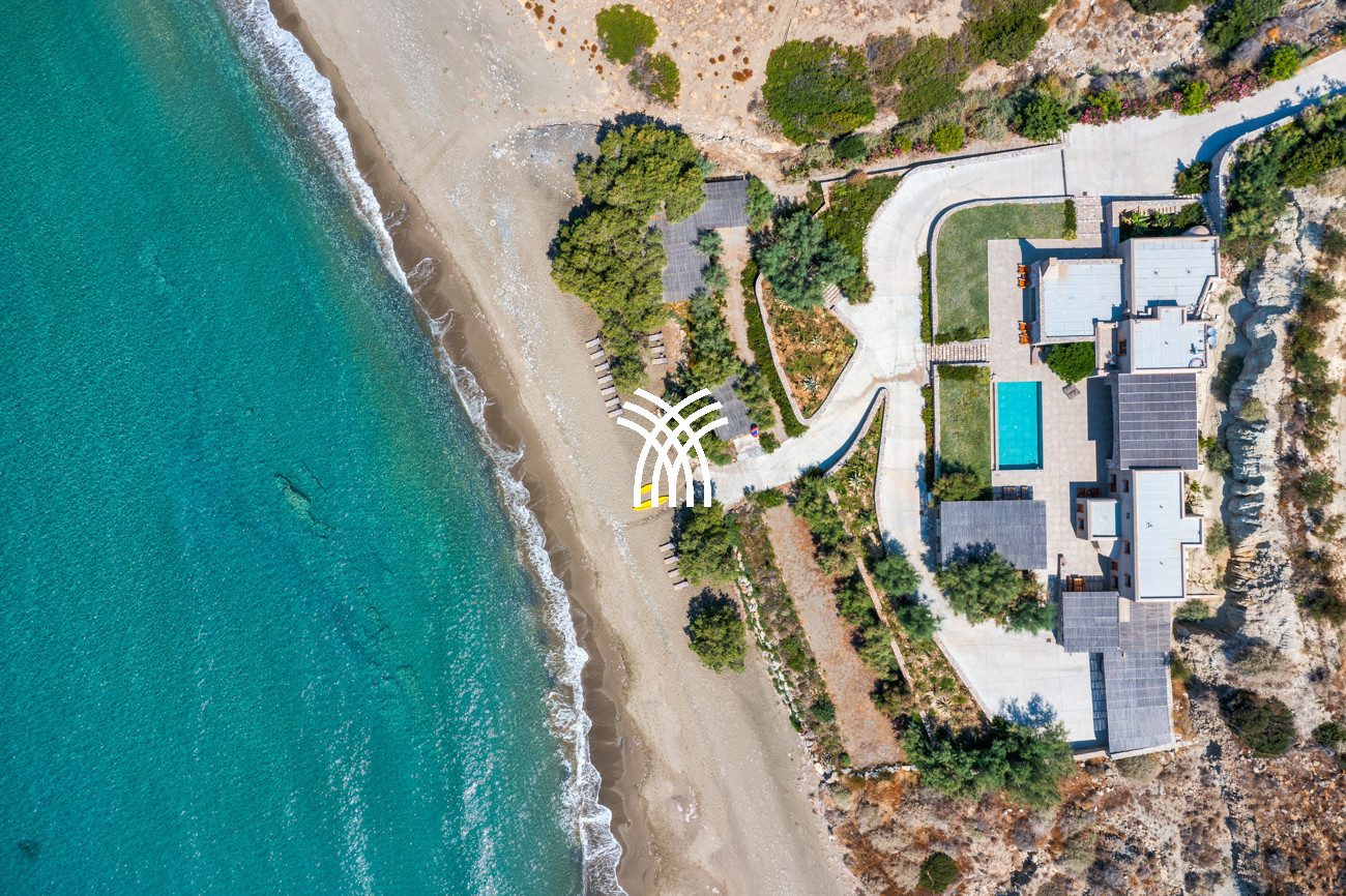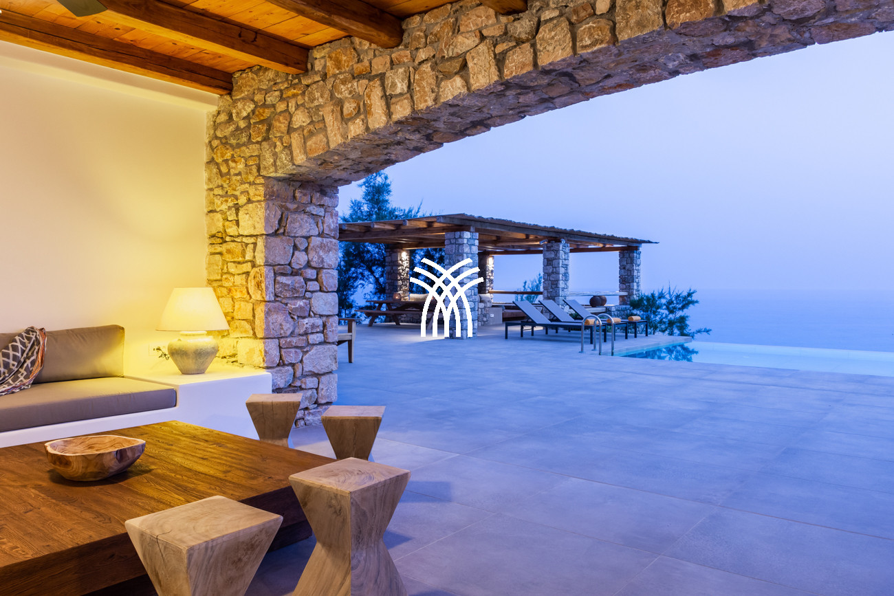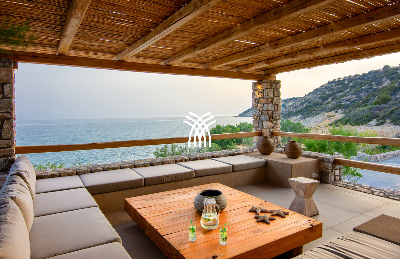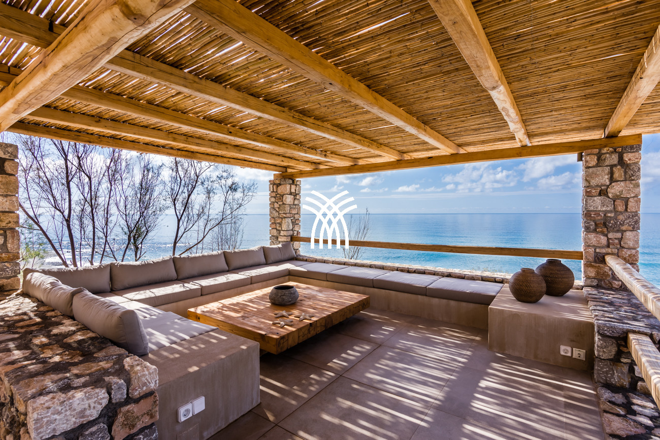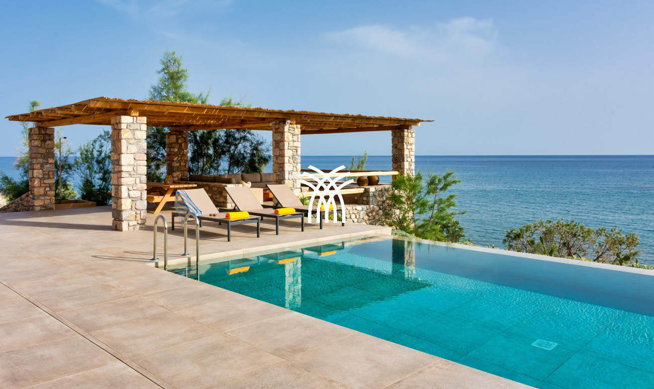 Just a few steps from the beach, this luxury seafront villa reveals uninterrupted views of the horizon and the ocean, in absolute silence only punctuated by the sound of waves. Arriving at the property is an experience in itself: a winding path crosses an ancient olive grove, passes by a chapel dedicated to Saint Dimitrios and gradually leads to a natural promontory overlooking a reef with turquoise hues and an untouched sandy beach, gradually revealing this timeless refuge.