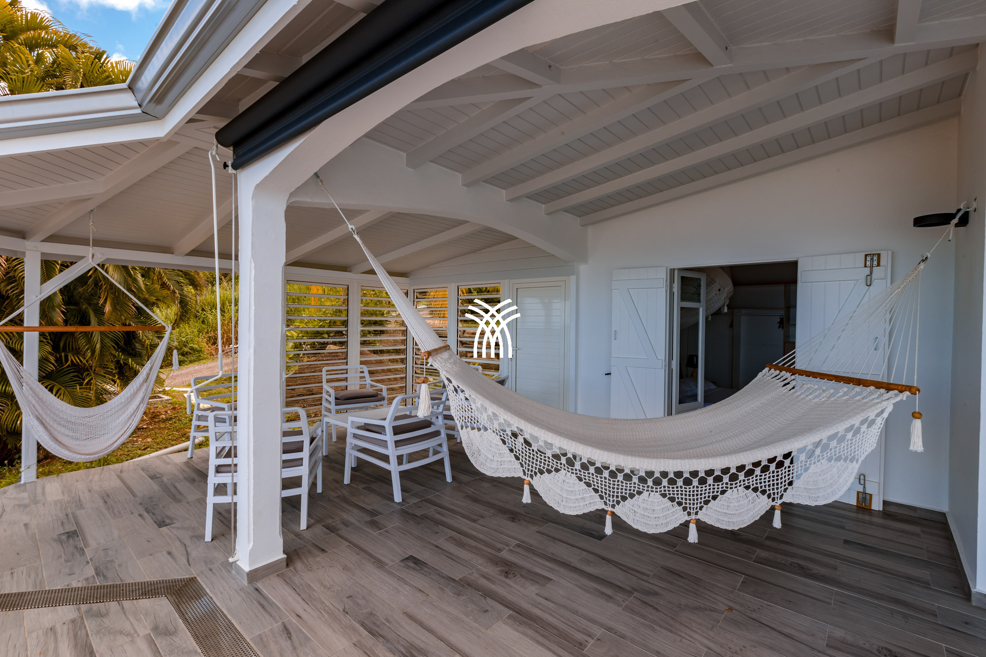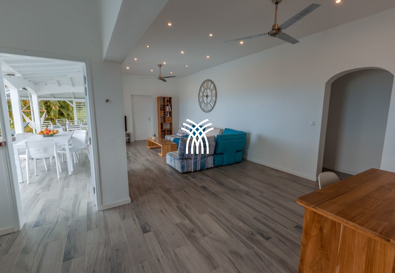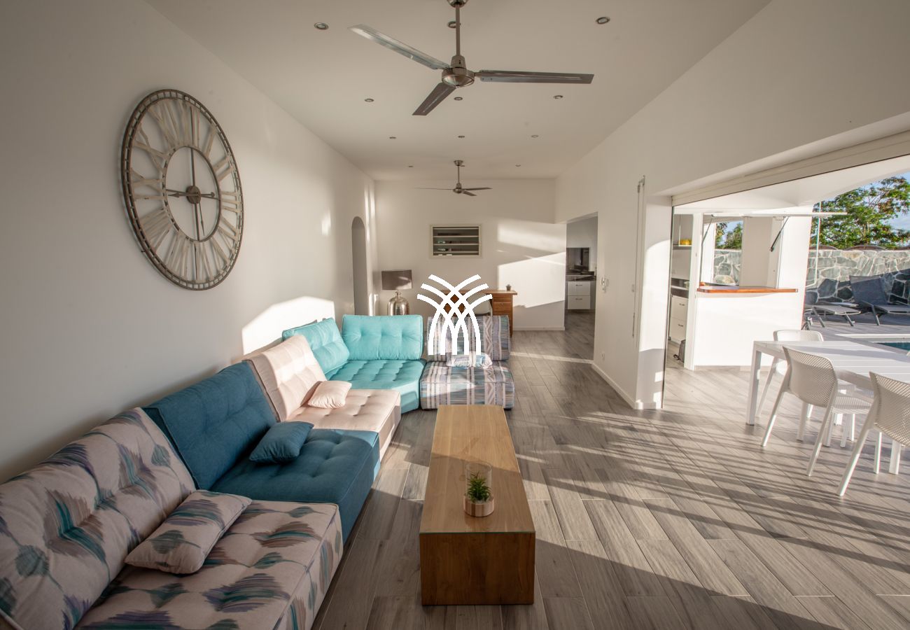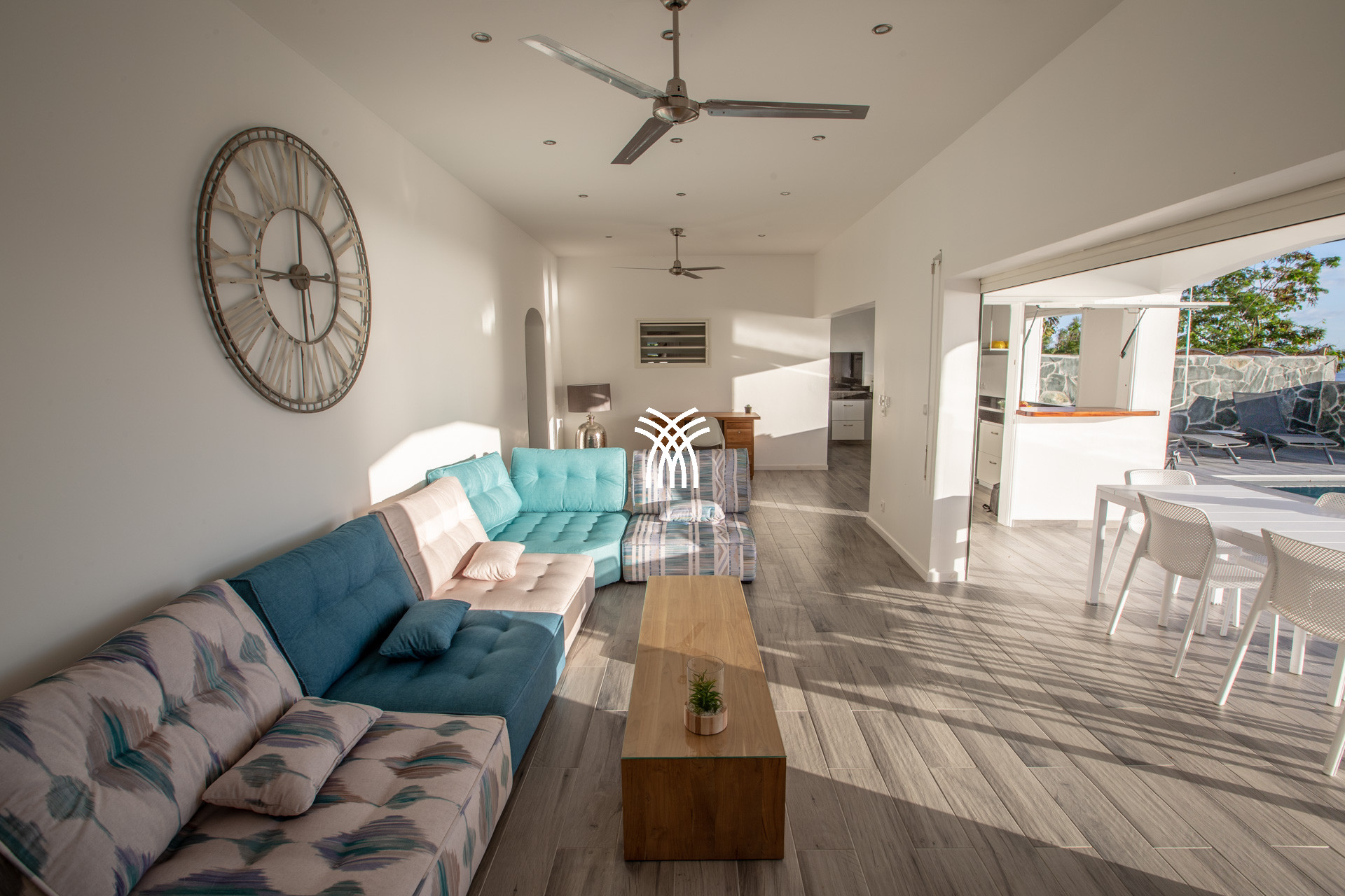 The main living area, bright and friendly, opens onto a fully equipped kitchen, ideal for exploring Creole cuisine flavours. Outside, the villa reveals a designed space that invites relaxation: an infinity mirror pool that blends into the horizon, sunbeds for lounging, and a lush tropical garden that frames this tranquil oasis.