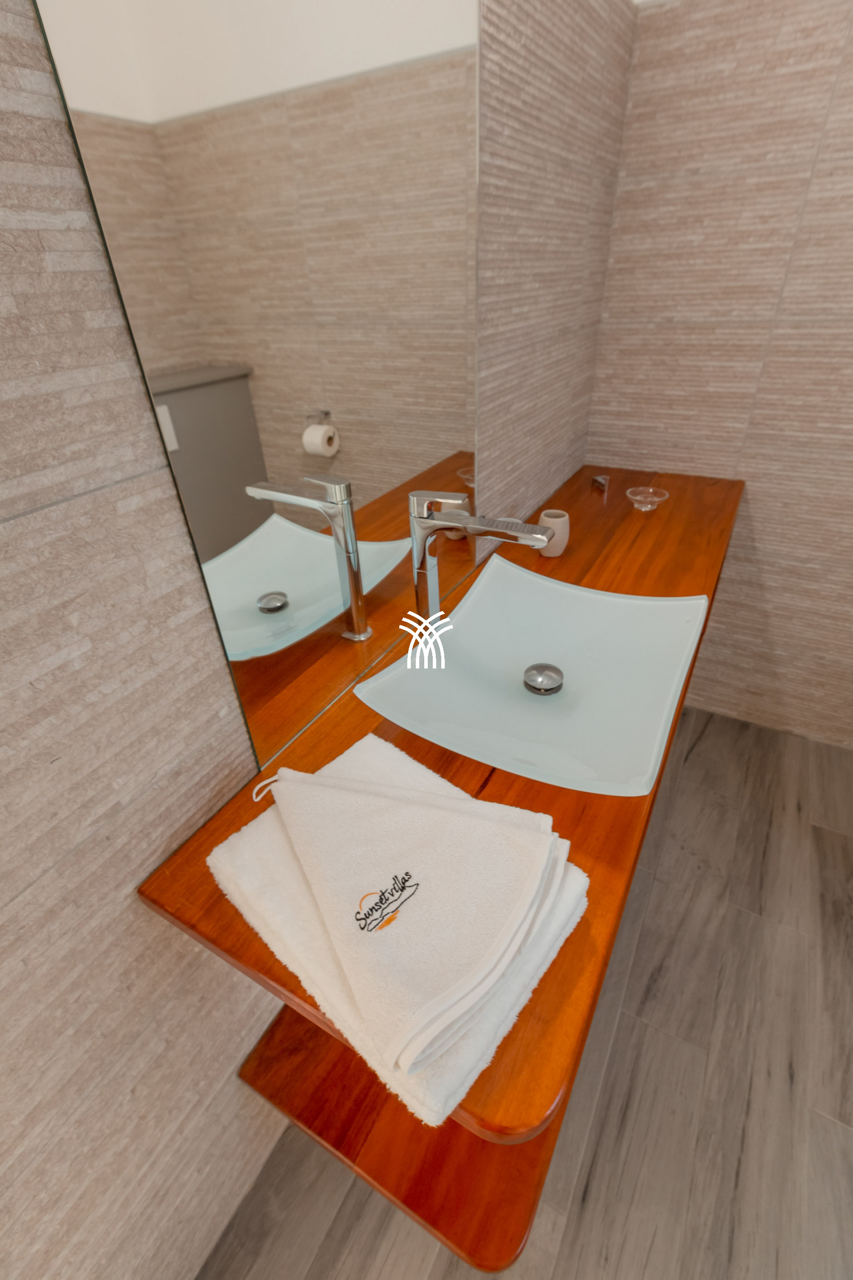 With its three air-conditioned suites, each equipped with its own private outdoor shower room, the Villa Sunset Palm guarantees a unique experience and optimal comfort. The main bedroom offers an unobstructed view of the sea, while the two others, facing east, benefit from a bright and soothing setting. All bedding is carefully chosen to ensure restful nights, and the outdoor shower rooms add an exotic touch to your stay.