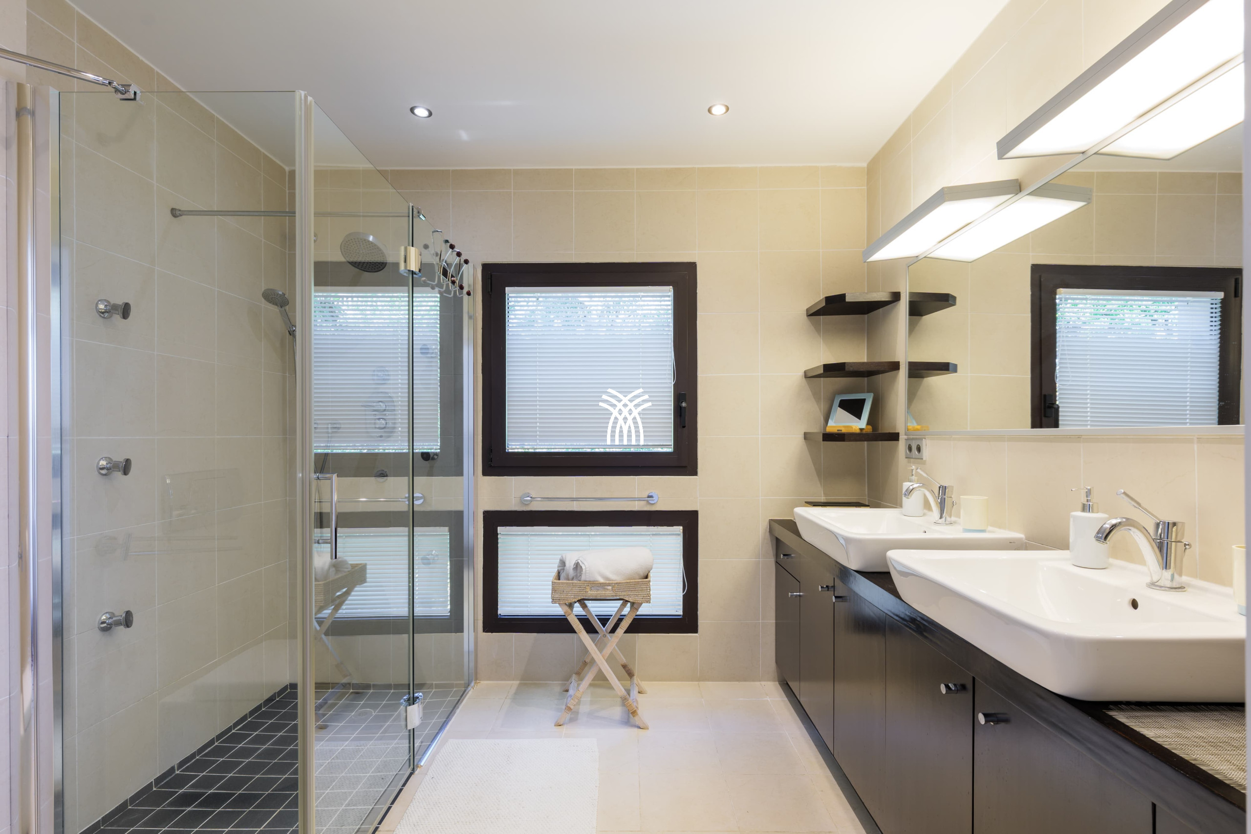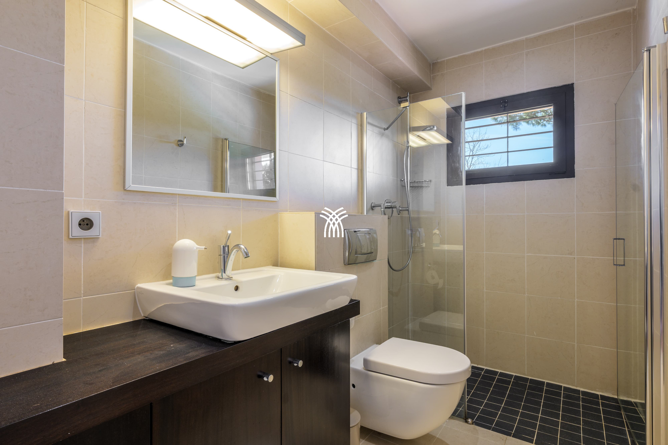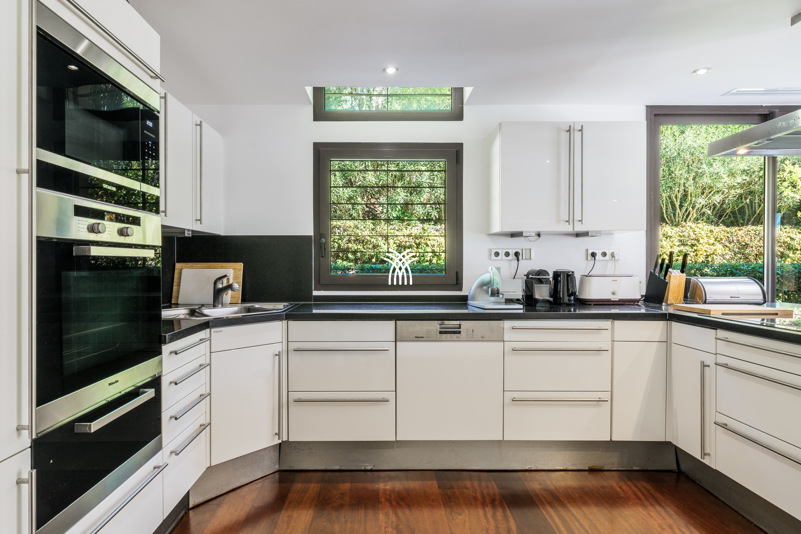 On the ground floor, a grand entrance leads to a spacious 45 m² living room with a fireplace, opening onto a terrace and a saltwater infinity pool. A fully equipped kitchen, fitted with state-of-the-art Miele appliances, spans 30 m² and is accompanied by an elegant 25 m² dining room, both opening to the outdoor areas. A wellness area with a sauna and shower completes this floor, making it perfect for unwinding after a sunny day. A versatile office space, which can be converted into a bedroom with a private bathroom, adds flexibility and convenience.