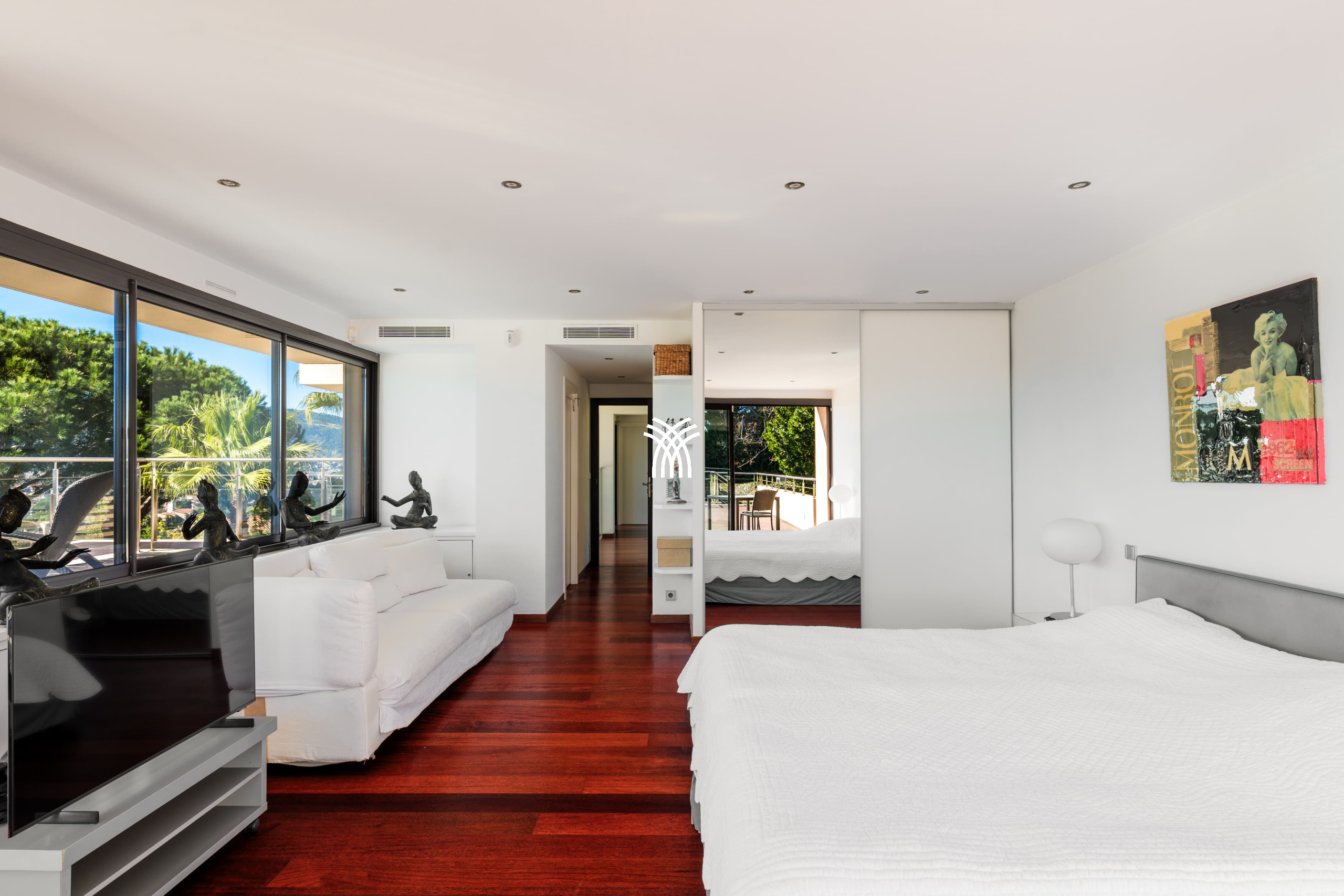 The upper floor reveals sumptuous bedrooms, including a 38 m² master suite with a luxurious bathroom and an expansive private terrace offering panoramic views of the sea and pool. Each bedroom is bathed in natural light through wide bay windows, and the wooden flooring adds warmth and elegance.