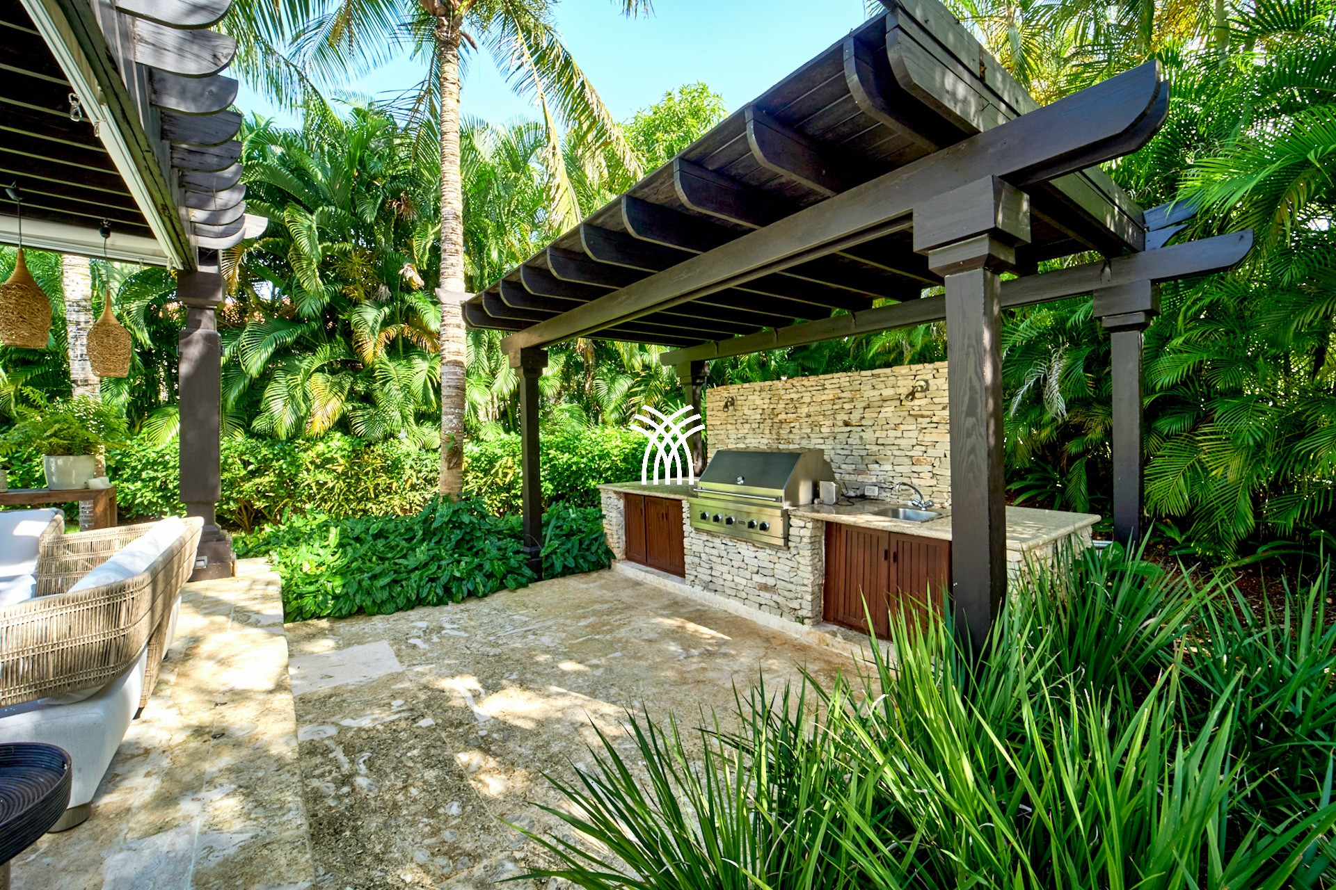 Outside, the villa reveals a lush garden punctuated with palm trees and tropical flowers, a private swimming pool to cool off at any time of the day, and a charming gazebo to enjoy a cocktail or an impromptu dinner. The outdoor barbecue extends these convivial moments until nightfall, under the starry Caribbean sky.