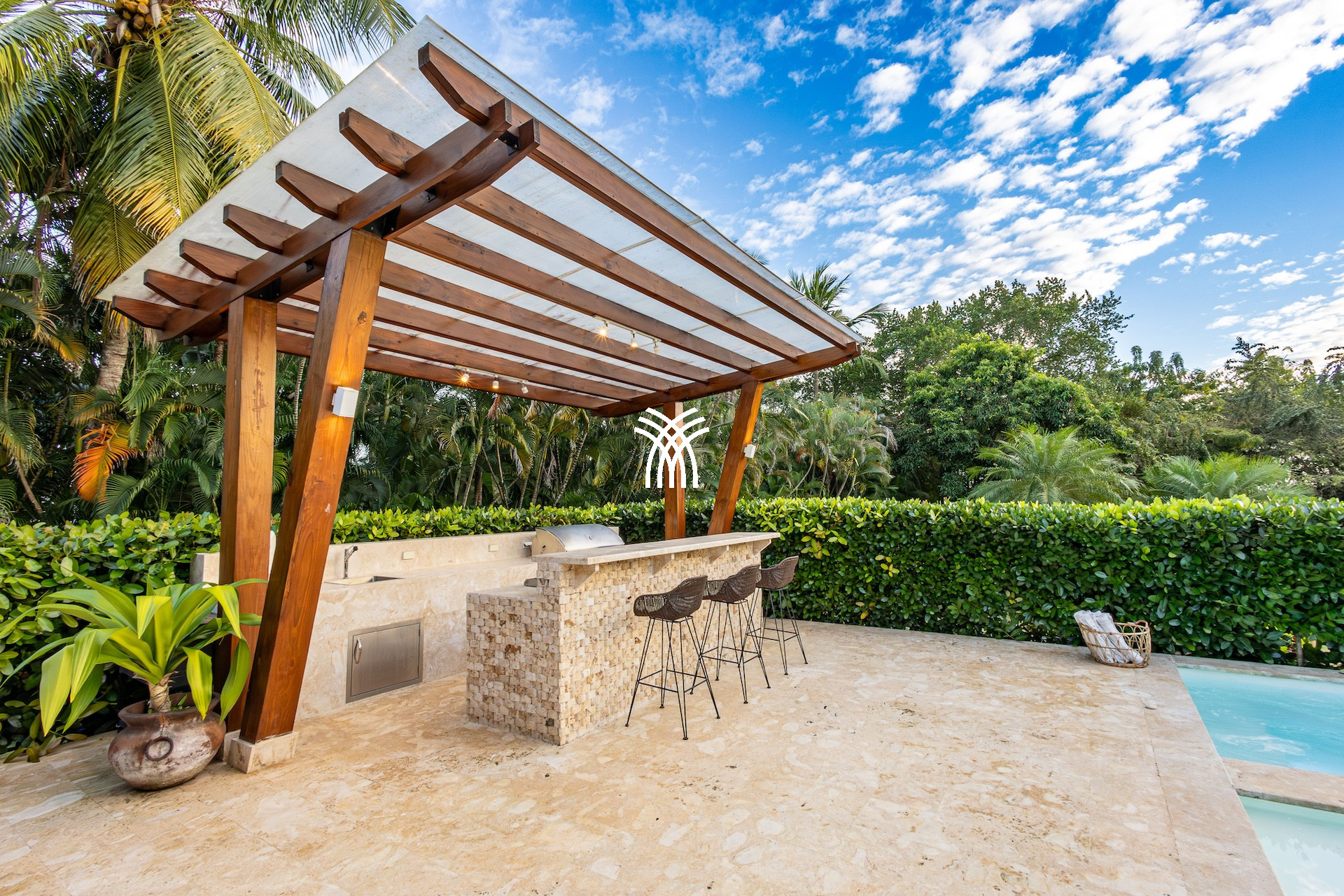 Outside, Casa Bliss reveals its chic retreat soul: an overflowing pool sparkles in the middle of a verdant garden, bordered by a covered terrace and an outdoor bar conducive to extended aperitifs. Here, each moment is savoured: a cocktail by the water, an al fresco dinner under the palm trees or a nap in the shade, lulled by the trade winds.