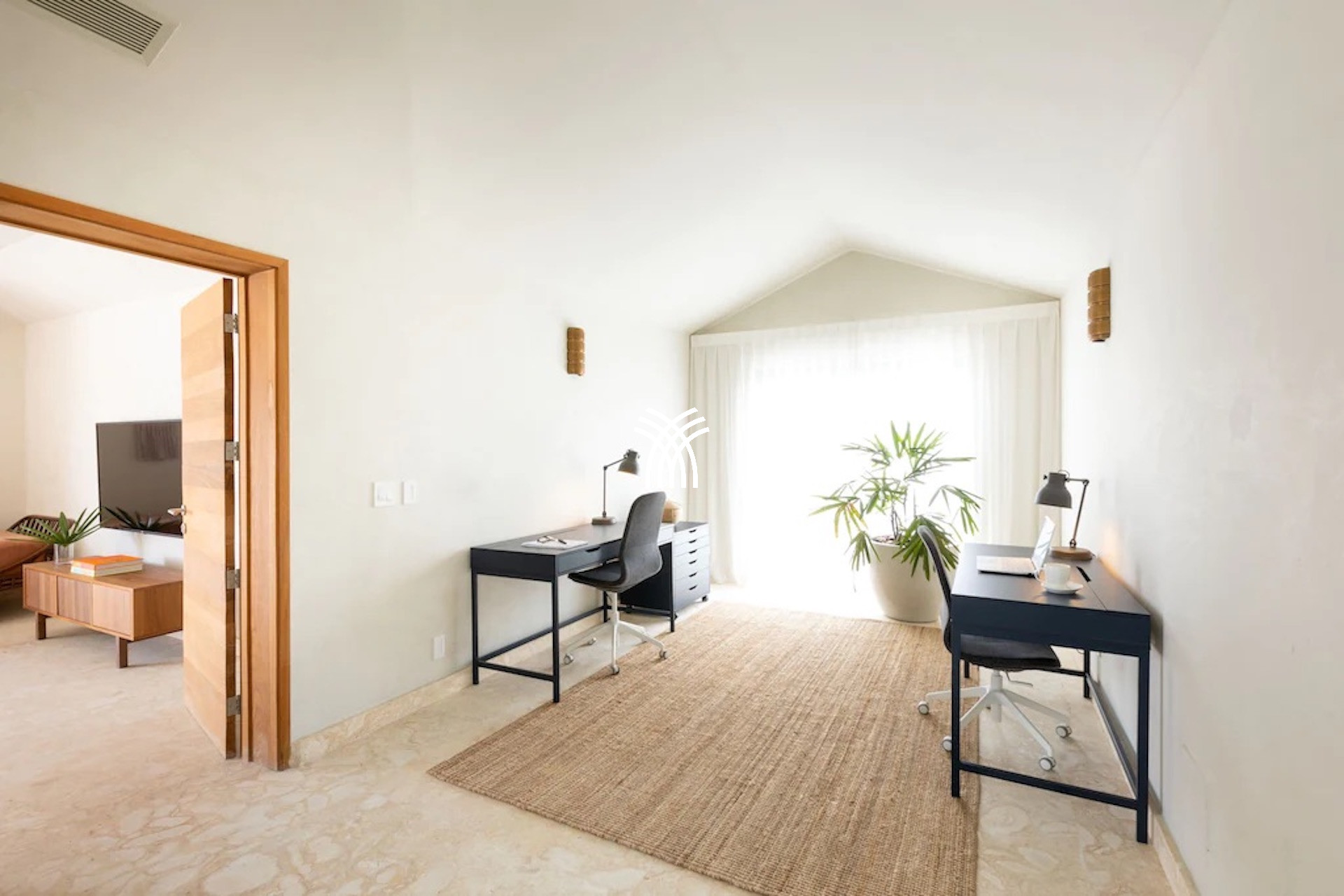 From the moment you arrive via the grand, tree-lined driveway, Casa Saman invites you into a world where serenity and sophistication coexist. The villa’s open, breezy design creates a seamless connection between indoor comfort and the vibrant outdoor setting. The spacious living room flows gracefully onto a sun-drenched patio, revealing panoramic views of the tropical gardens and the glistening swimming pool beyond—a perfect setting for quiet reflection or joyful moments with family and friends.