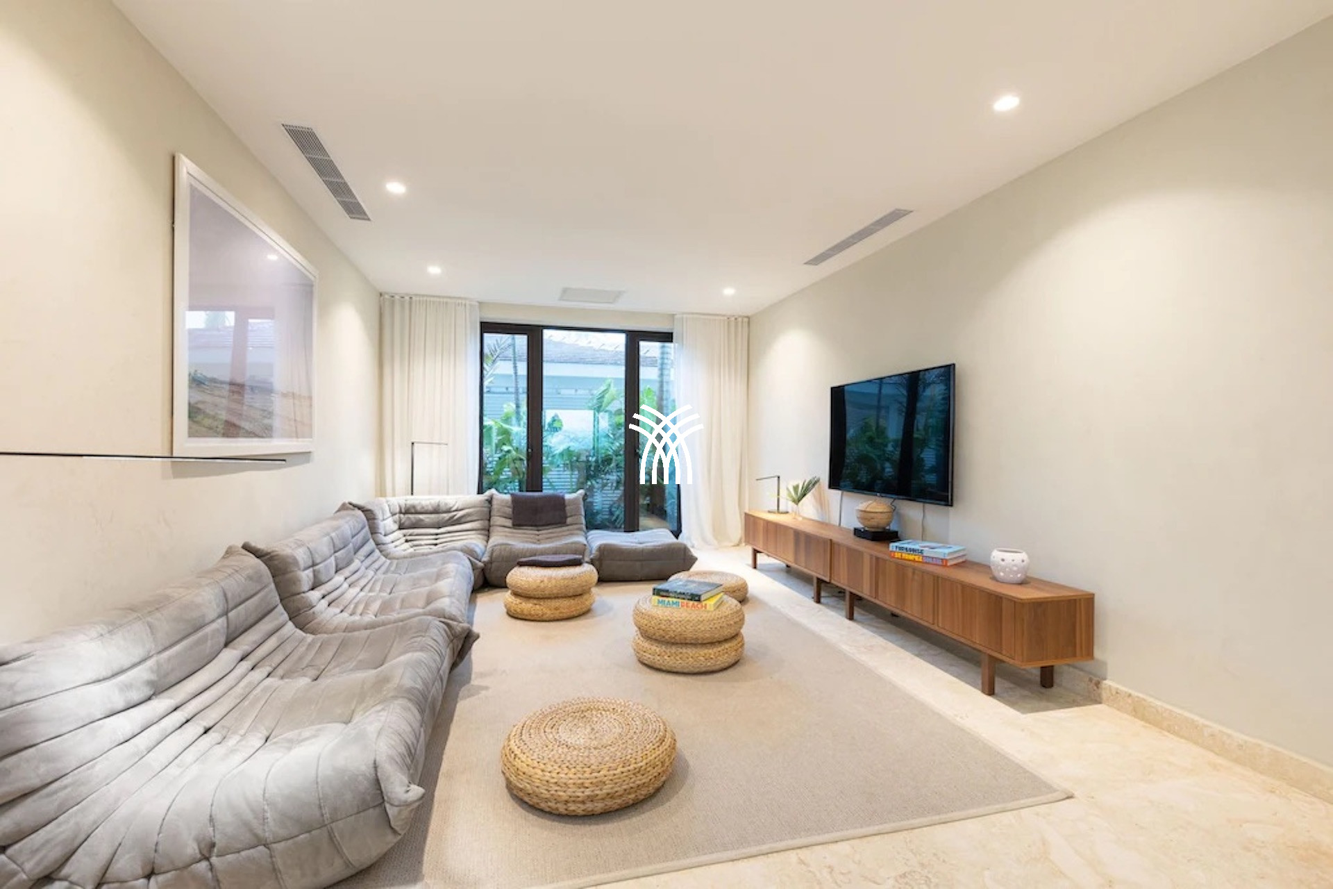 The villa’s interior exudes warmth and thoughtful luxury. A spacious living room flows into an air-conditioned media space, while the adjacent dining area, designed for ten, opens seamlessly onto a sun-kissed terrace. Here, an inviting pool is surrounded by lush tropical gardens, offering a secluded backdrop for relaxation and celebration alike. The fully equipped kitchen and outdoor gas barbecue elevate every dining experience, from casual meals to gourmet feasts under the stars.
