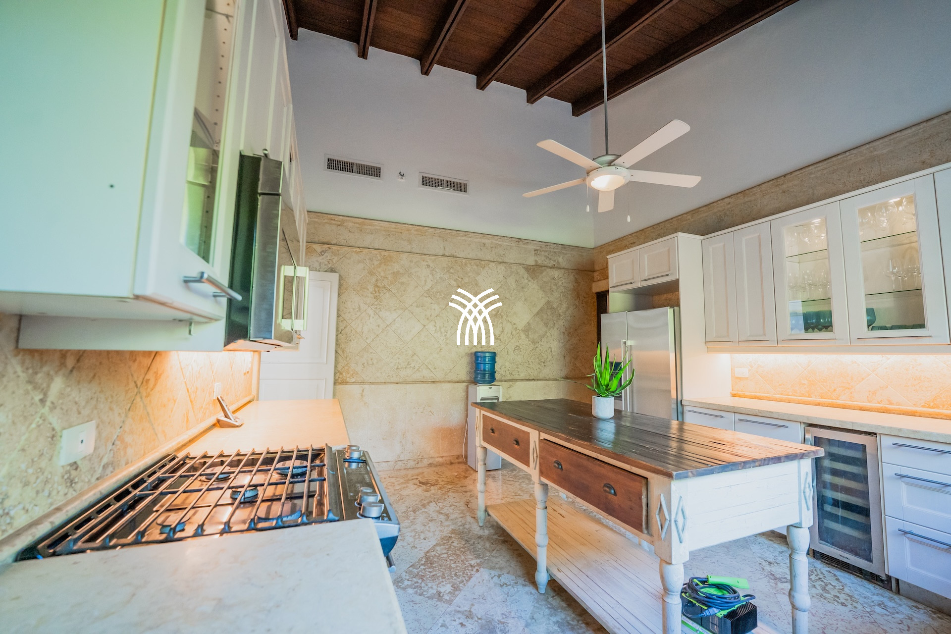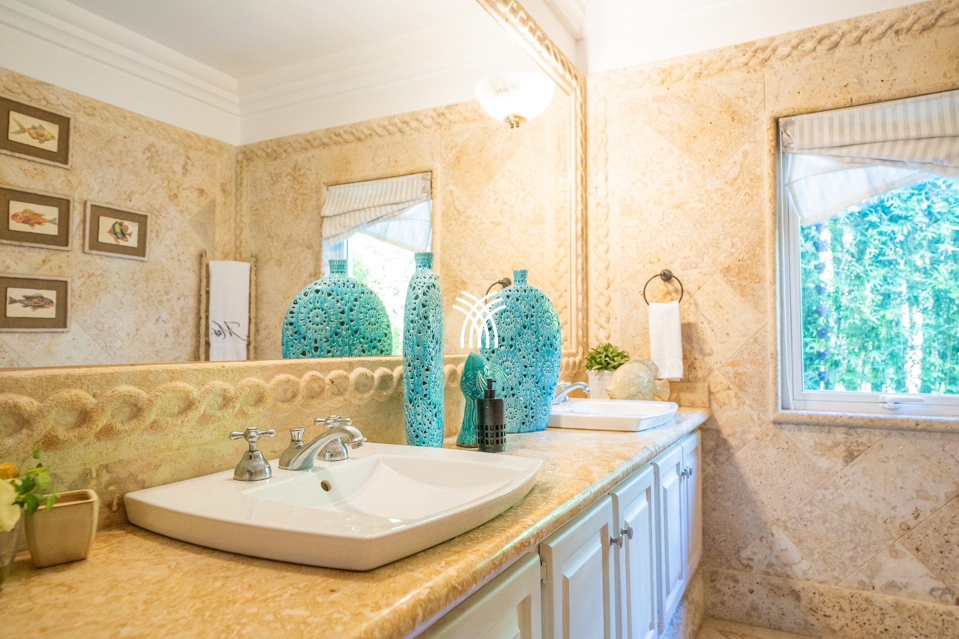 Five spacious air-conditioned bedrooms, each with its own private bathroom, ensure privacy and tranquility for every guest, with two of the suites opening directly onto the pool and outdoor living spaces for a seamless indoor-outdoor experience. The modern kitchen, finished with granite countertops and top-quality appliances, is perfectly equipped for preparing anything from casual breakfasts to celebratory dinners, while the formal dining room comfortably welcomes up to sixteen guests, making every shared meal a memorable occasion in this distinguished Caribbean sanctuary.