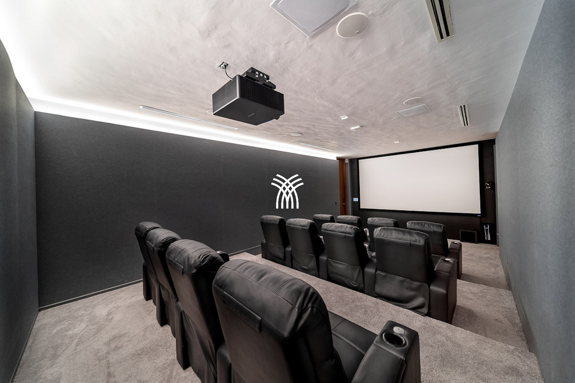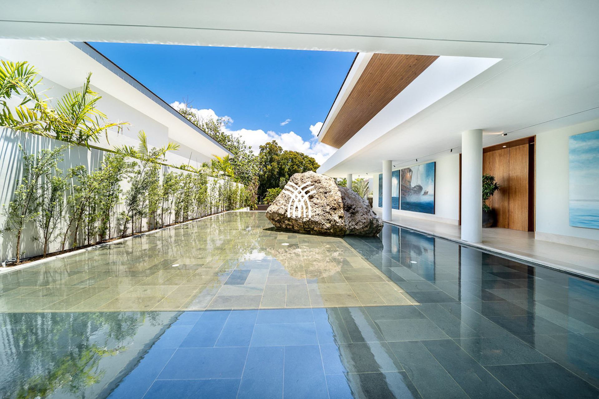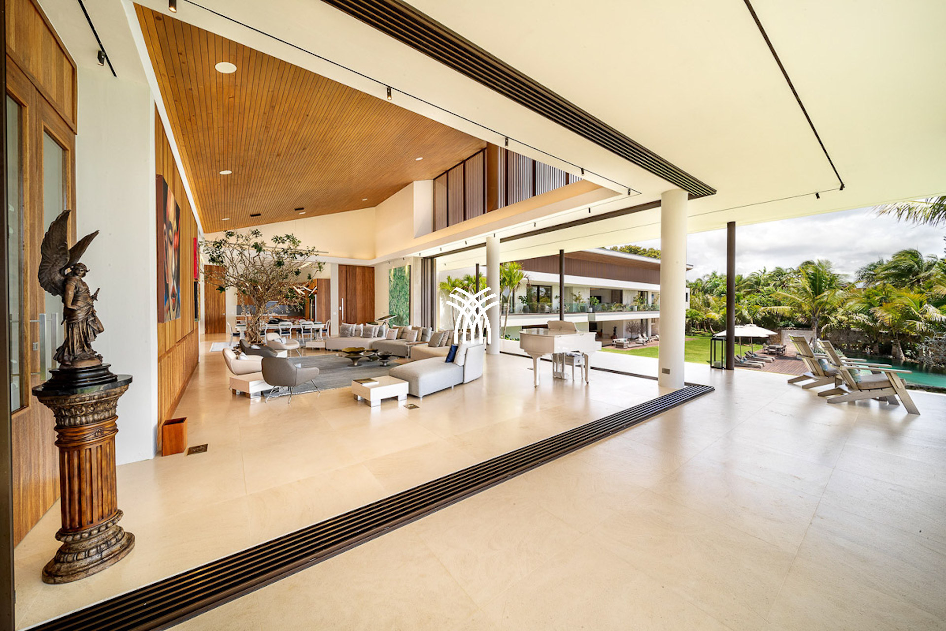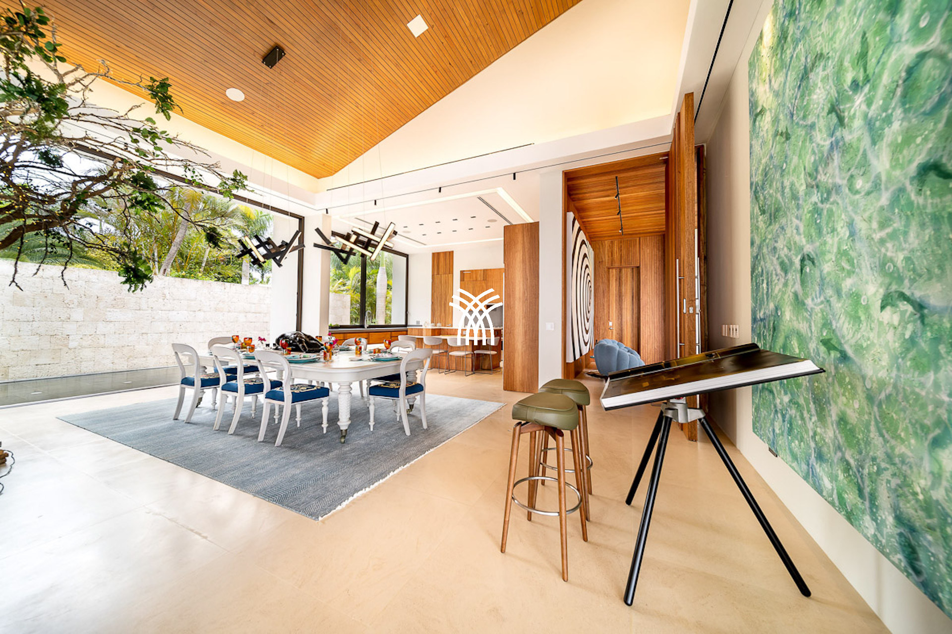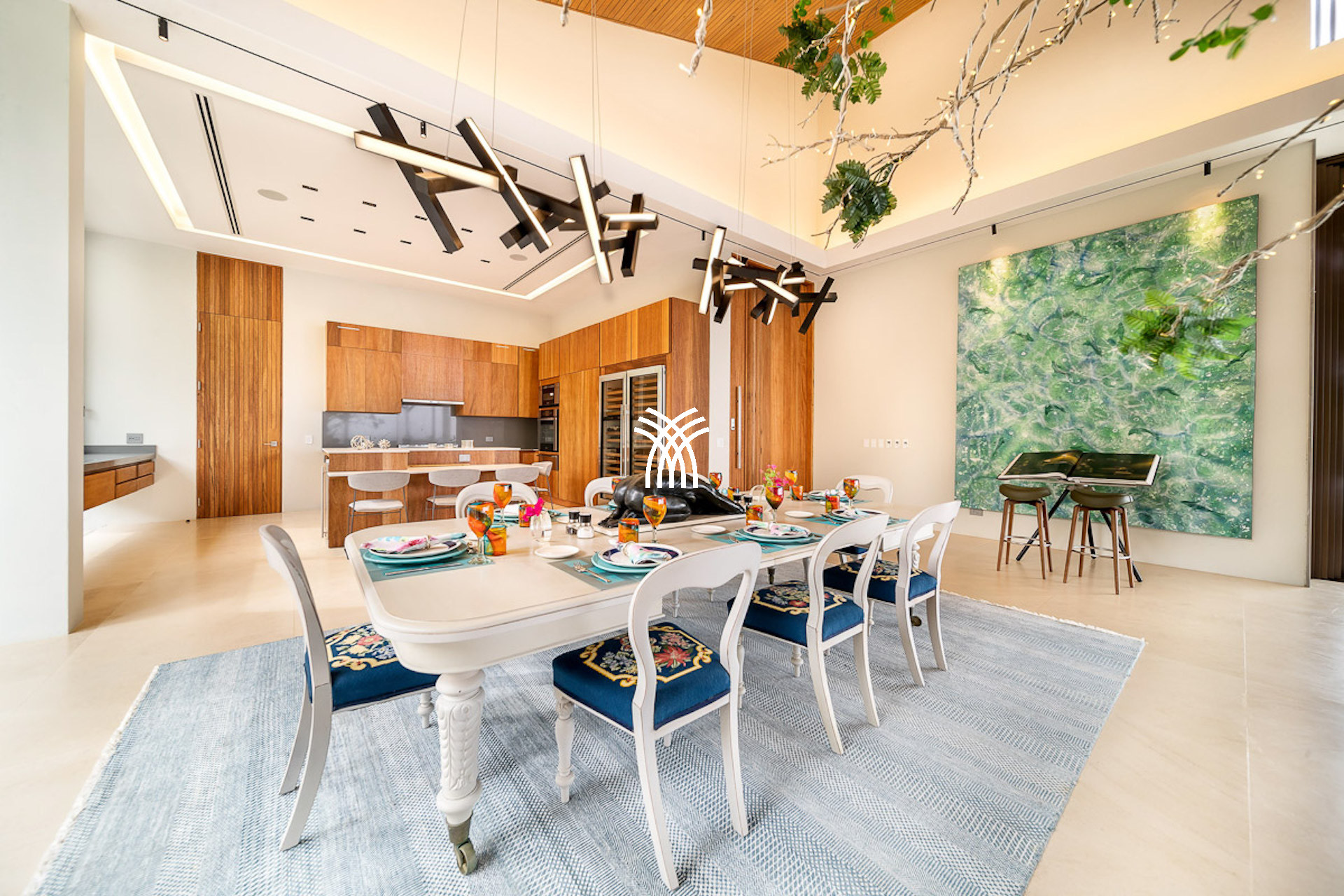 Inside, the villa continues to impress with its refined open-plan layout and richly appointed interiors. Vaulted ceilings, dark wood finishes, and curated contemporary art create a sense of warm sophistication. The estate is thoughtfully designed with two gourmet kitchens, a formal dining hall with bar and wine cooler, and luxurious amenities including a twelve-seat media room, a private gym, and a peaceful office space.