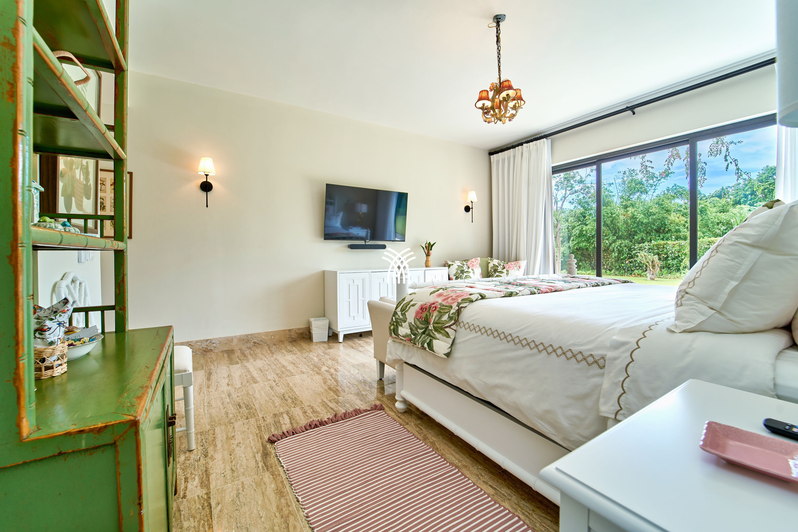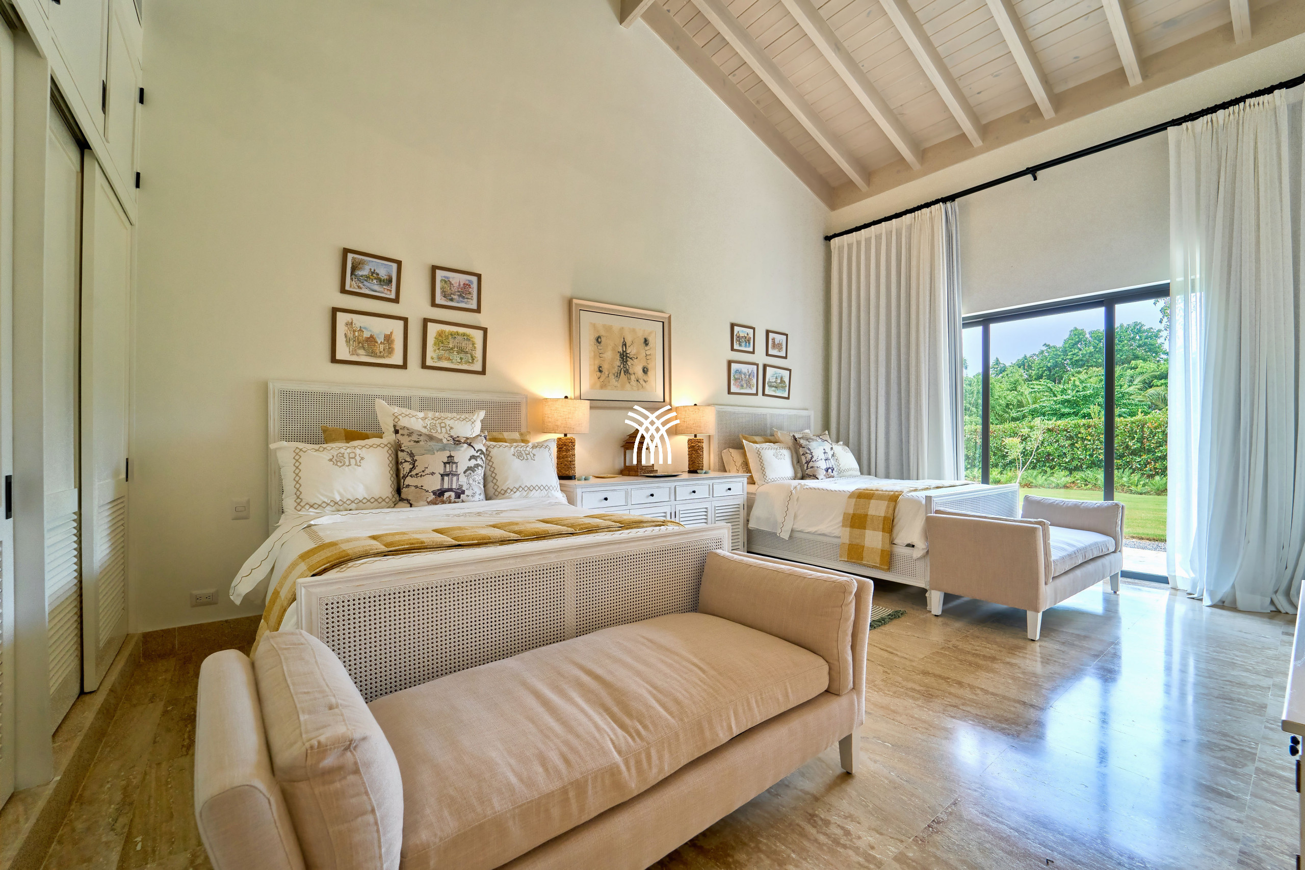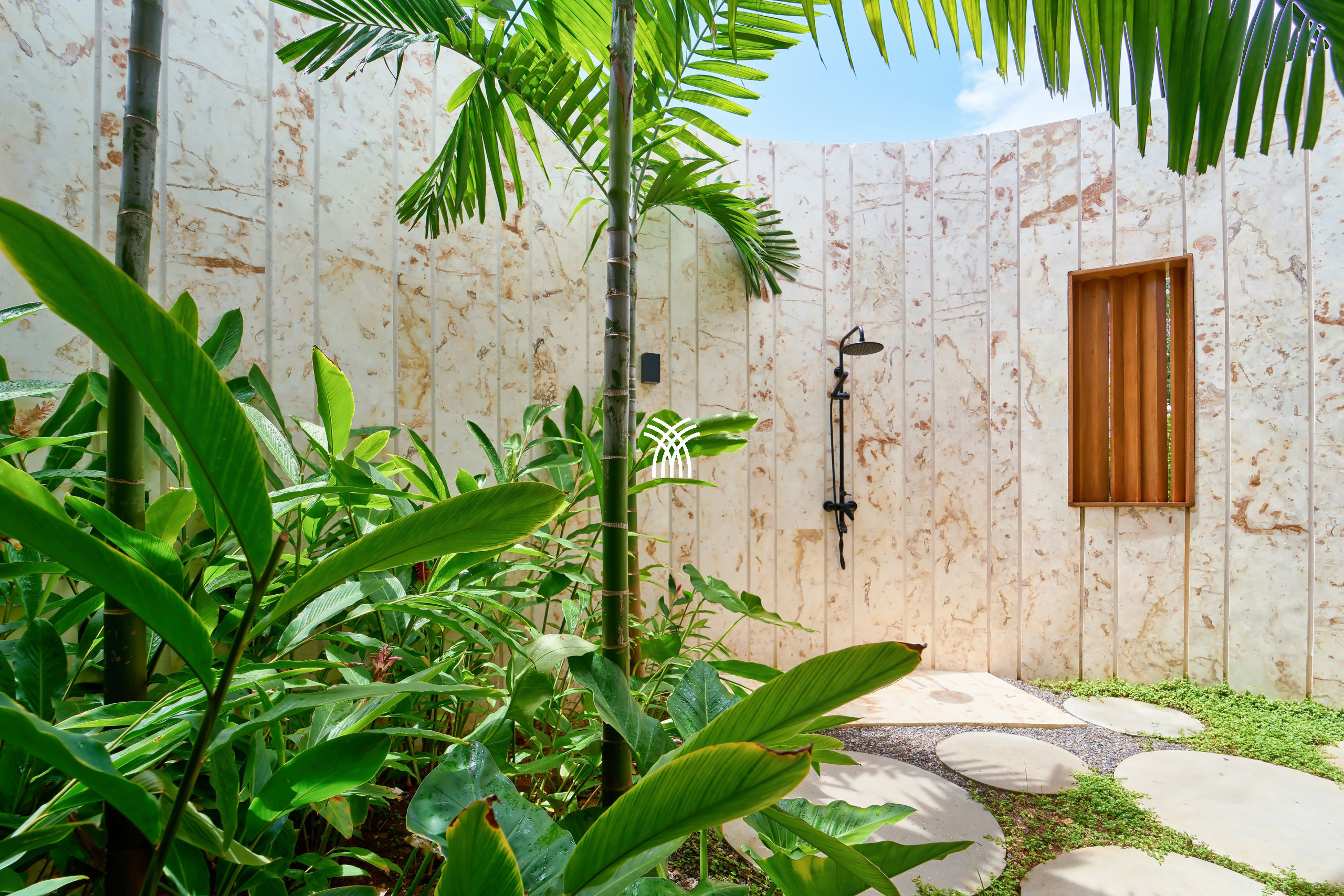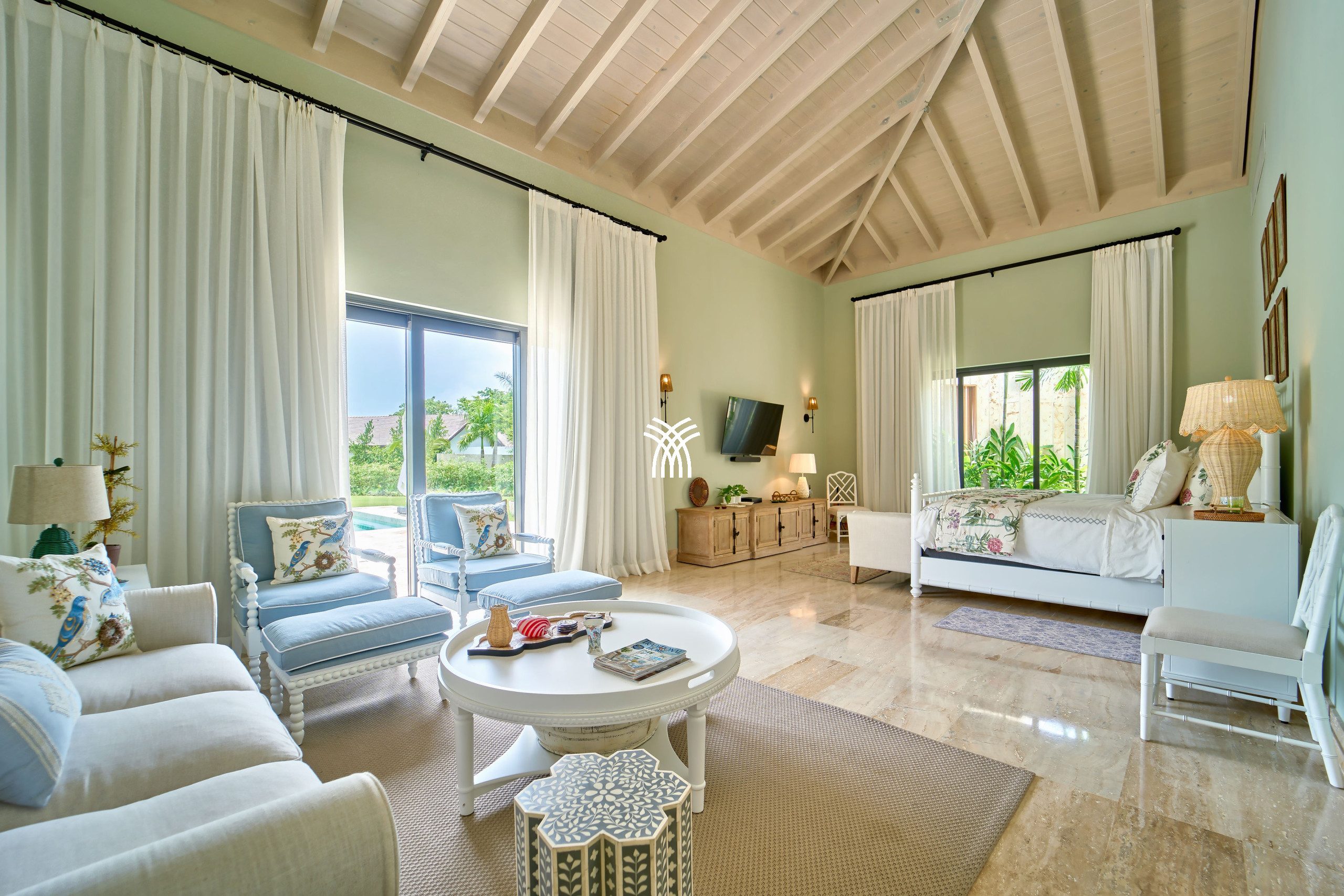 At the heart of Tropical Modern lie two expansive master suites, each a private sanctuary featuring open-concept baths and serene studio spaces. Perfectly designed for families or groups, the suites offer both intimacy and connection. A fifth bedroom opens directly to the verdant garden and poolside, ensuring an effortless blend of luxury and convenience.