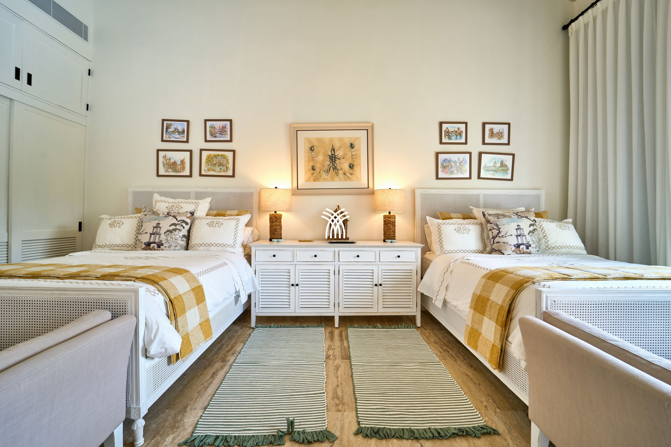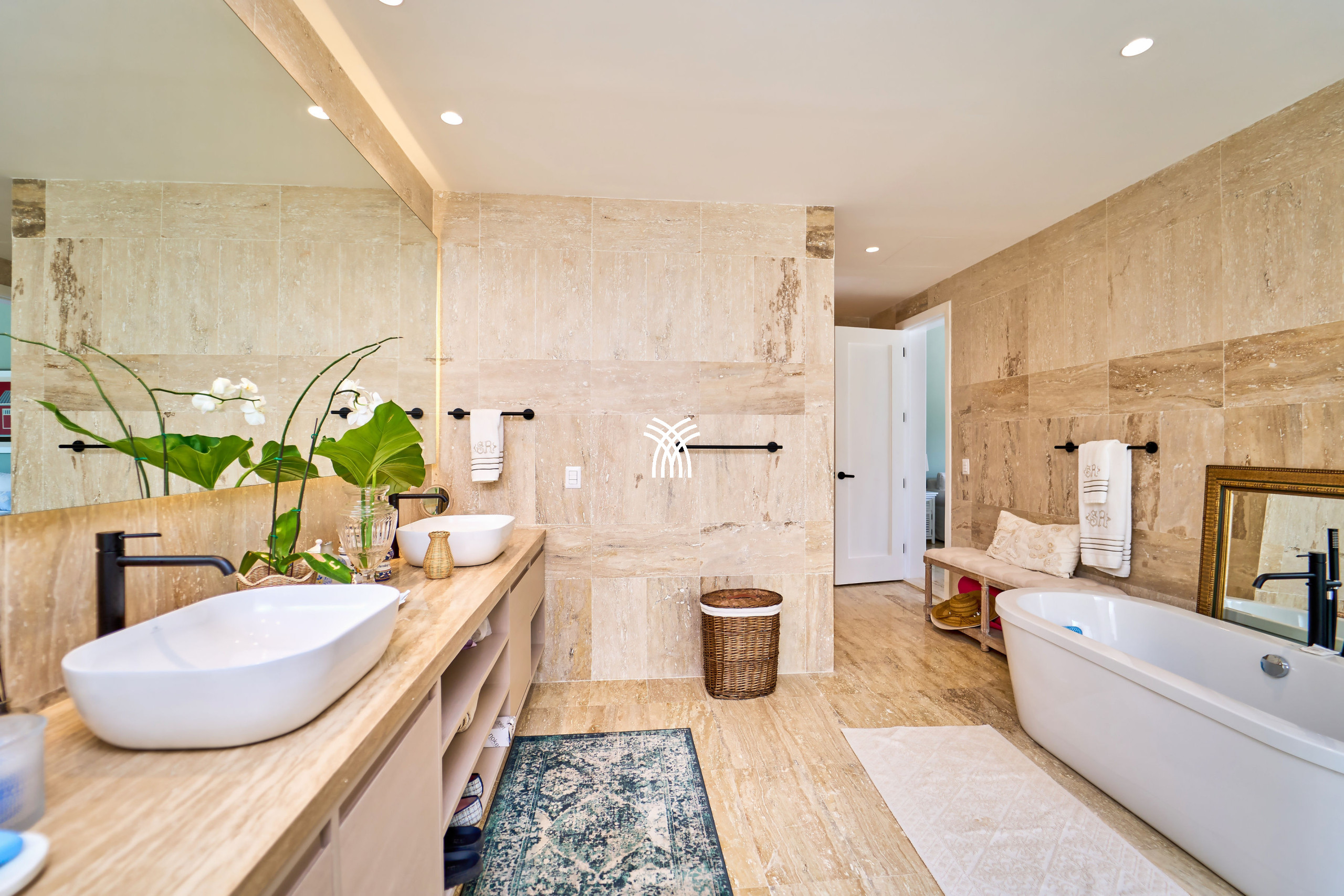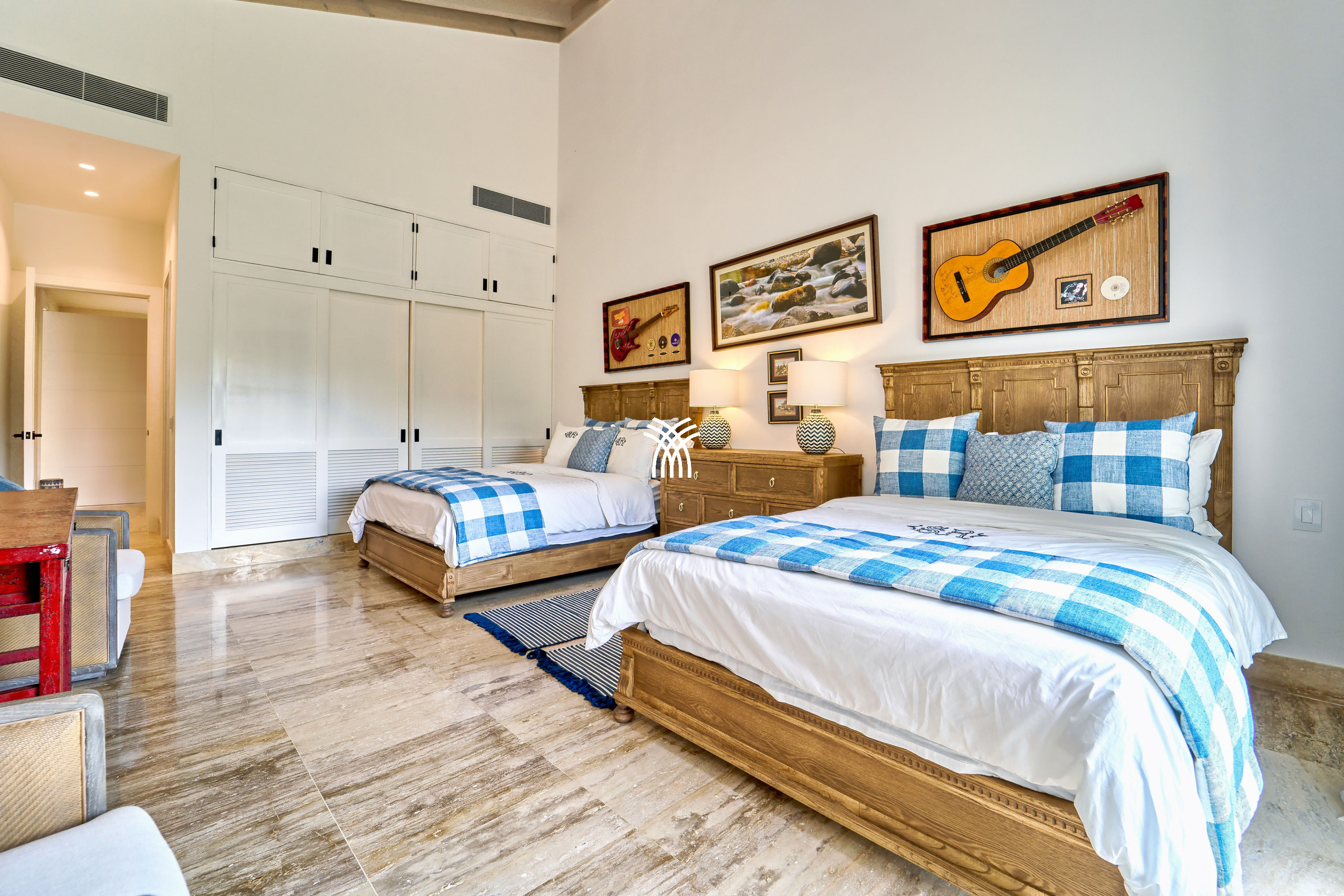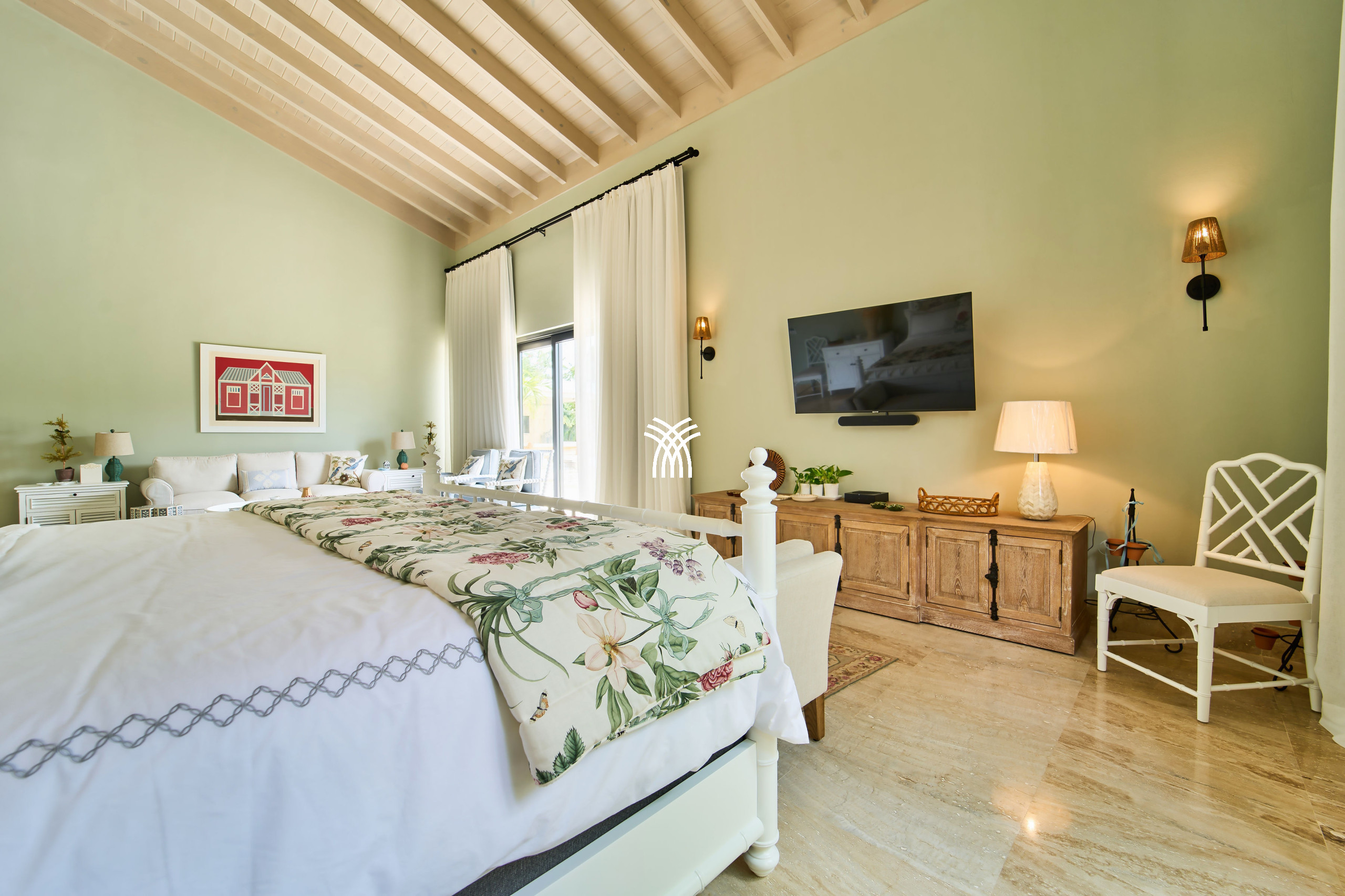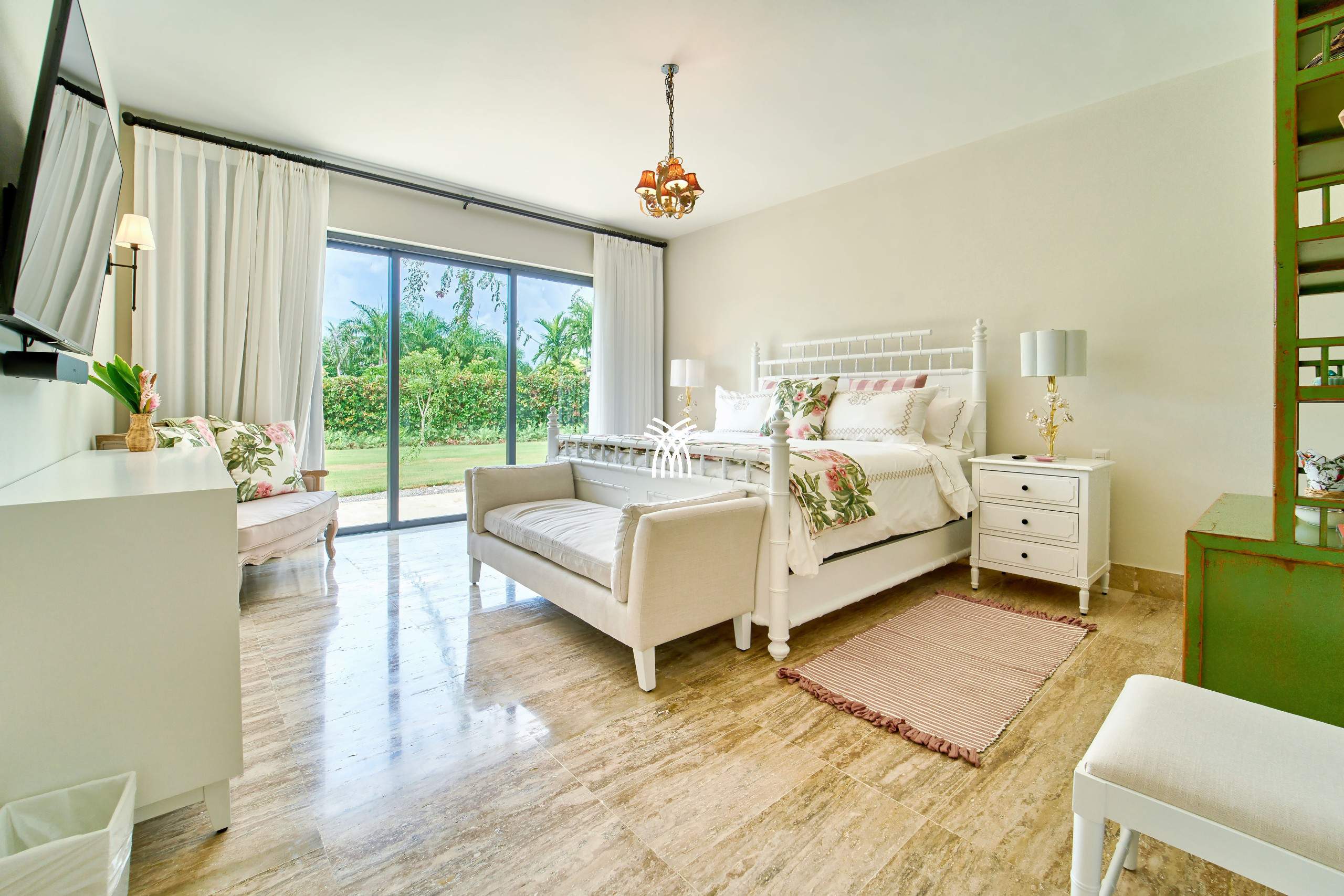 At the heart of Tropical Modern lie two expansive master suites, each a private sanctuary featuring open-concept baths and serene studio spaces. Perfectly designed for families or groups, the suites offer both intimacy and connection. A fifth bedroom opens directly to the verdant garden and poolside, ensuring an effortless blend of luxury and convenience.