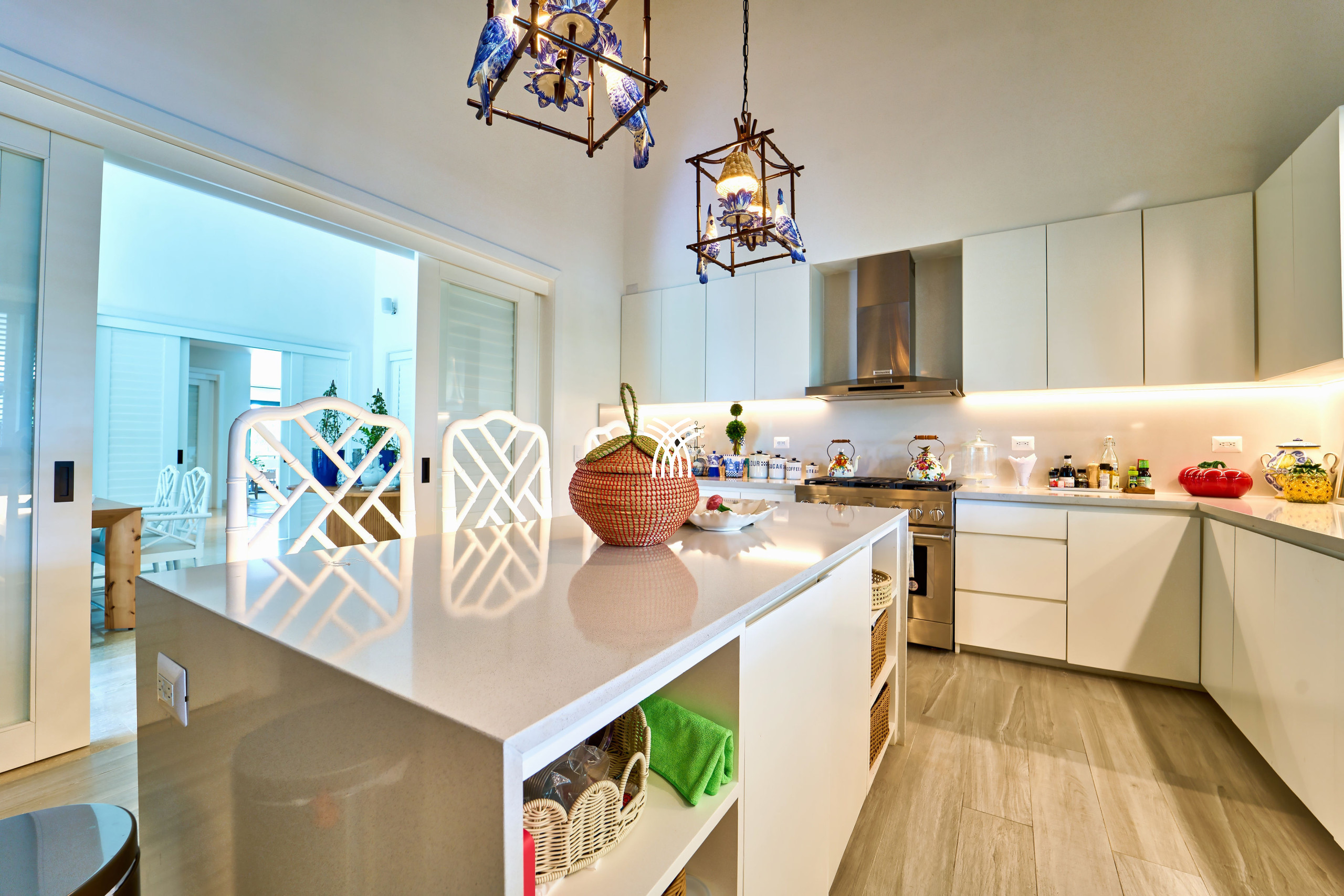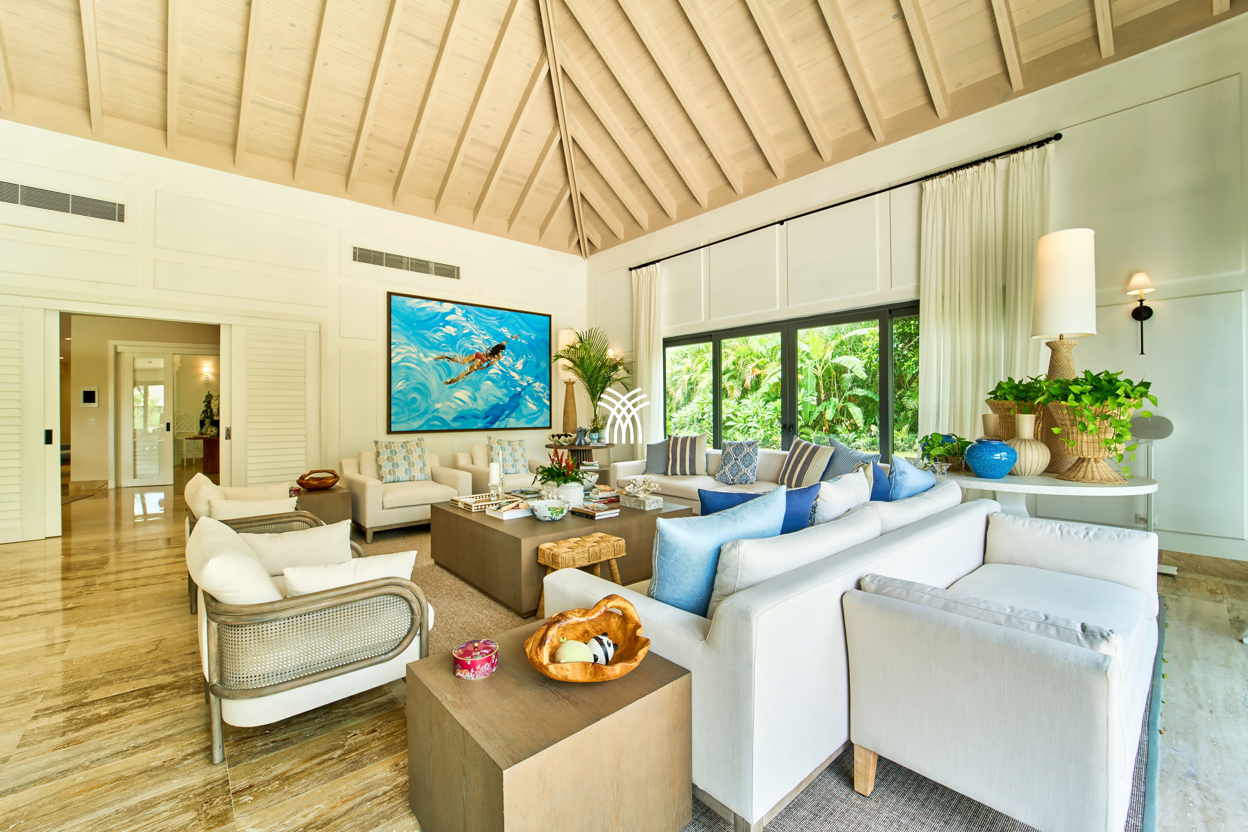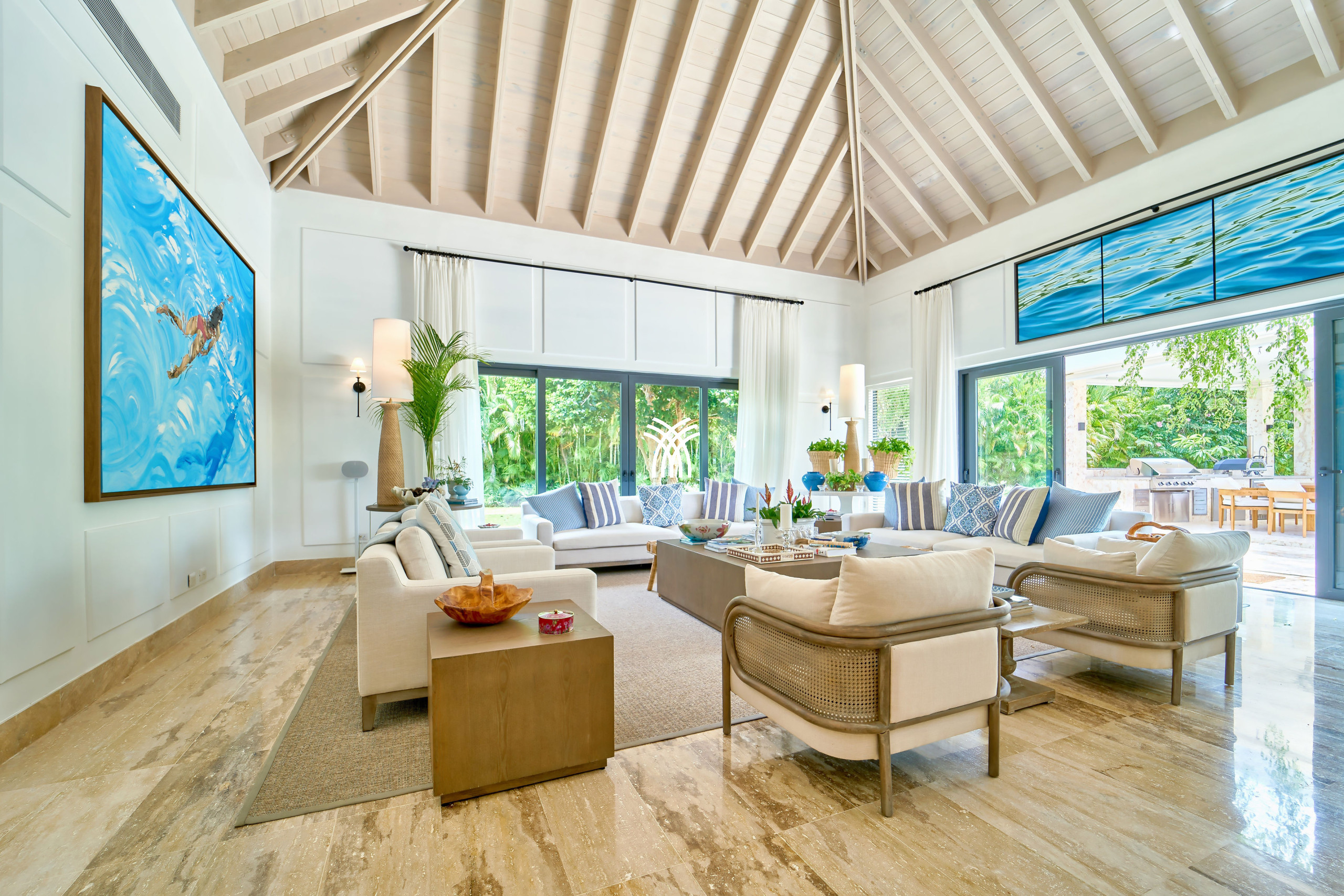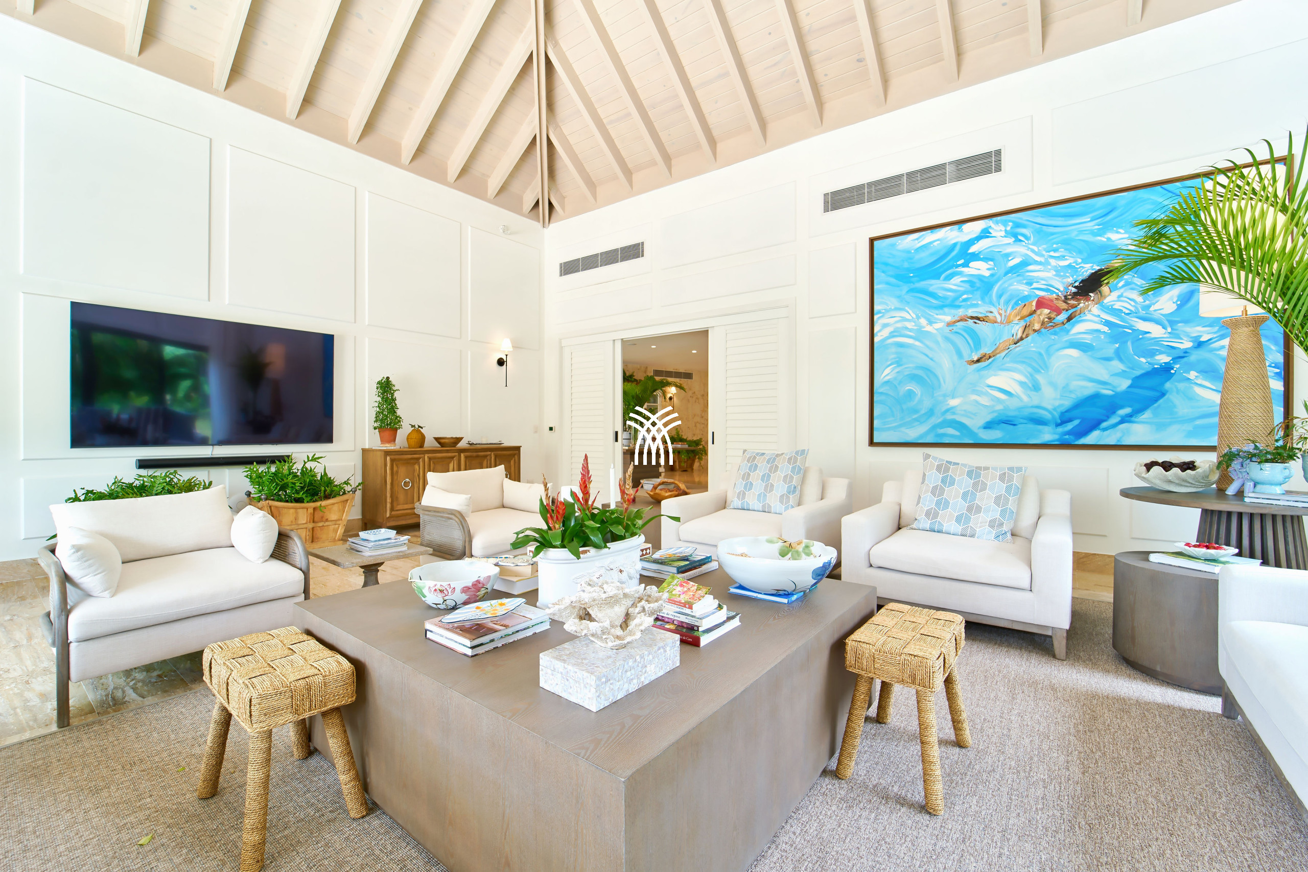 Bathed in natural light, the villa’s open-plan design creates a seamless harmony between interior and exterior living. Air-conditioned spaces, including the refined dining room and tranquil studio, offer a cool sanctuary from the Caribbean warmth, inviting you to relax in absolute comfort.