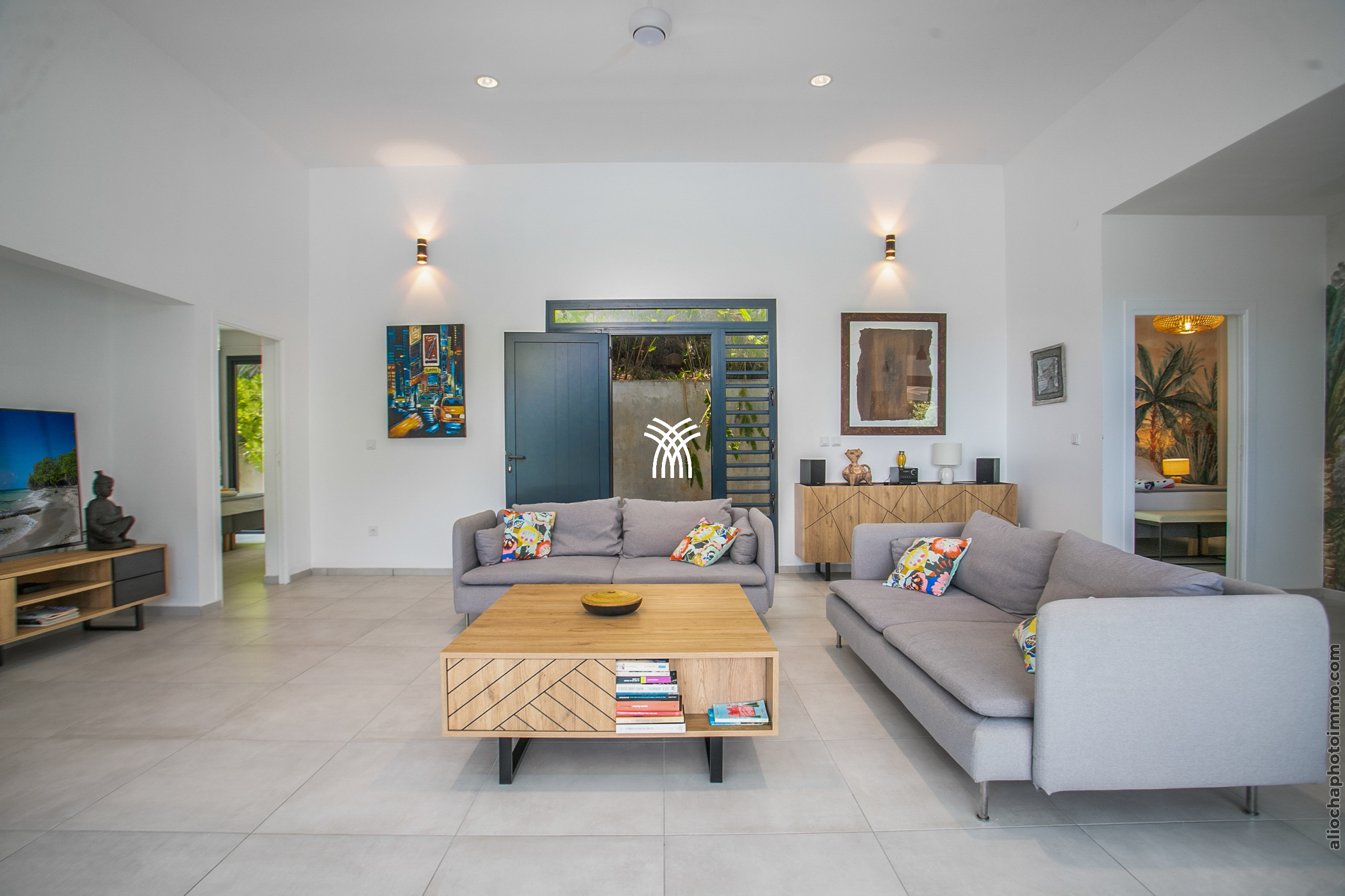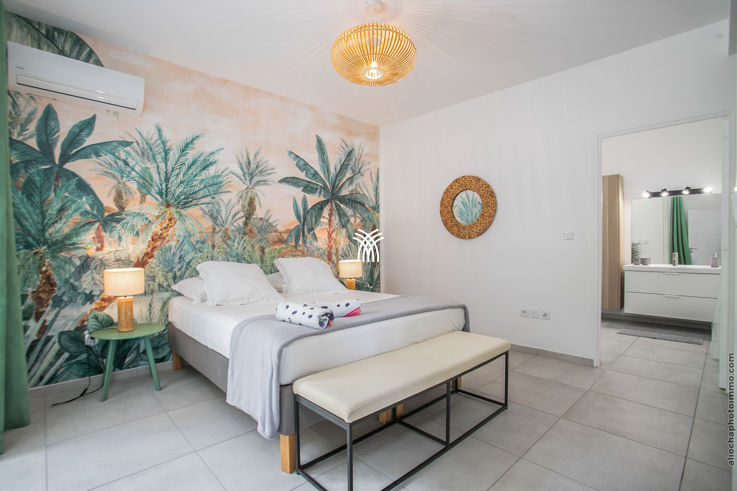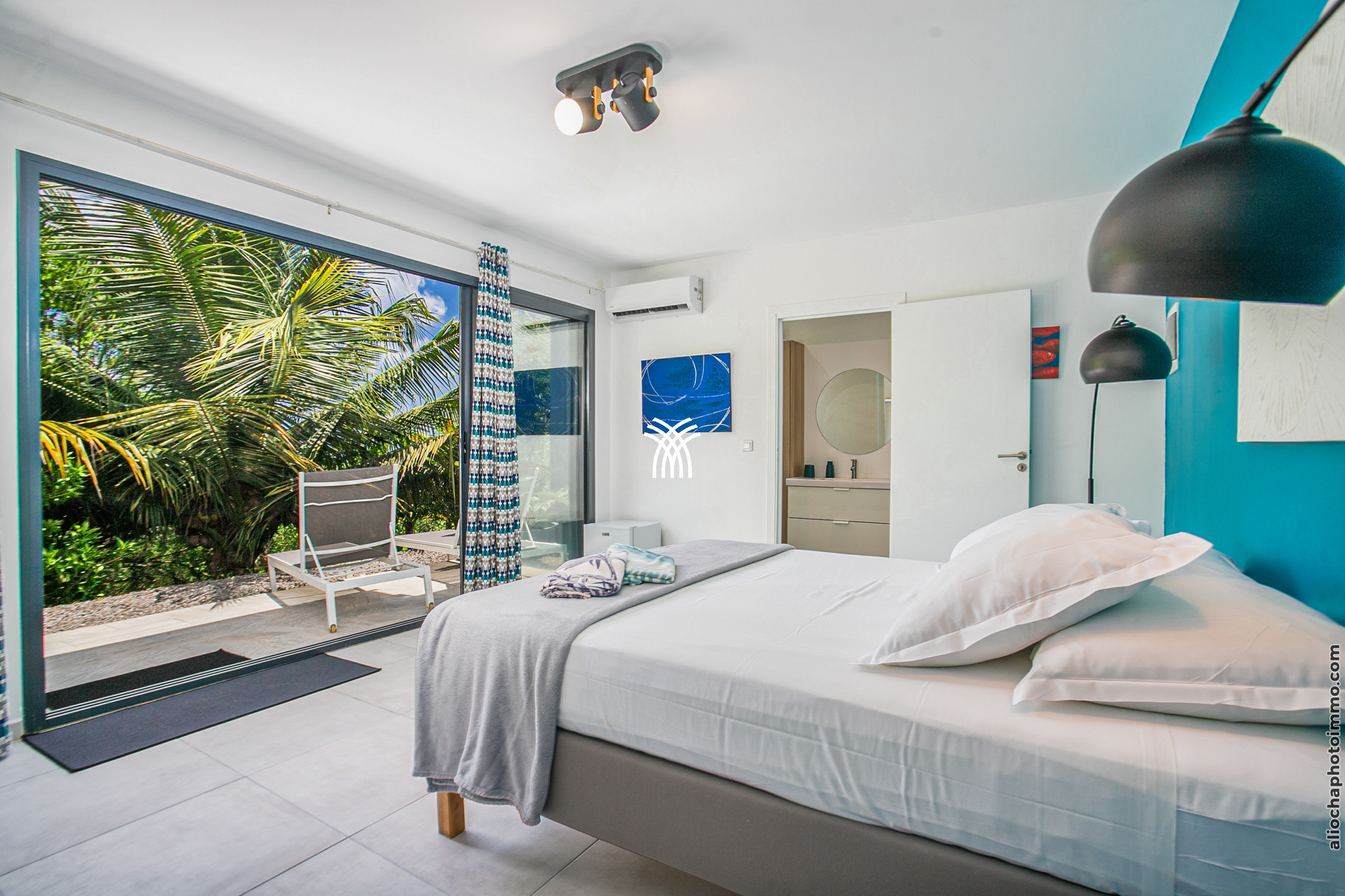 The Aqua villa, a true haven of serenity, offers a refined decor with tropical influences. The tiled roof, exposed beams, and light filtered through the slatted screens provide an authentic Creole charm. All spaces have been designed for comfort and well-being, in a bright and soothing atmosphere.