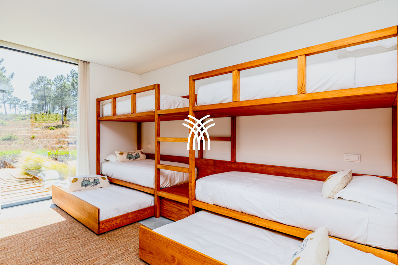 Outdoor spaces extend the villa’s sense of freedom and harmony with nature, offering generous terraces for al fresco dining, a swimming pool for leisurely afternoons, and vast lawns ideal for both quiet contemplation and family activities. Within the estate, guests can enjoy a children’s playground, a football field, and a volleyball area, while gentle walks through the meadow reveal the raw beauty of the Comporta landscape.