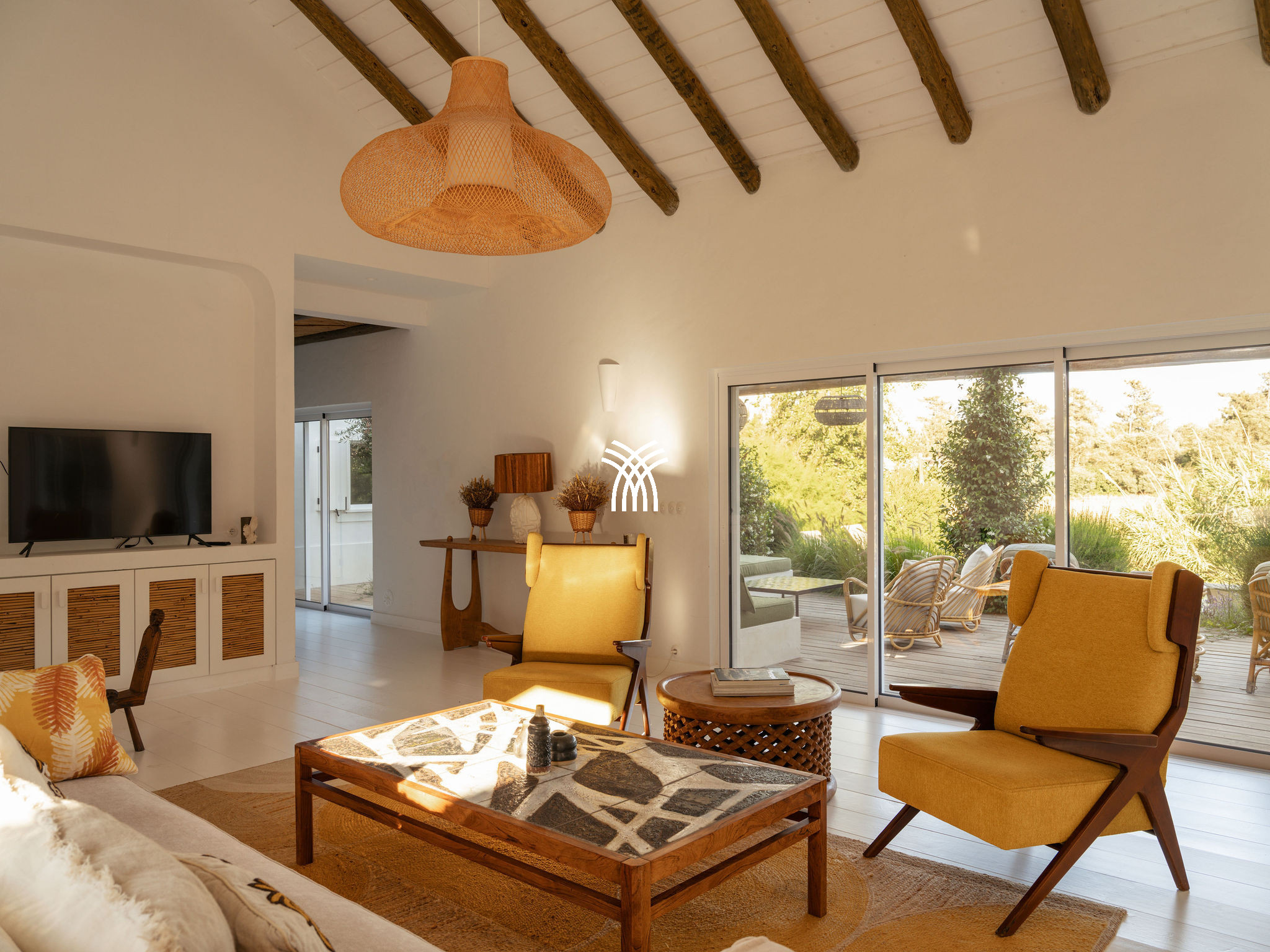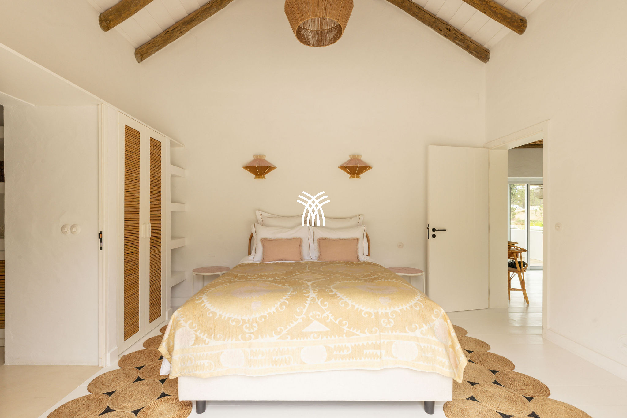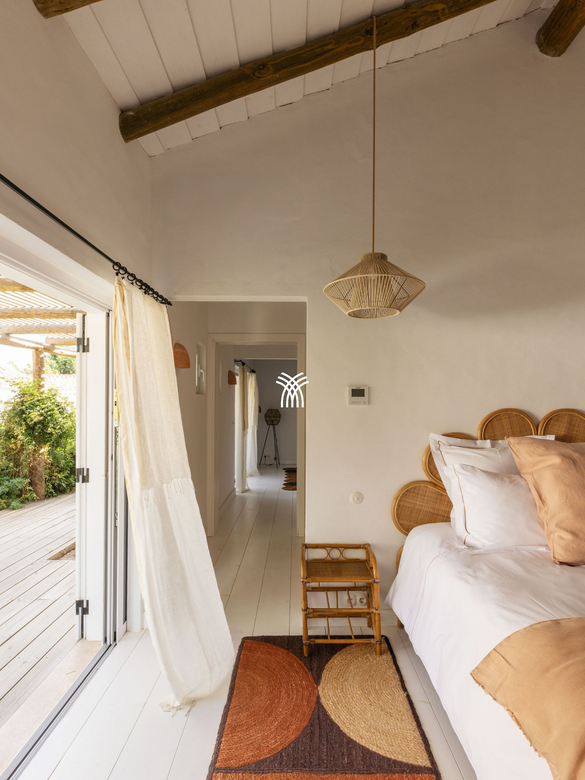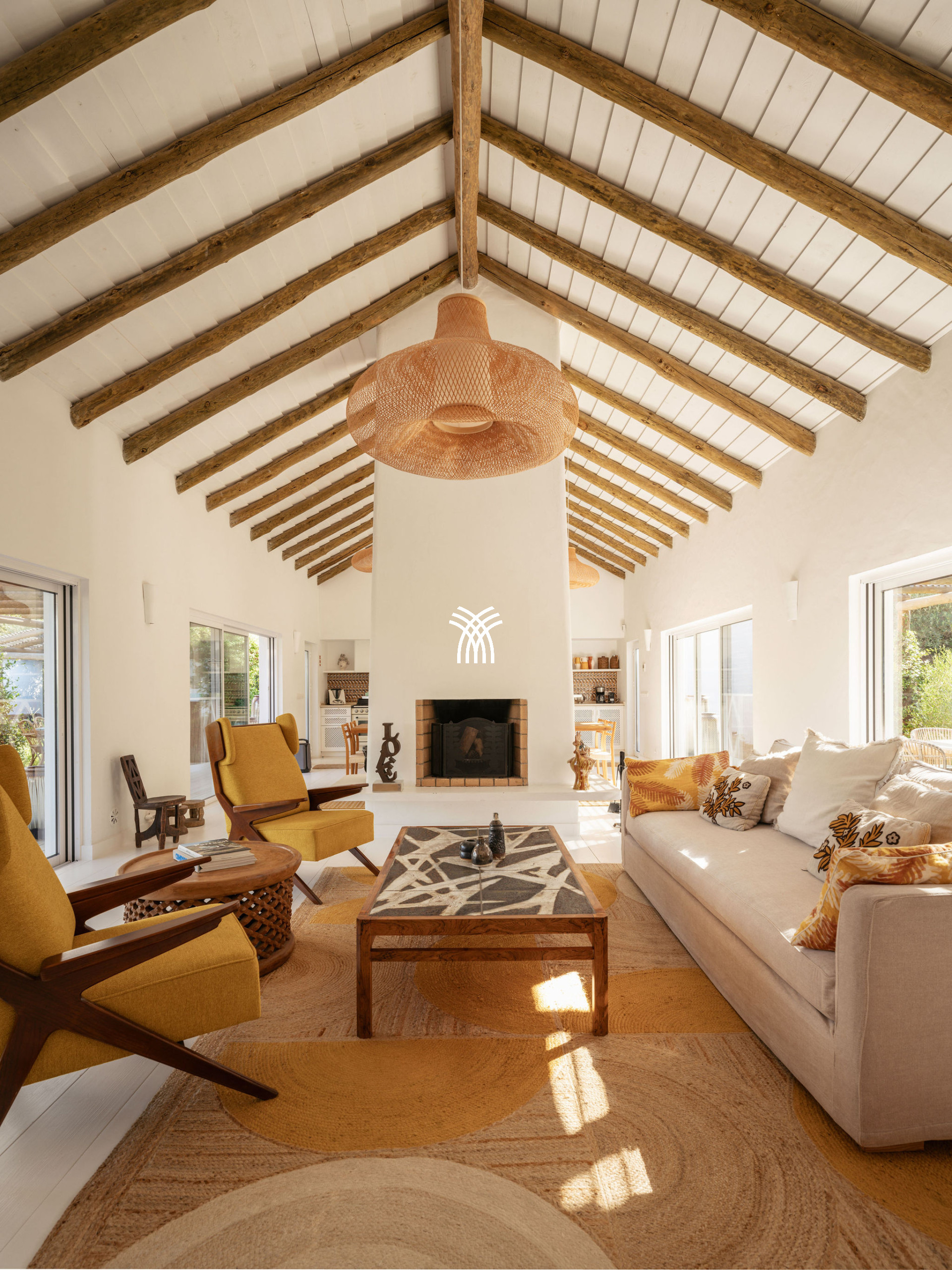 Immersed in the lush natural landscape of Comporta, Villa Katsu is an architect-designed retreat that embodies contemporary elegance and refined simplicity, where clean lines, wooden shutters, and harmonious proportions blend seamlessly with the surrounding environment. Bathed in natural light, the interiors unfold through expansive windows that invite the outdoors inside, illuminating crisp white walls, soaring ceilings, and warm parquet floors, while carefully curated artworks and subtle decorative accents bring vibrancy and personality to the serene aesthetic, creating an atmosphere that defines the essence of a luxury villa rental Portugal and an authentic luxury villa rental Comporta.