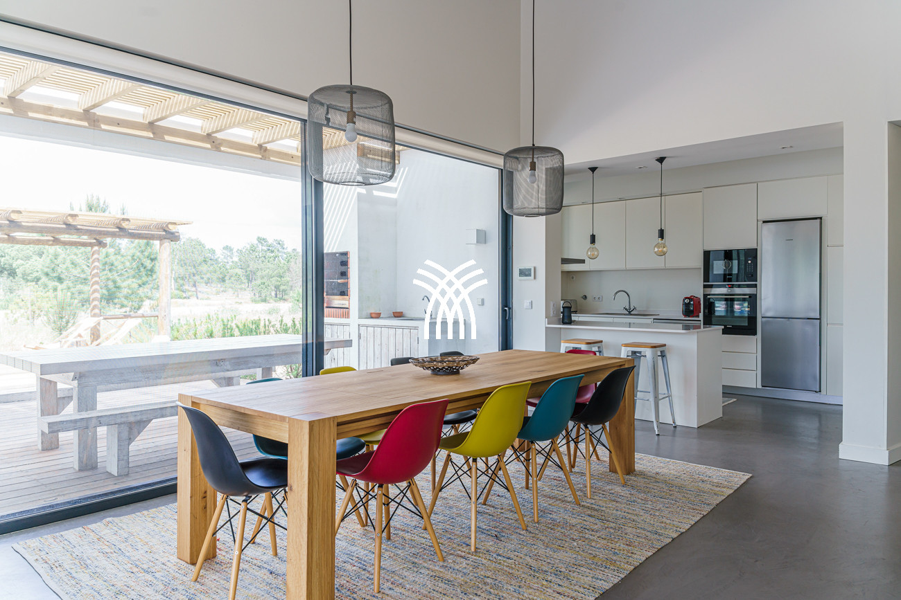 Barefoot mornings unfold across cool concrete floors, while subtle touches of vibrant color introduce warmth and artistic expression throughout the interiors. The spacious living and dining area flows effortlessly into a fully equipped open kitchen, forming a central space designed for connection, relaxation, and shared moments. From the living room, uninterrupted views extend across the garden and swimming pool toward the pine forest beyond, immersing guests in the tranquil rhythm of Comporta’s natural environment.