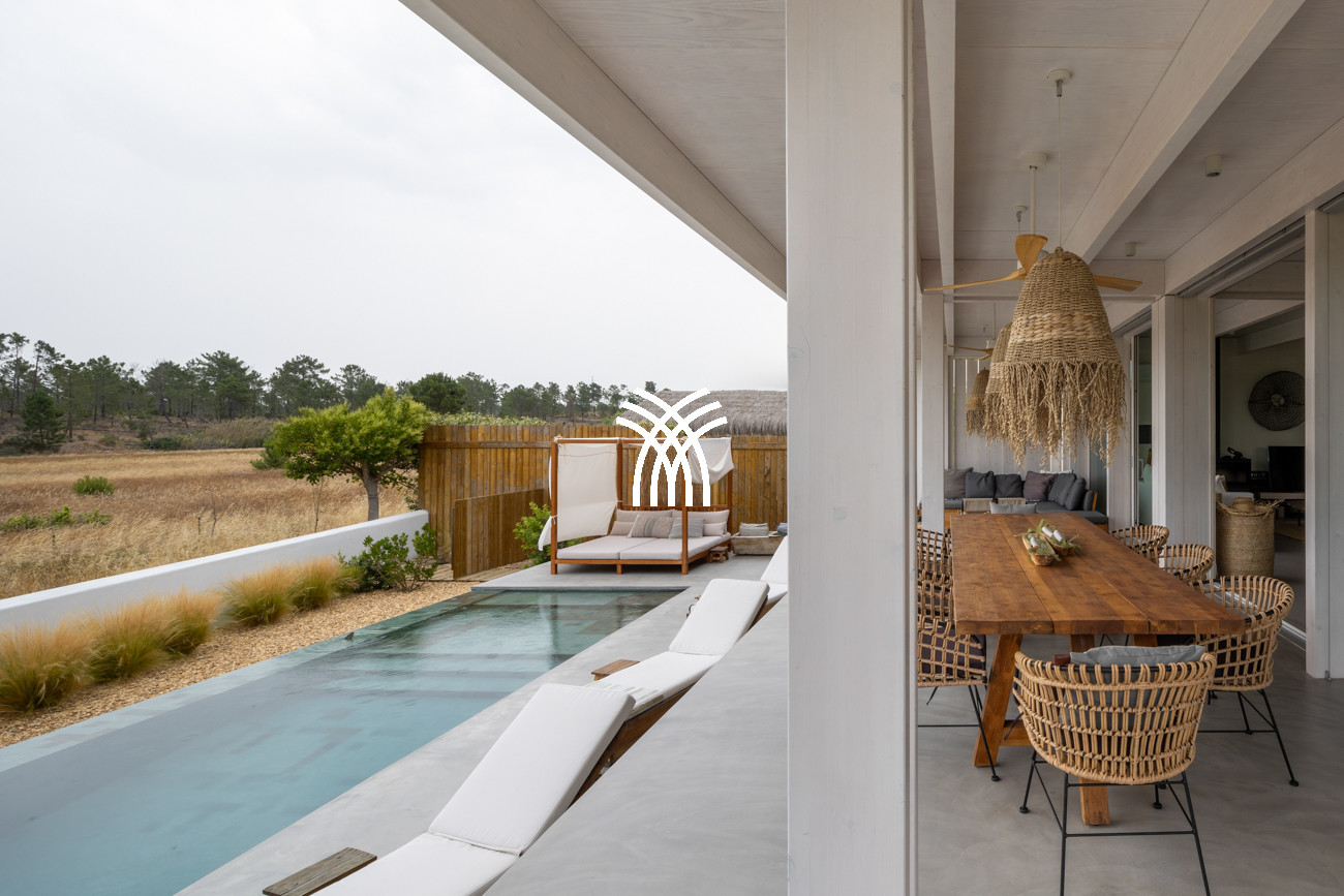 Outdoors, the villa reveals its true magic. Sunbeds surrounding the infinity pool offer an idyllic setting for slow, sunlit afternoons, while the shaded sunset area becomes a natural gathering point for long alfresco dinners and memorable evenings shared with loved ones. Nature trails winding through the landscape lead toward the sea, offering opportunities for peaceful walks and quiet exploration, where the spirit of Comporta reveals itself in its most authentic form.