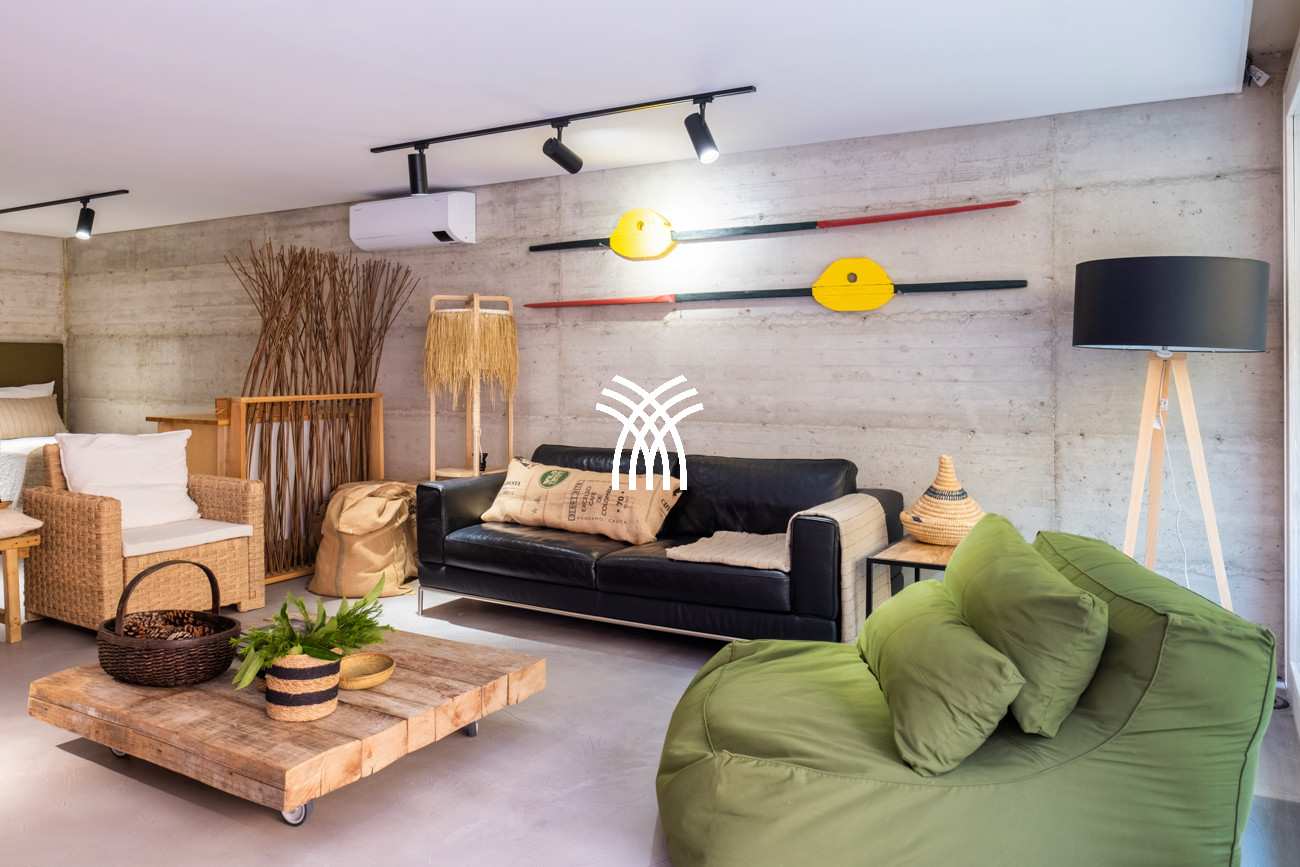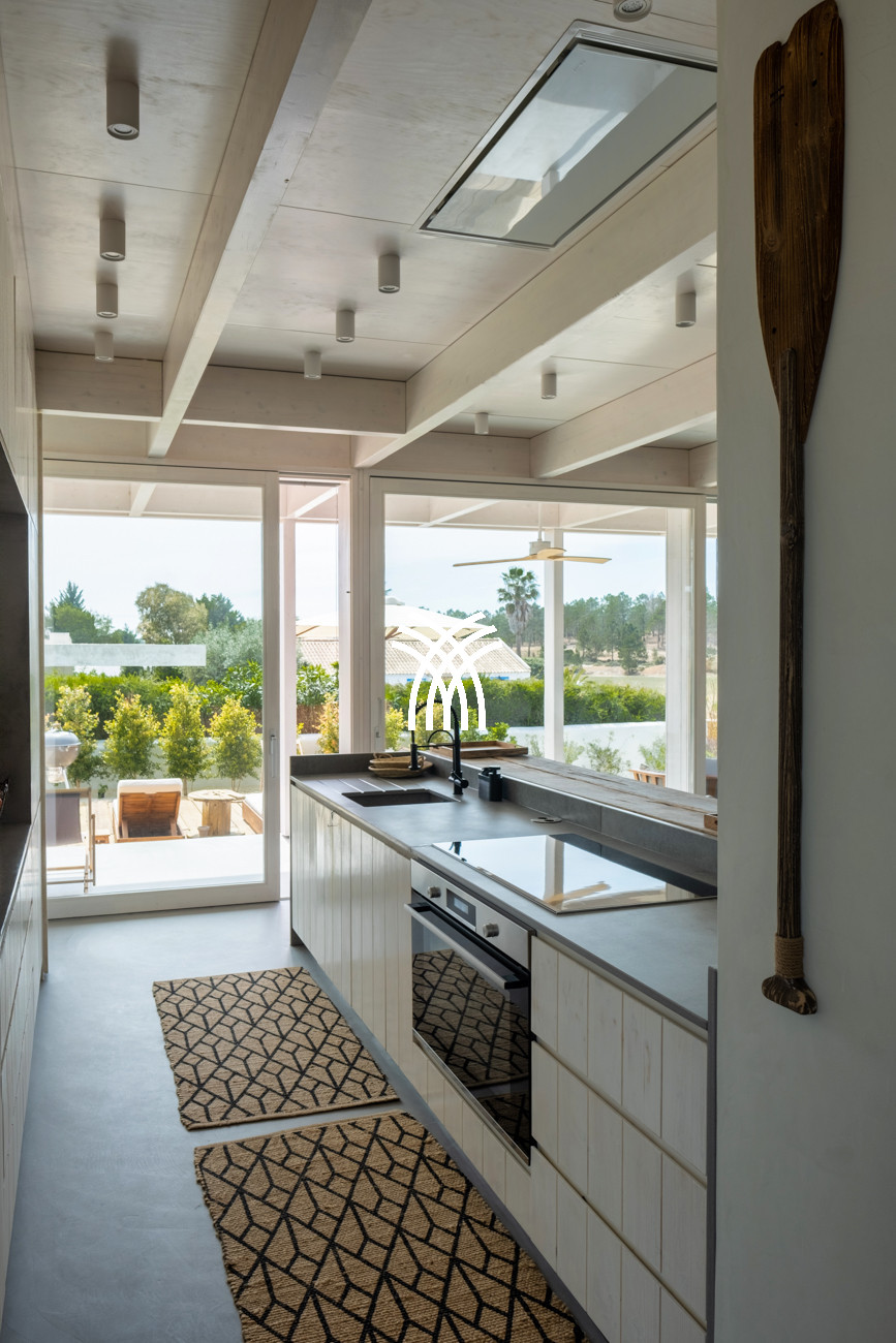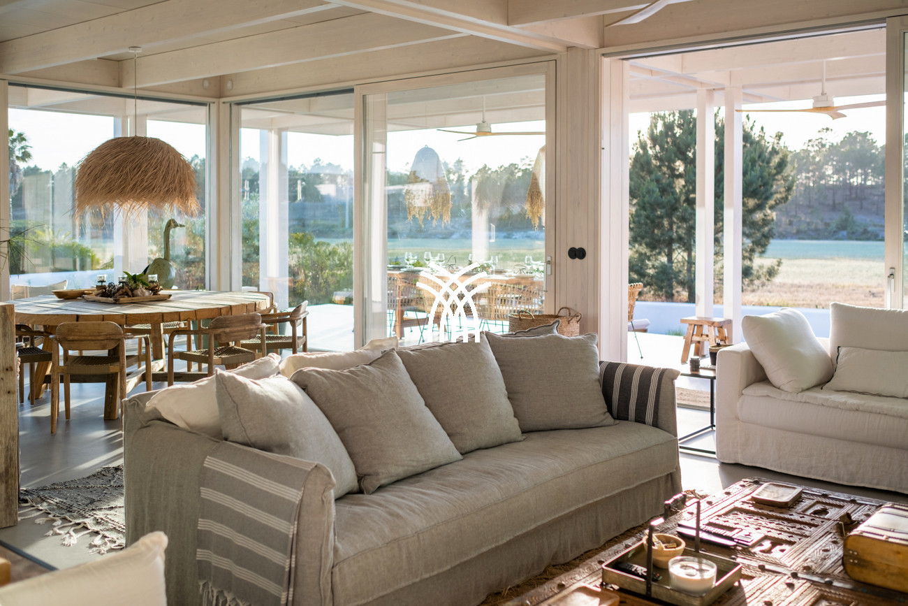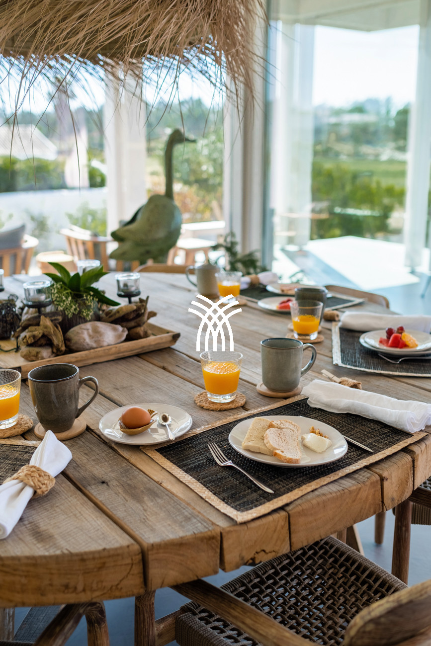 Barefoot mornings unfold across cool concrete floors, while subtle touches of vibrant color introduce warmth and artistic expression throughout the interiors. The spacious living and dining area flows effortlessly into a fully equipped open kitchen, forming a central space designed for connection, relaxation, and shared moments. From the living room, uninterrupted views extend across the garden and swimming pool toward the pine forest beyond, immersing guests in the tranquil rhythm of Comporta’s natural environment.