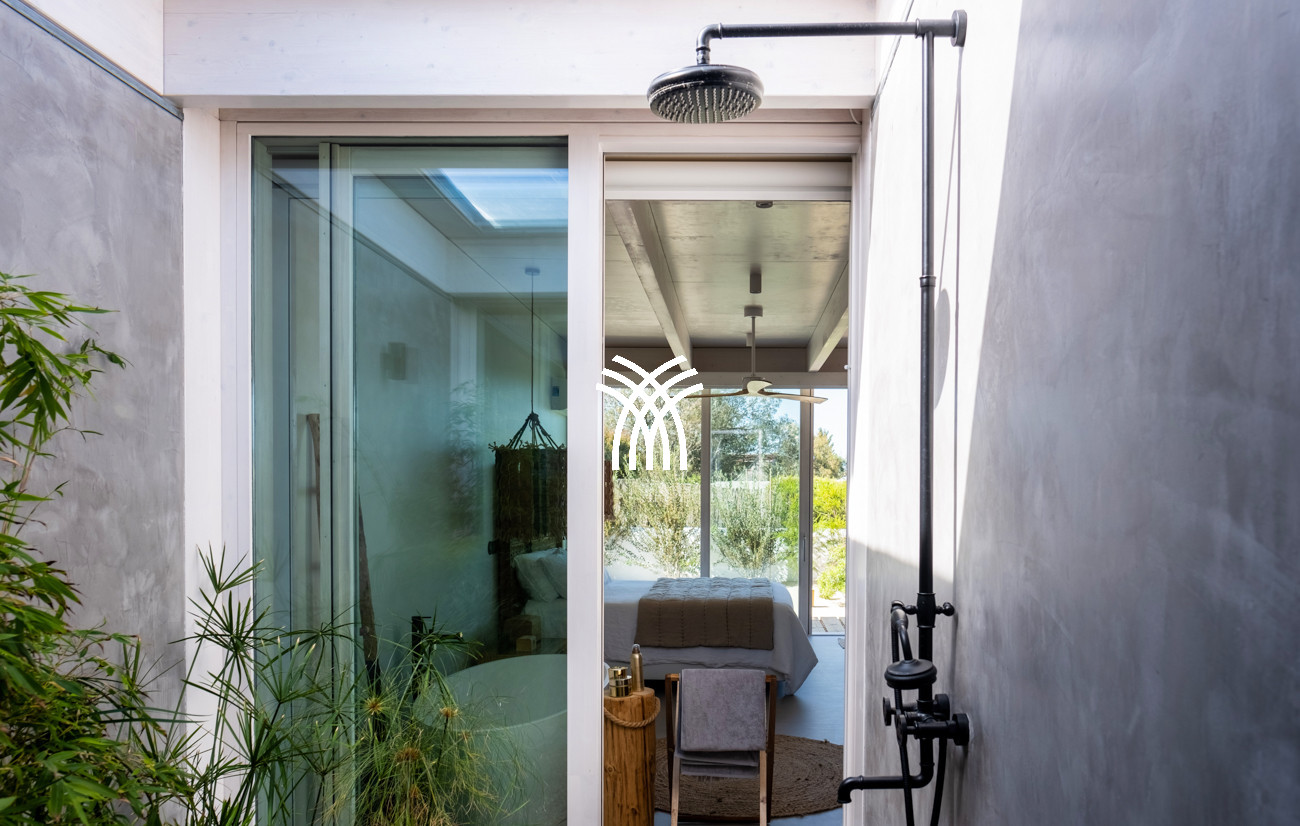 The villa unfolds across beautifully curated interiors featuring four thoughtfully designed bedrooms that balance privacy and comfort with understated sophistication. The open-concept living space flows effortlessly into a fully equipped American kitchen and a generous dining area for up to twelve guests, while expansive windows invite abundant natural light and open the home to the surrounding landscape, enhancing the sense of space and tranquility.