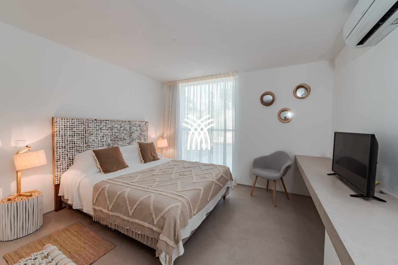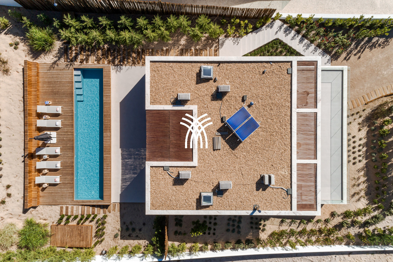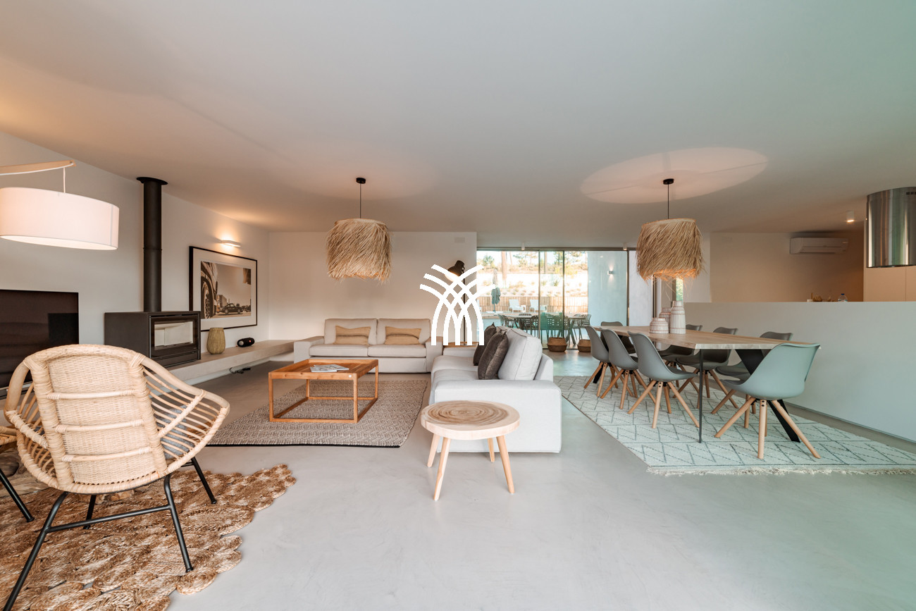 At the heart of the home, the open-plan living area brings together the living room, dining space, and fully equipped kitchen in a fluid composition designed for shared moments and relaxed elegance. This space extends naturally onto a generous 90-square-meter deck, partially shaded for al fresco dining, which leads to the inviting swimming pool and a distinctive 500-square-meter sand garden. Together, they form an idyllic indoor-outdoor environment where days unfold at an unhurried pace under the Comporta sun.