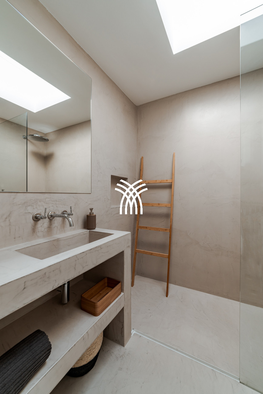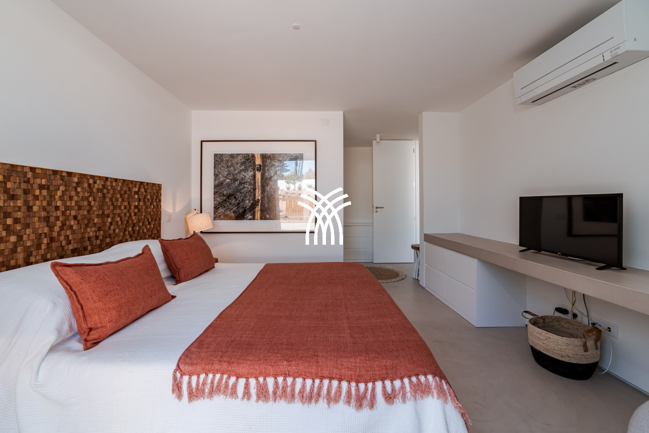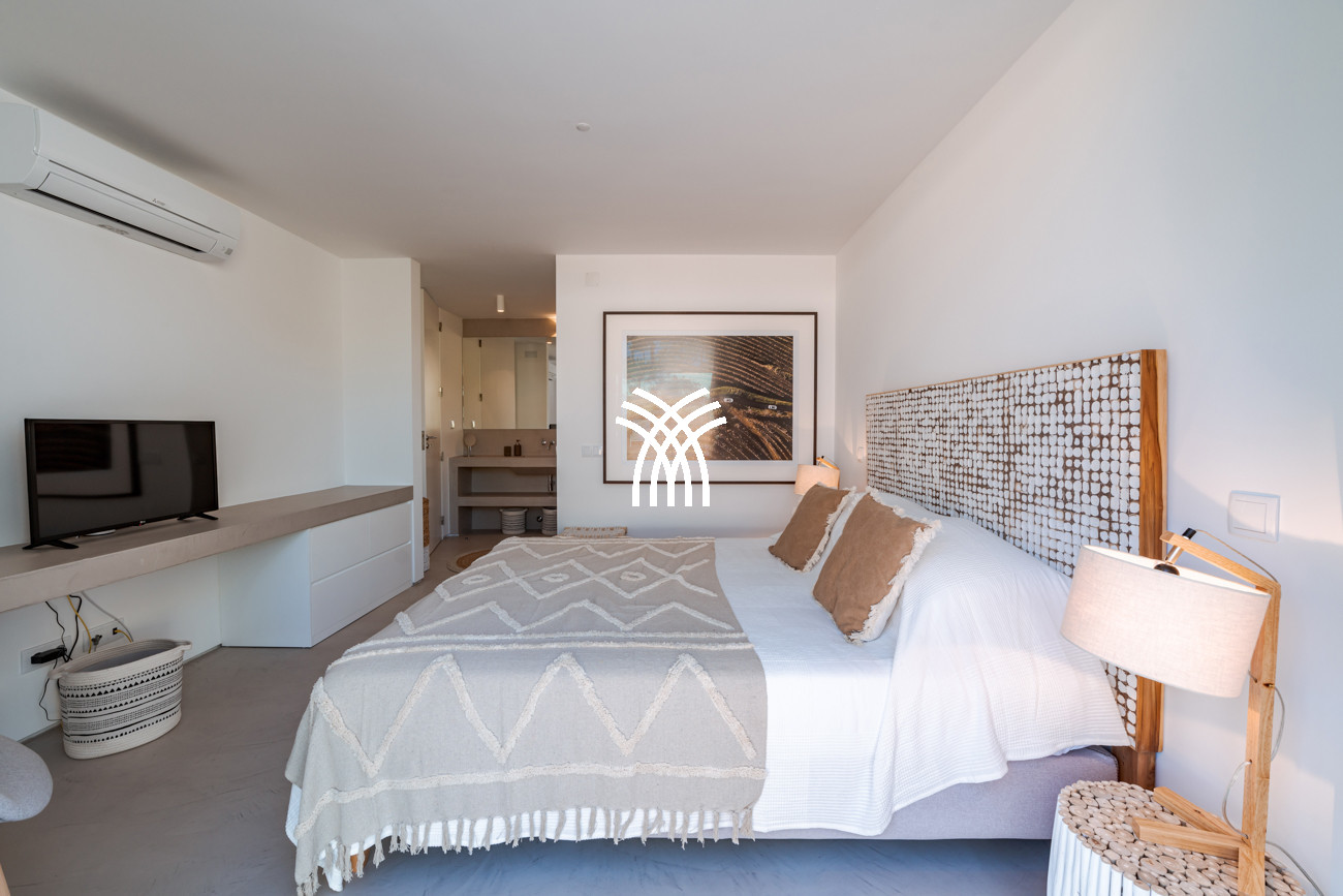 At the heart of the home, the open-plan living area brings together the living room, dining space, and fully equipped kitchen in a fluid composition designed for shared moments and relaxed elegance. This space extends naturally onto a generous 90-square-meter deck, partially shaded for al fresco dining, which leads to the inviting swimming pool and a distinctive 500-square-meter sand garden. Together, they form an idyllic indoor-outdoor environment where days unfold at an unhurried pace under the Comporta sun.