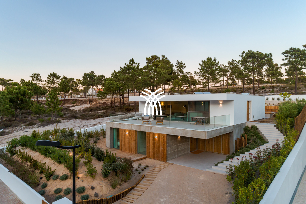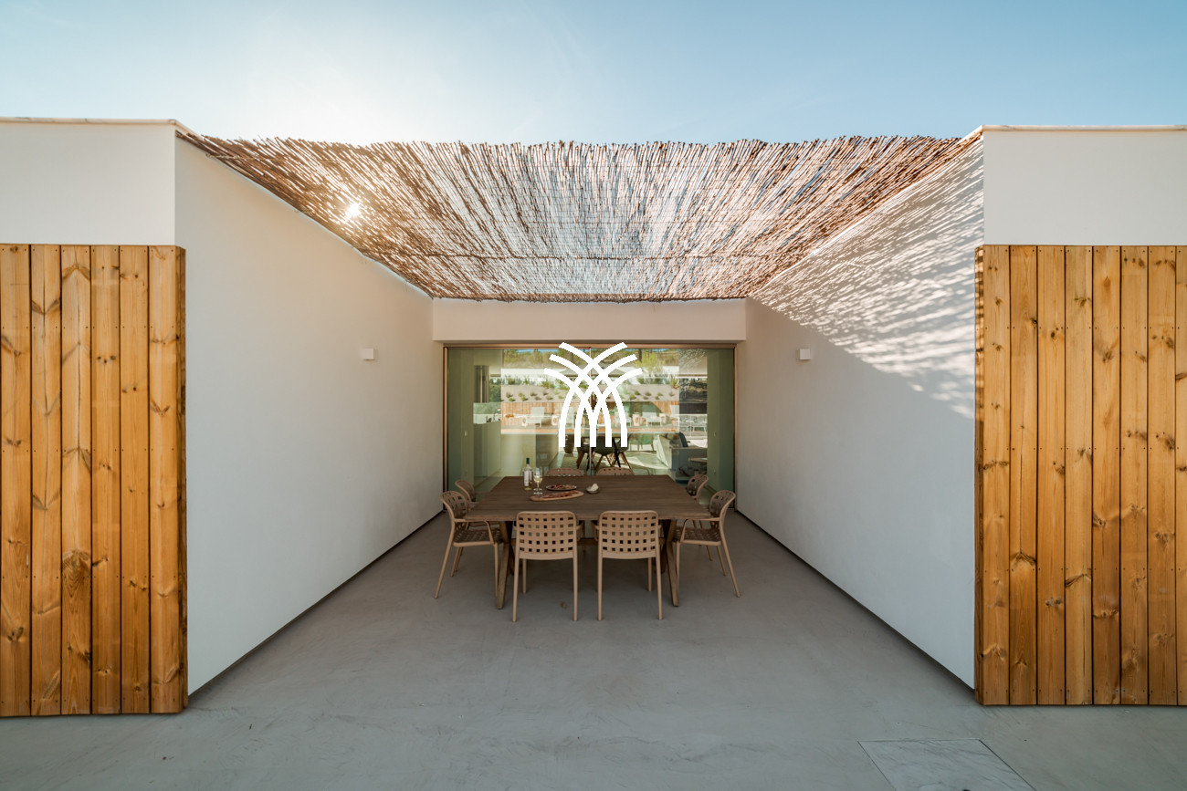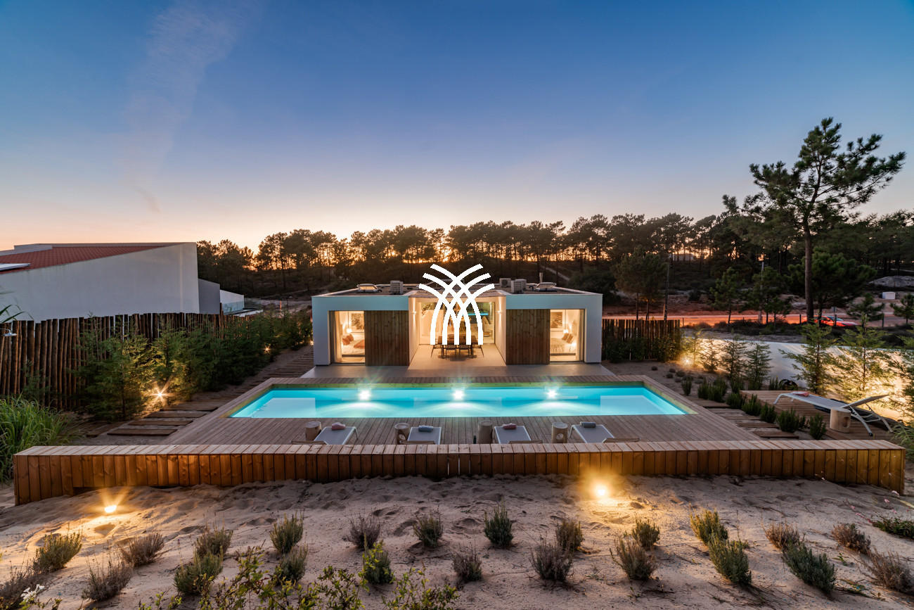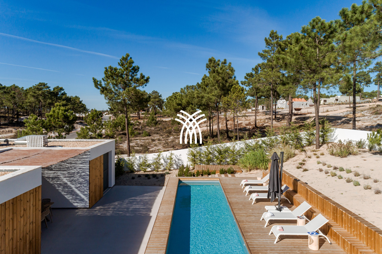 Set within lush greenery across an expansive 23-hectare estate, Villa Kimchi is a striking contemporary residence where architectural precision and natural beauty come together in perfect harmony. Defined by clean lines and elegant wooden shutters, this architect-designed home embodies understated modern charm while offering access to an infinity swimming pool shared with two other villas on the same vast property, creating an atmosphere of refined exclusivity that captures the spirit of a luxury villa rental Portugal and an authentic luxury villa rental Comporta.