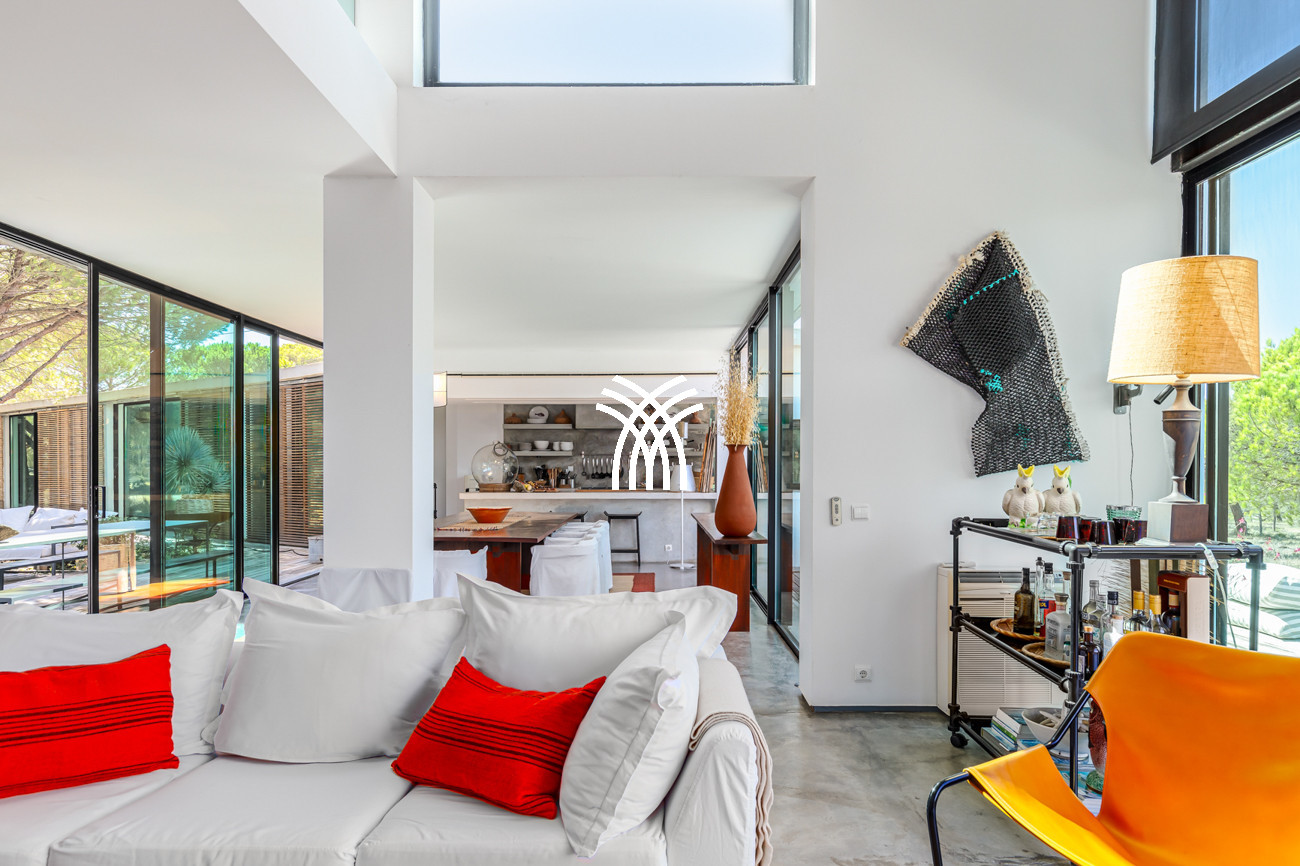 Set within lush greenery across an expansive 23-hectare estate, Villa Kimchi is a striking contemporary residence where architectural precision and natural beauty come together in perfect harmony. Defined by clean lines and elegant wooden shutters, this architect-designed home embodies understated modern charm while offering access to an infinity swimming pool shared with two other villas on the same vast property, creating an atmosphere of refined exclusivity that captures the spirit of a luxury villa rental Portugal and an authentic luxury villa rental Comporta.